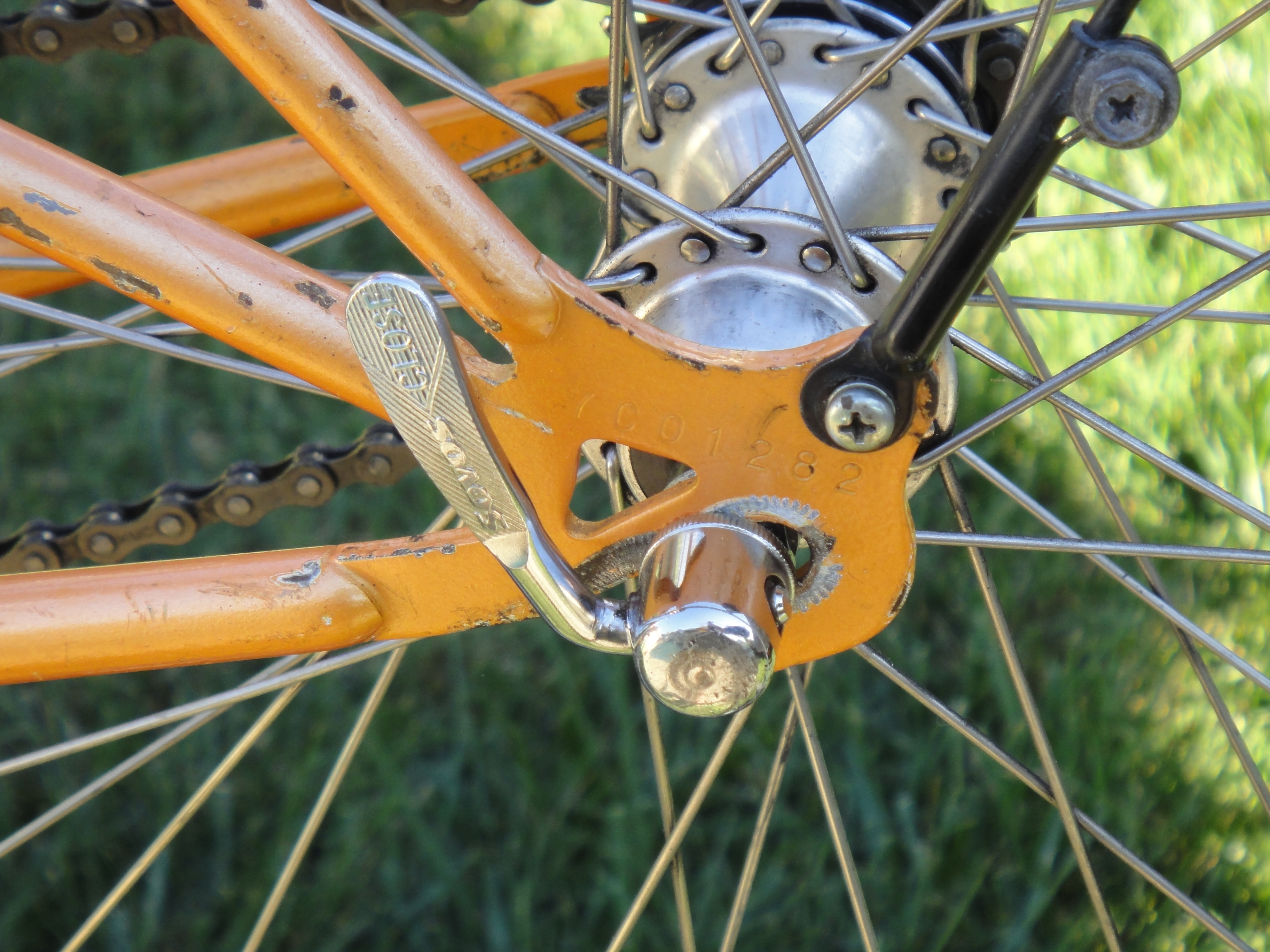 Frame and most components are 1977 Schwinn Le Tour II mixte from Japan. Bontrager Sport seat, 27×1 1/4 wheel in front with Kenda tire; rear is Weinmann with 16-tooth Shimano freewheel and worn Bontrager 700cx35 tire.