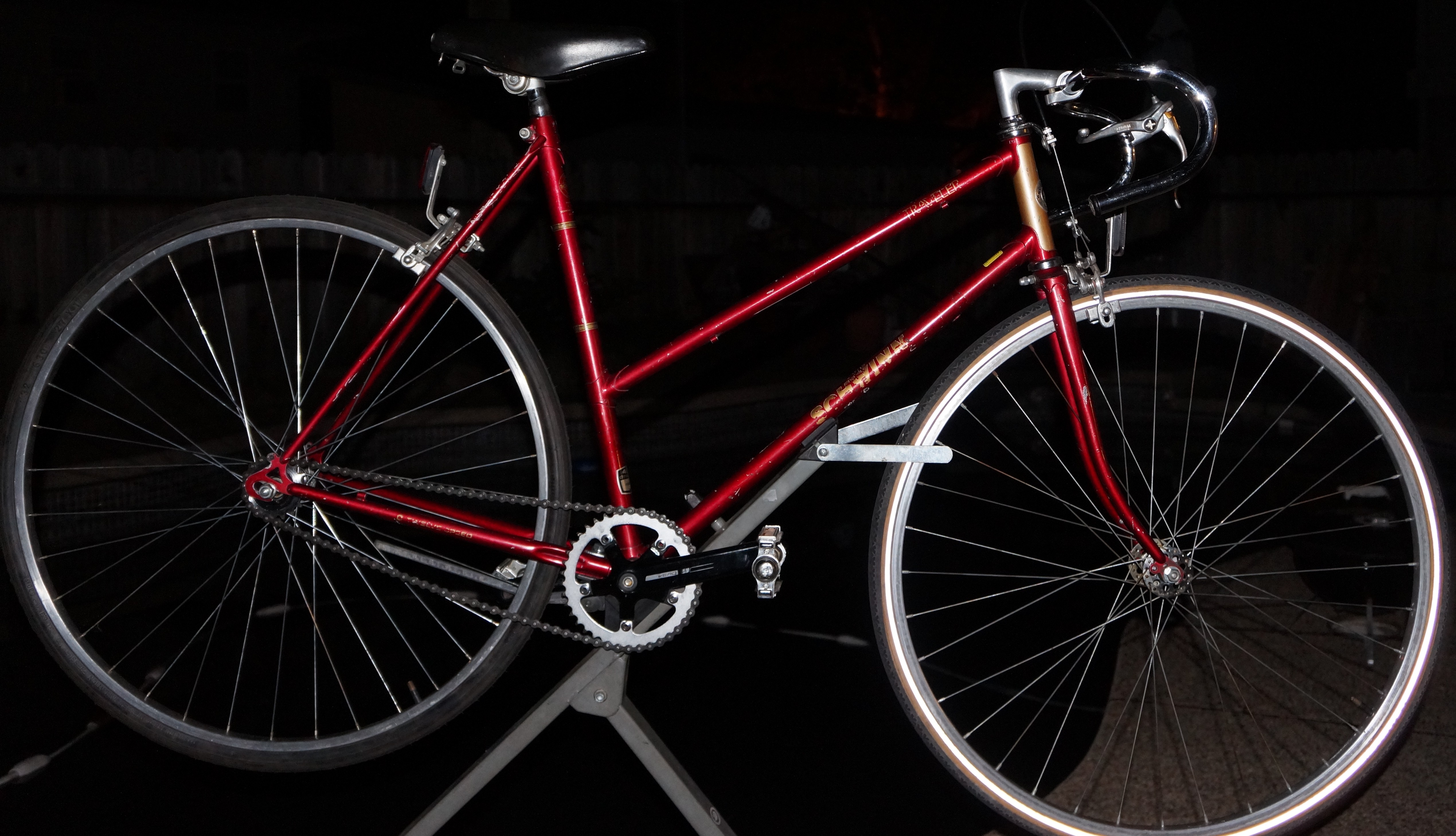 I bought this Schwinn Traveler at Denio’s flea market for $55. It was built in January, 1983, at the Giant factory in Taiwan. The wheels are alloy and the frame is 4130 chromoly steel with nicely long, horizontal drop-outs, so important for easy fixie/SS wheel alignment.
