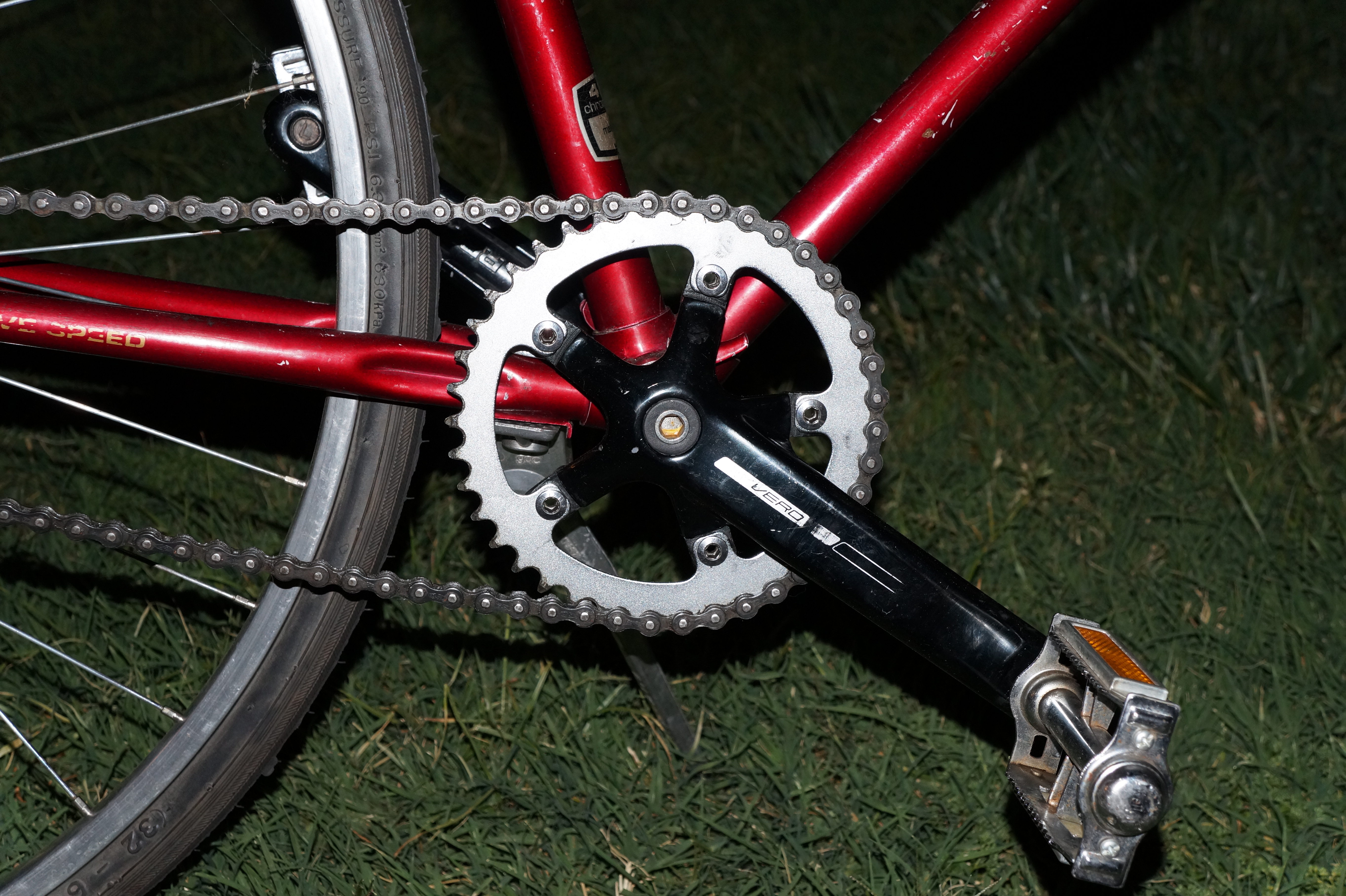 I got black anodized Vero 171.5mm cranks and spider from my parts bin and installed a 40-tooth chain-ring. The parts bin also supplied the chain while I reused the Schwinn seat and post, pedals, quill-stem, handlebar and brake levers.