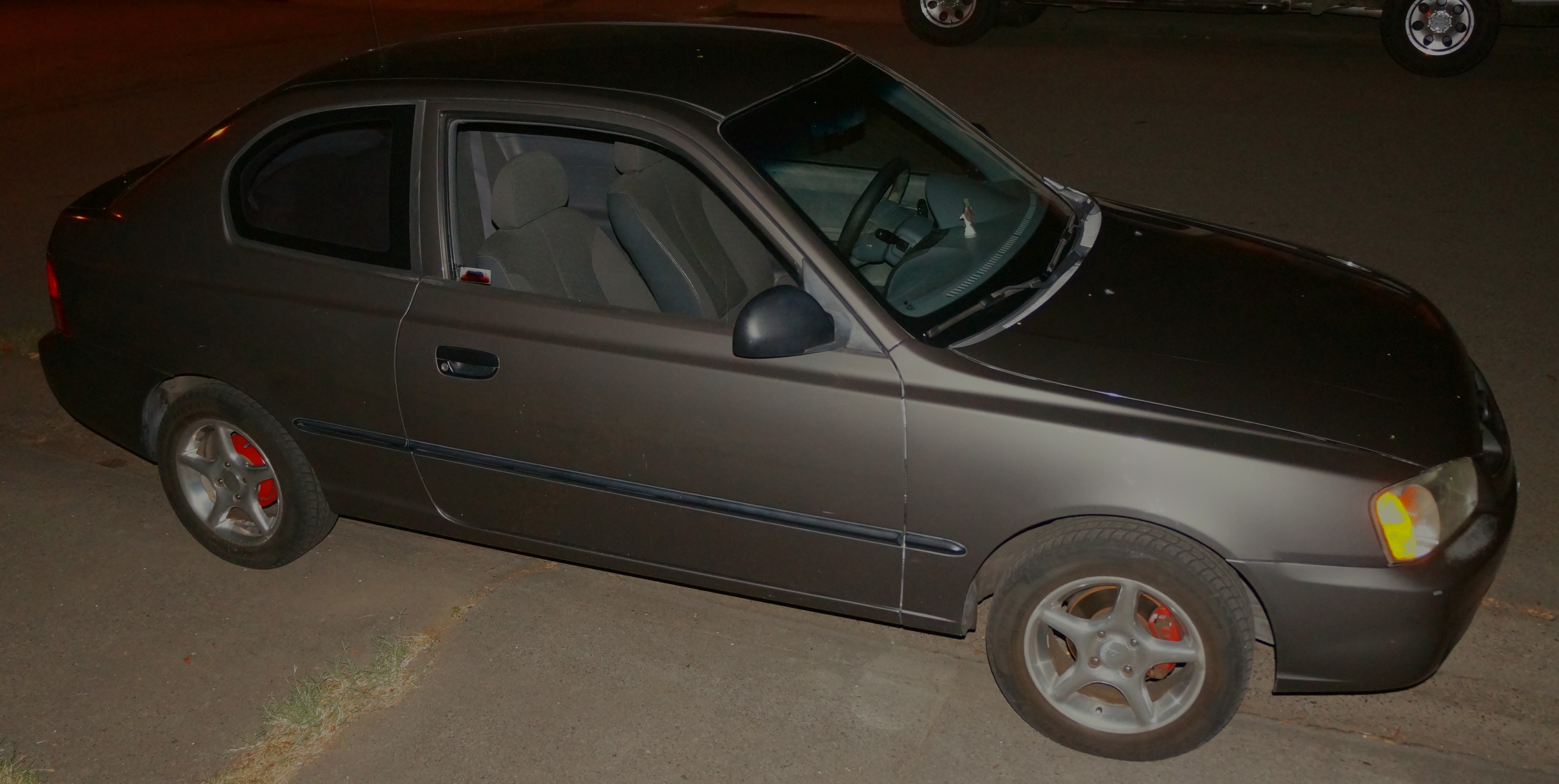 2002 Hyundai Accent, one-owner with only 95K miles. I prefer automatic transmissions because they seem to last longer than manual ones, but this tiny Korean car has a 5-speed stick so I’m trying to remember to push in the clutch and shift the gears.