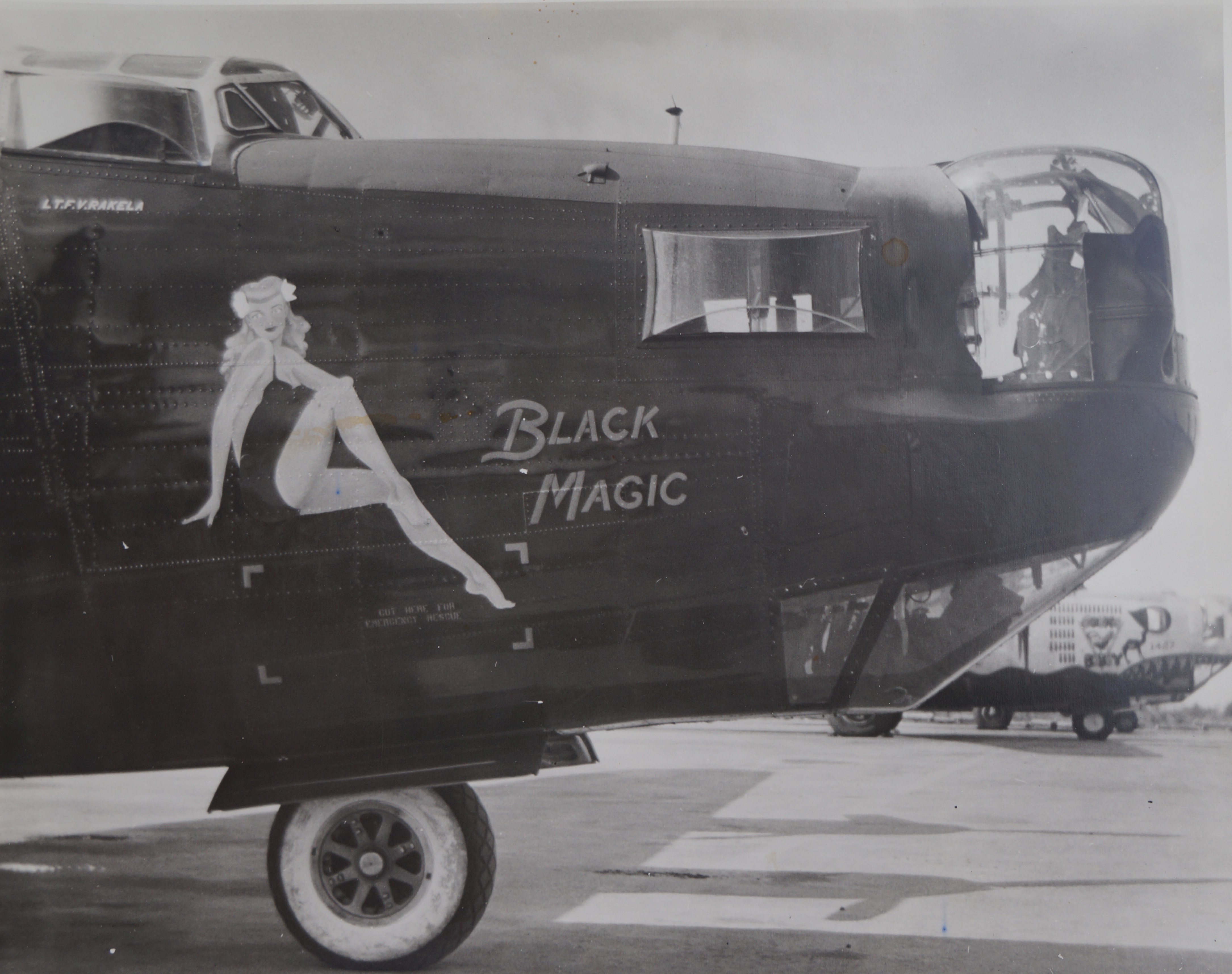 Black Magic is black indeed with all black camo, white side-wall tires. Marked Lt. F. V. Rakela. Note veteran B-24 behind with wavy belly camo, shark’s mouth.