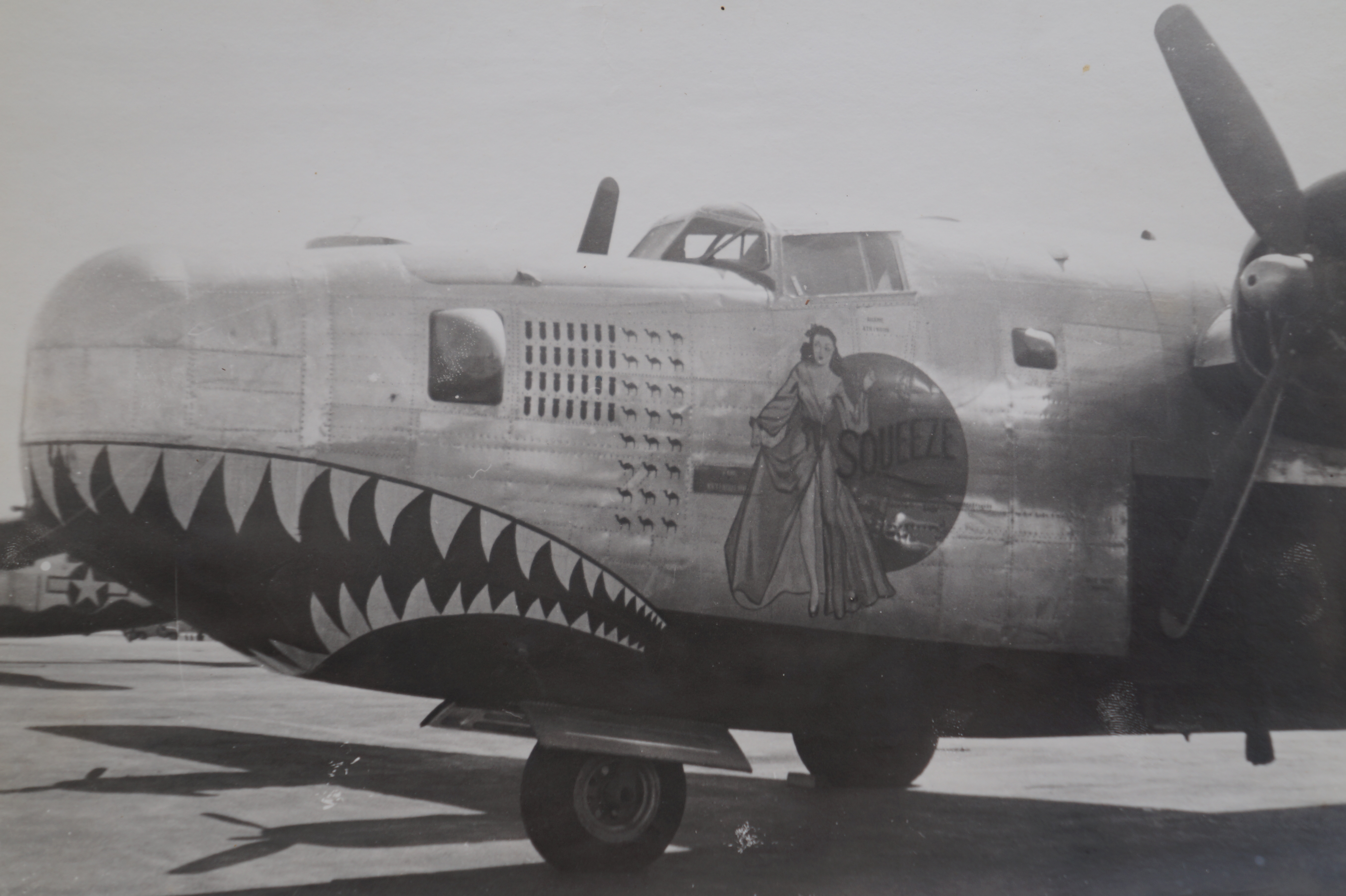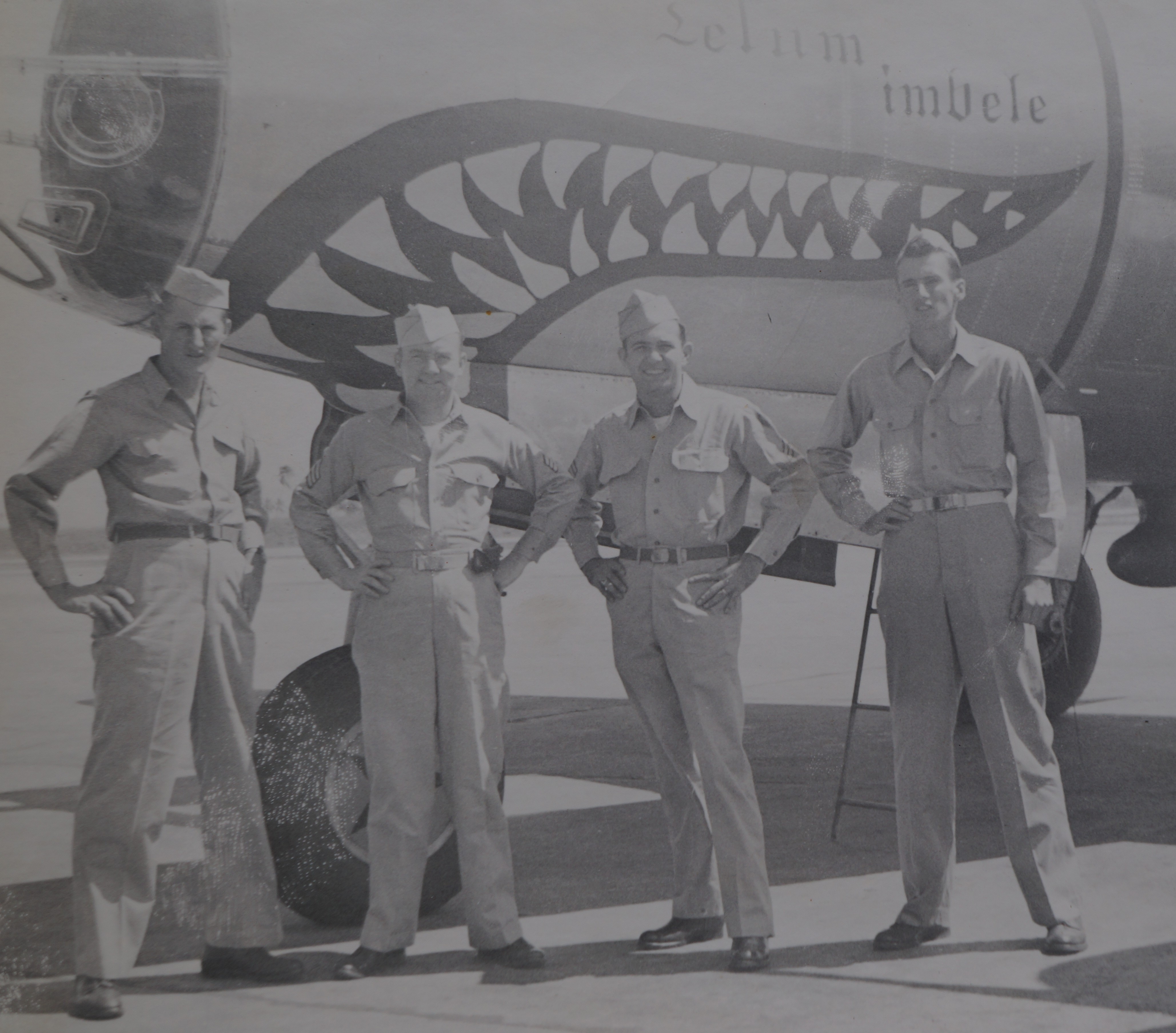 Selum Imvele, whatever that means, is a B-26 Martin Marauder with shark’s mouth. Buck Sgt. Edward Whalen is 2nd from left with sunglass case on belt and three stripes.