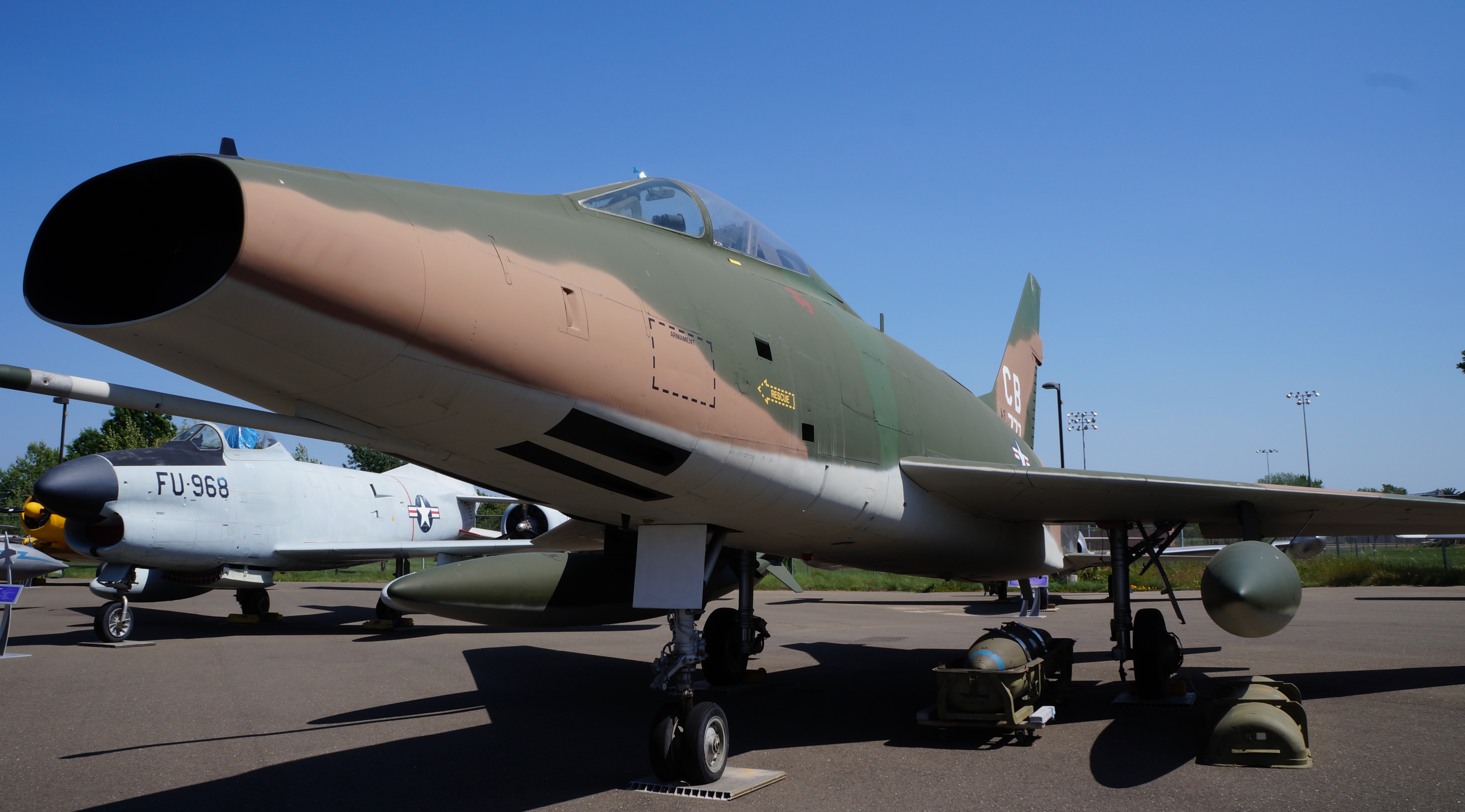 F-100 Super Sabre, The Hun, with F-86D all-weather Dog Sabre behind. For a few seconds you might think the Mig-17 was a Hun joining formation with you.