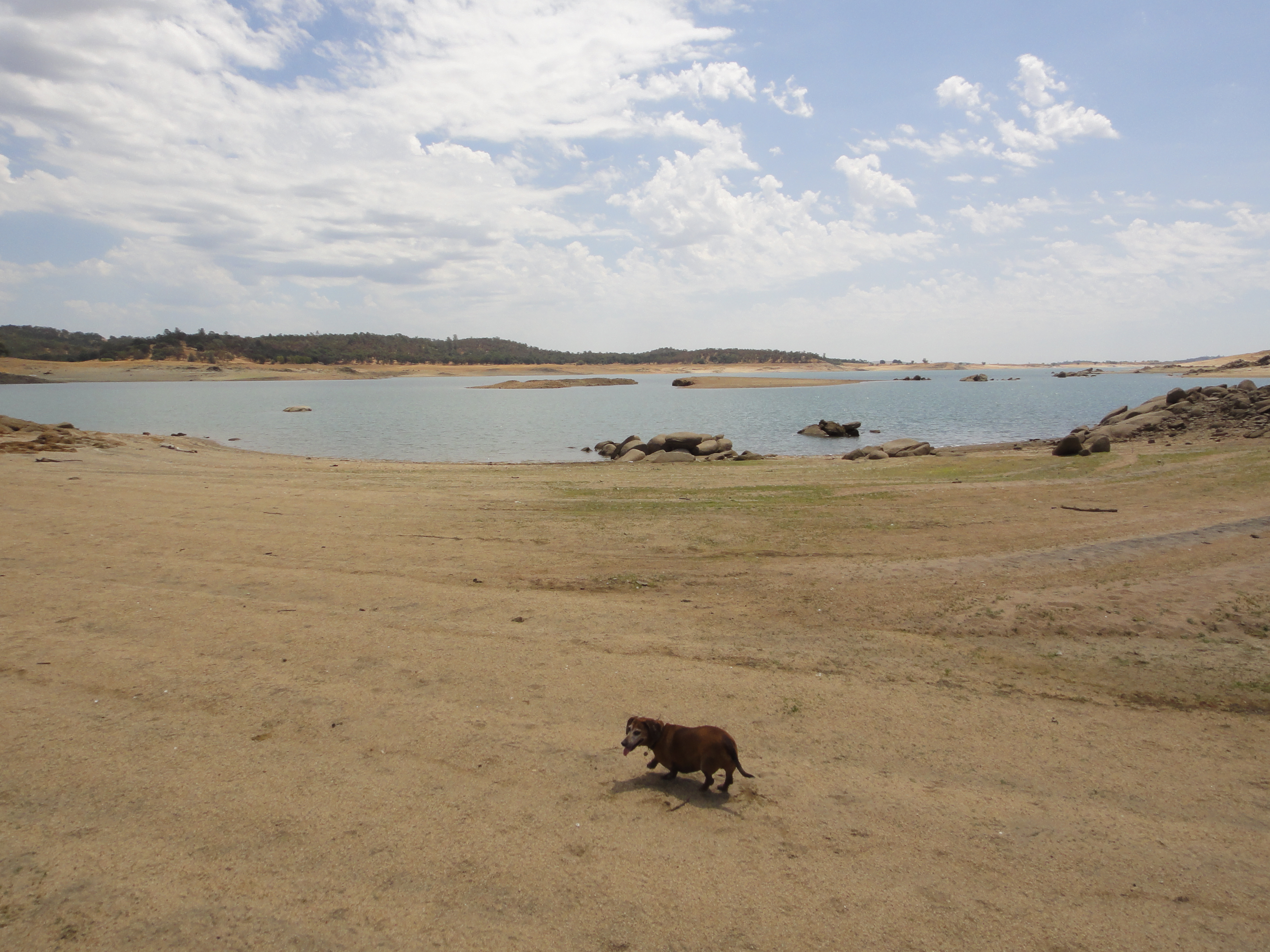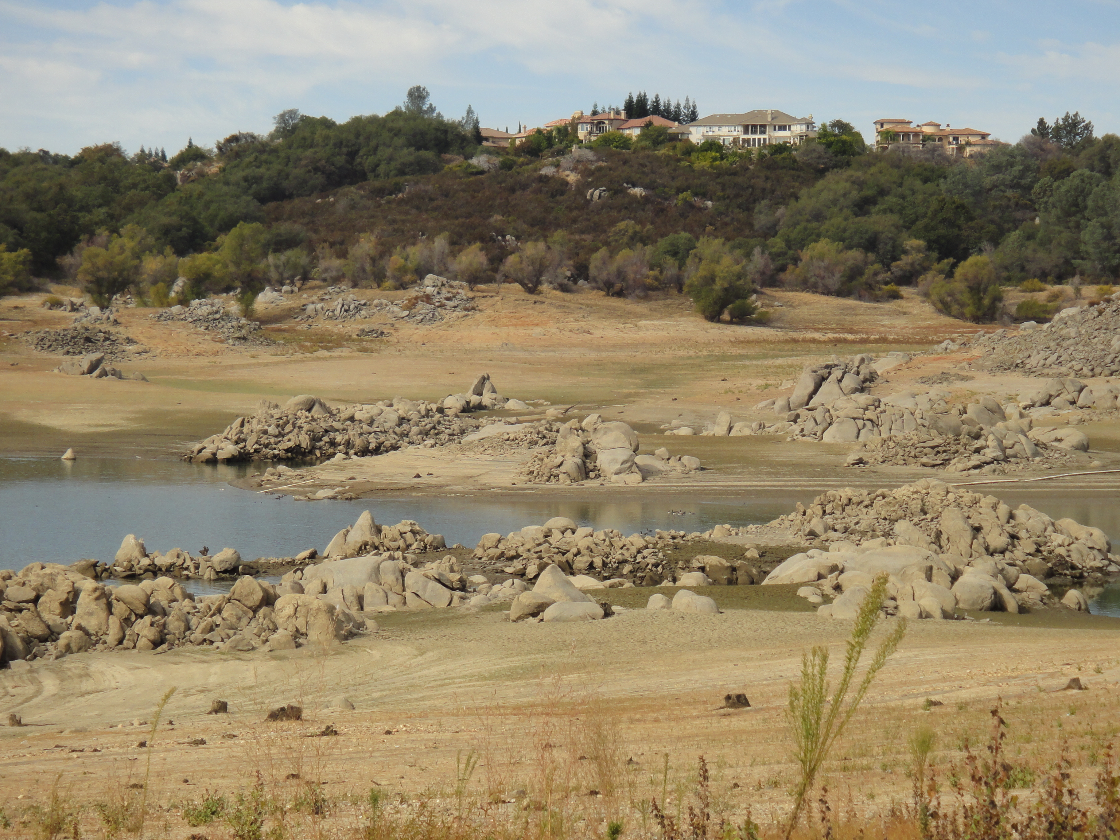 These rocks have been submerged for a long time. If I were a fisherman I’d get GPS landmarks of the rockpiles for when the water returns. I pick up old lures and cans with pop-tops all the time. And faded Olympia beer cans. There are still fish here now but not nearly as many as when rain comes to the Great Valley (and to our little local foothills) and snow to the mountains.