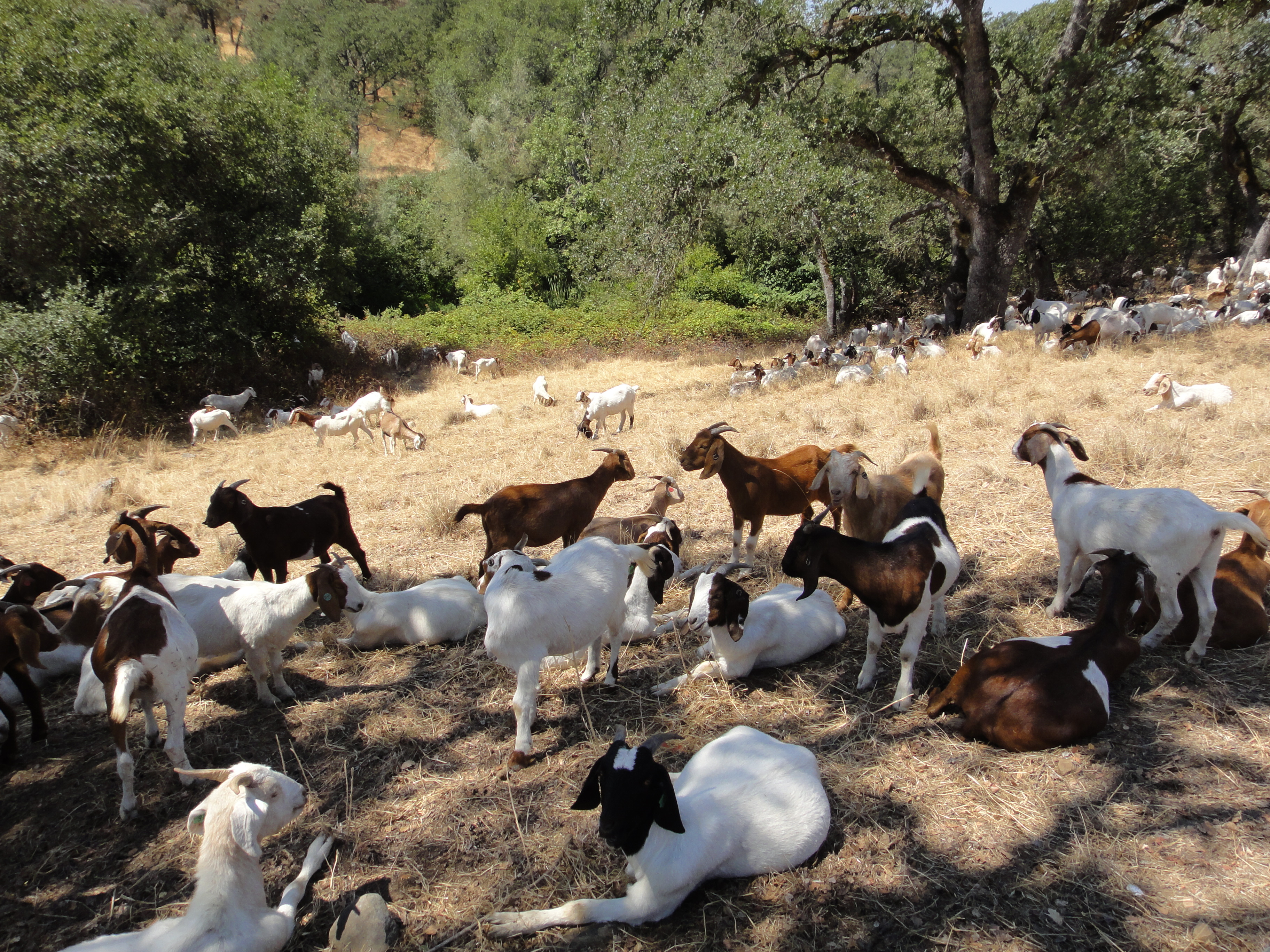 Like the pictures above this has a ‘Holy Land’ feeling. Goats are used by the City of Roseville for scrub control and fire prevention here on Dry Creek. They do a great job, herded by two dogs, guarded by two others of another breed, and tended by shepherds (Basques?) with a trailer (caravan), porta-potty, solar power and electric goat fences. The beasts leave little behind except dry pellets with a not-unpleasant smell which degrade with the rains into fertilizer.