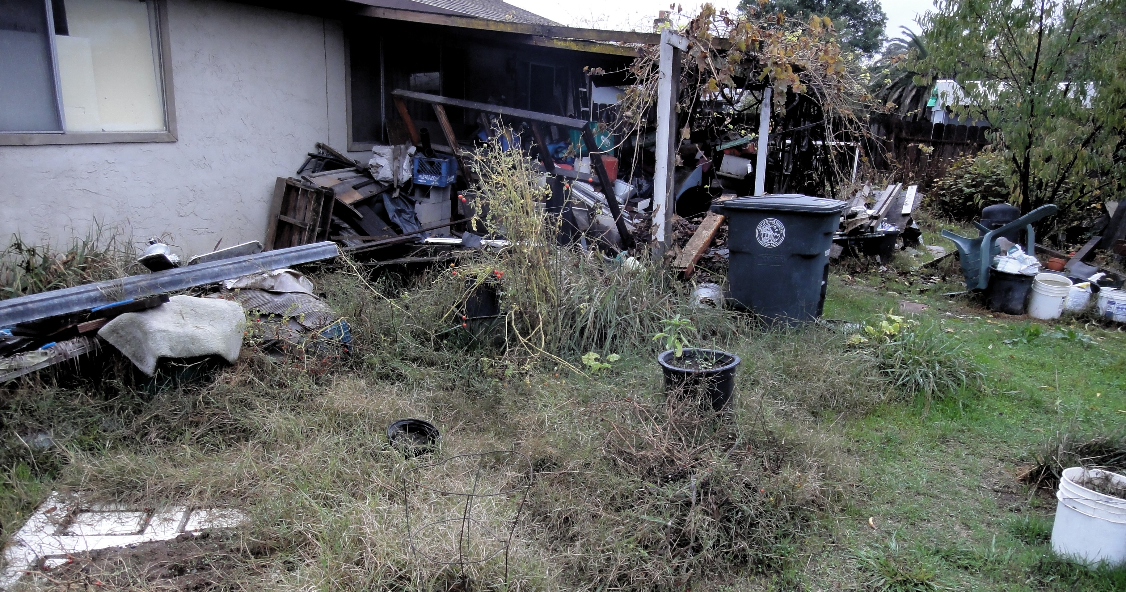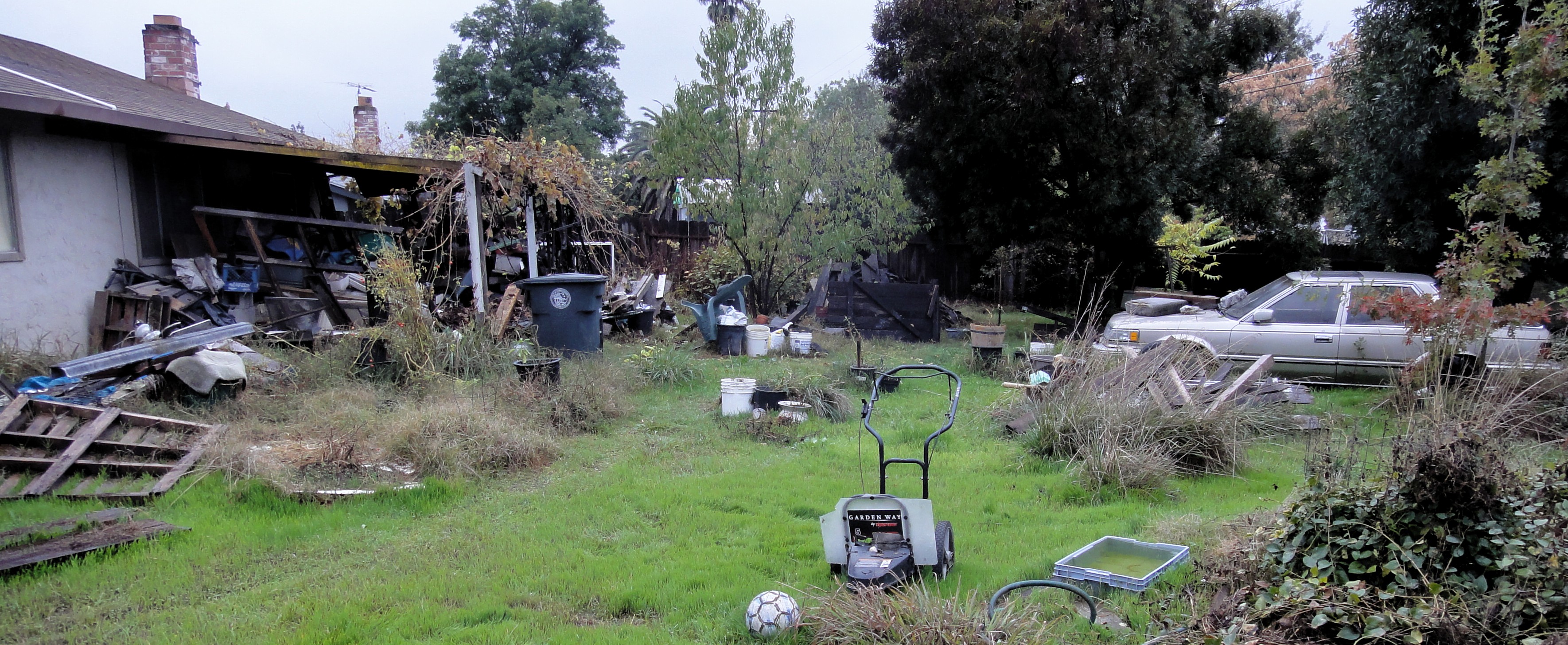 He had the city turn off his water to save money; he collects the meager rainfall to drink and for watering his vegetables. The city refused to cut off his garbage service but his trash can is little used. The back yard is also stuffed with refuse. He has a half-dozen broken cars, all decayed and useless, some with trees growing through them.