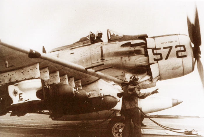 Just to show such hijinks happened in other wars, here is a American A-1H Skyraider (SPAD or Sandy) in October, 1965, preparing to be shot off the deck of the USS Midway during the Vietnam War.