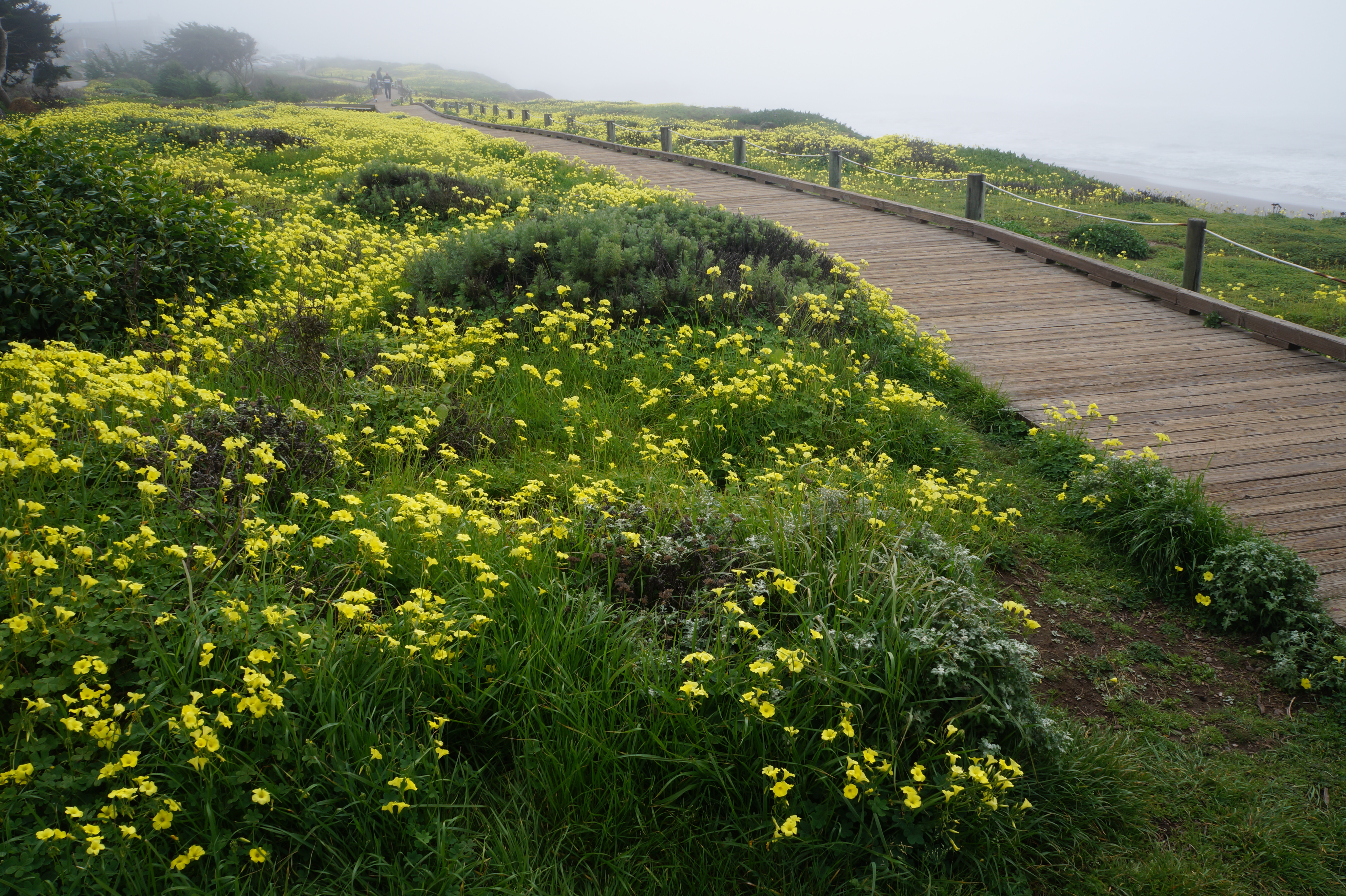 Refreshed and finally washed of desert soil, I motored off down the slowly greening hwy 58 until soon, but not very soon, I reached the sea south of the lovely village of Cambria ...and the sea and the sea crimson sometimes like fire and the glorious sunsets and the figtrees in the Alameda gardens yes… But in my case it was fog. Which was glorious after DV, but still, fog.