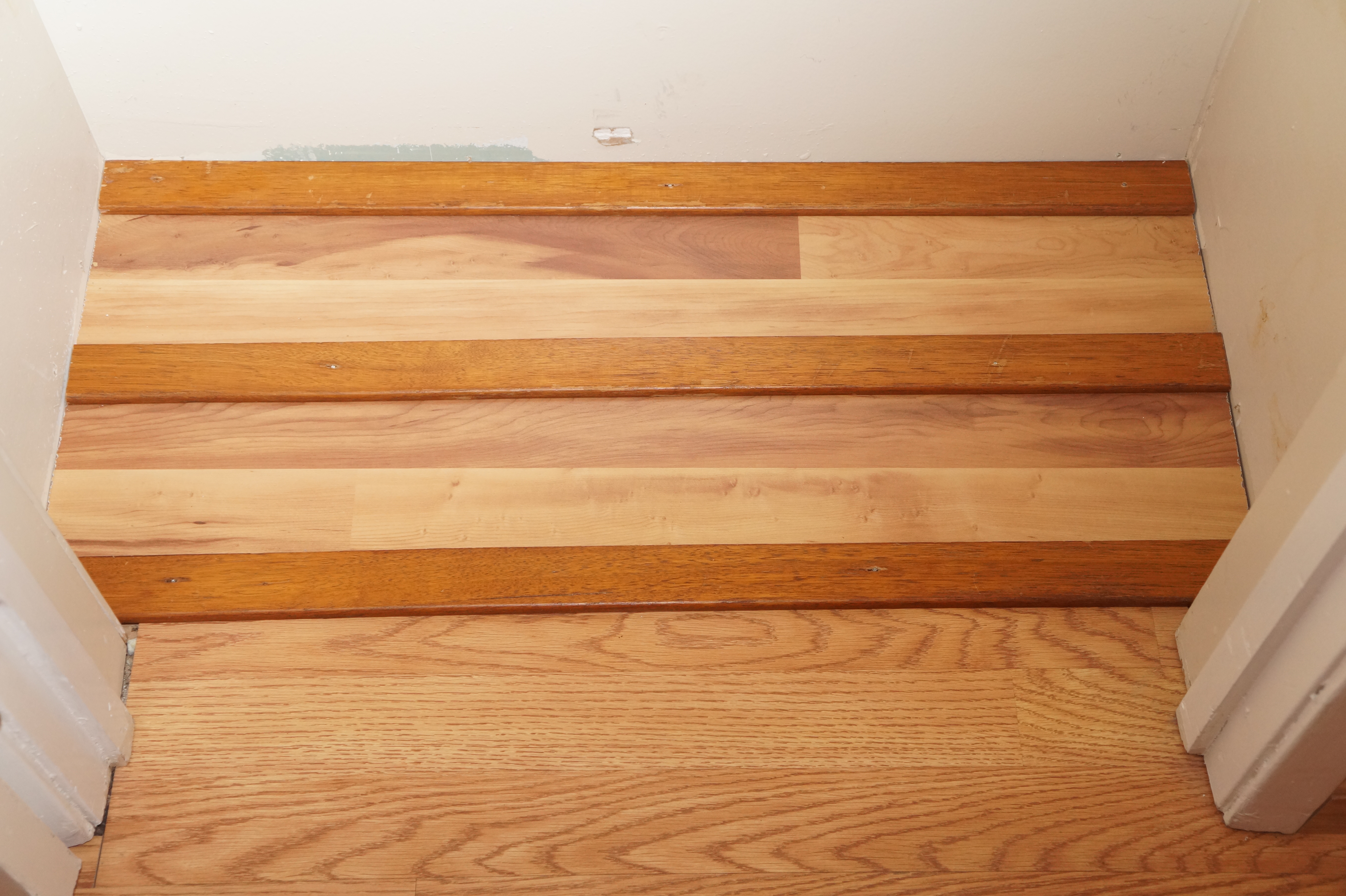 The big-box store ‘associates’ were very good at figuring the number of bundles and trim to buy and I ended up with only enough off-cuts to floor the foyer closet and the linen closet. They figured the trim board length correctly too.
