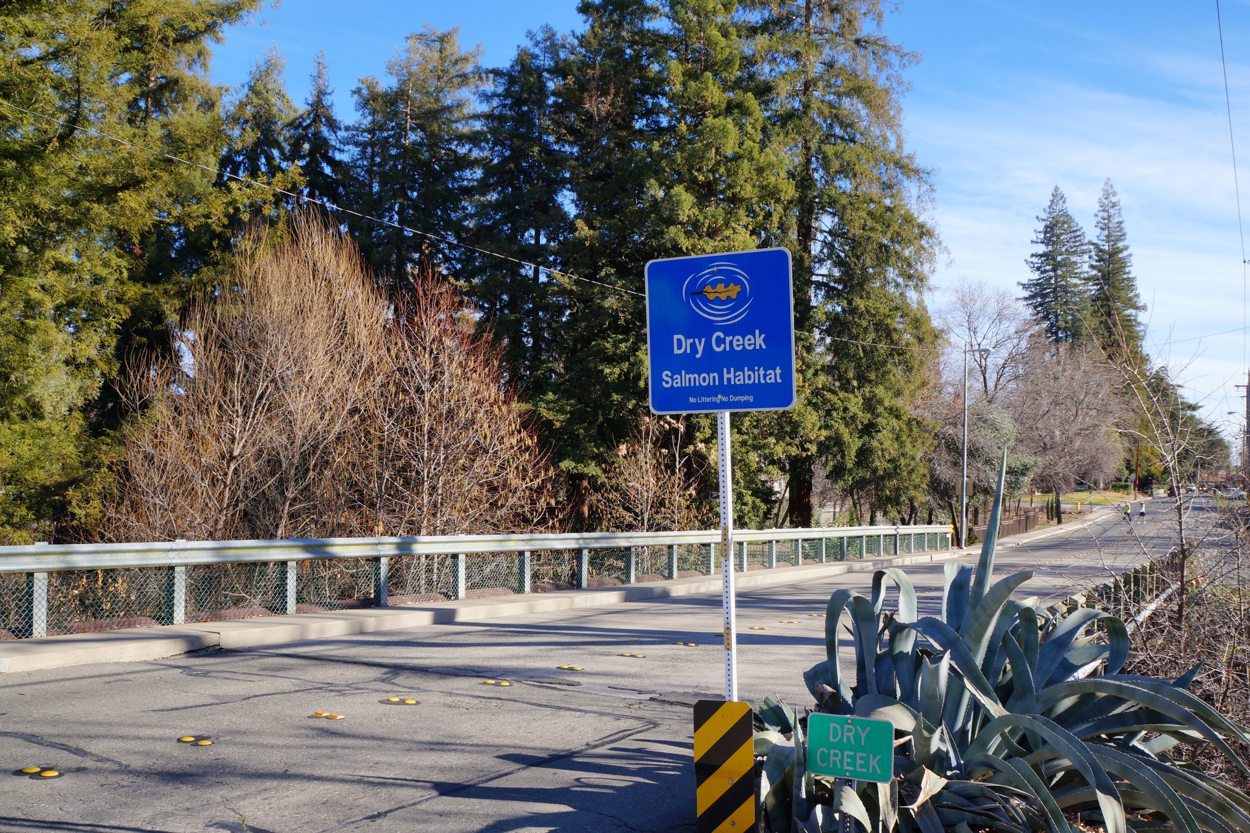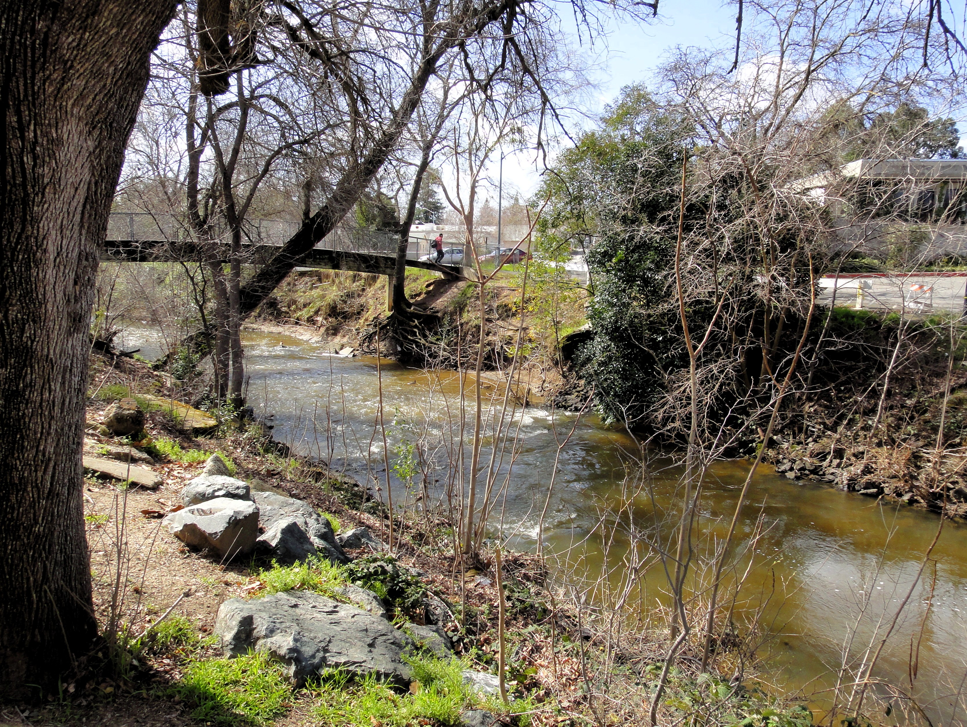 The footbridge below no longer exists. It formerly connected the library parking lot with Royer Park across Dry Creek but it grew wobbly and had to be demolished. It was a great place to feed ducks and its arch resonated with the Crooked Bridge.