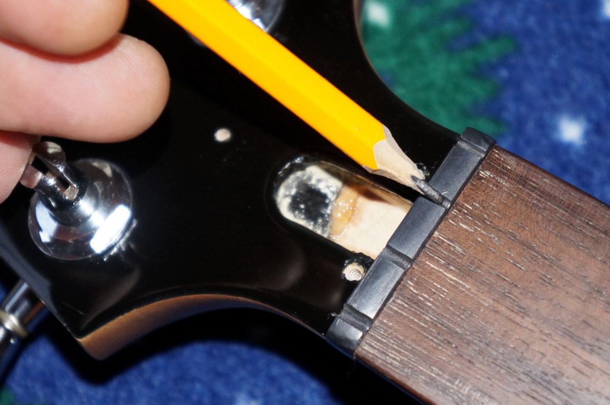 blu_ibby-pencl Published January 28, 2018 at 3819 × 2537 in Ibanez GIO Electric Bass Fix-up and Re-string ← Previous Next → Before installing strings rub some pencil graphite in nut grooves for lubrication.
