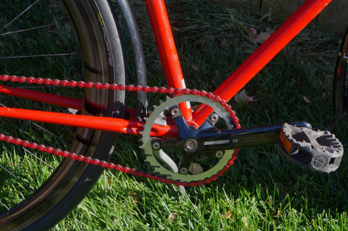 DSC07065 Published October 29, 2019 at 5447 × 3628 in Vintage Peugeot Restomod ← Previous Next → To improve a good chain-line I installed the chain-ring on the inside of the crank spider. This required installing the chain-ring bolts in reverse.