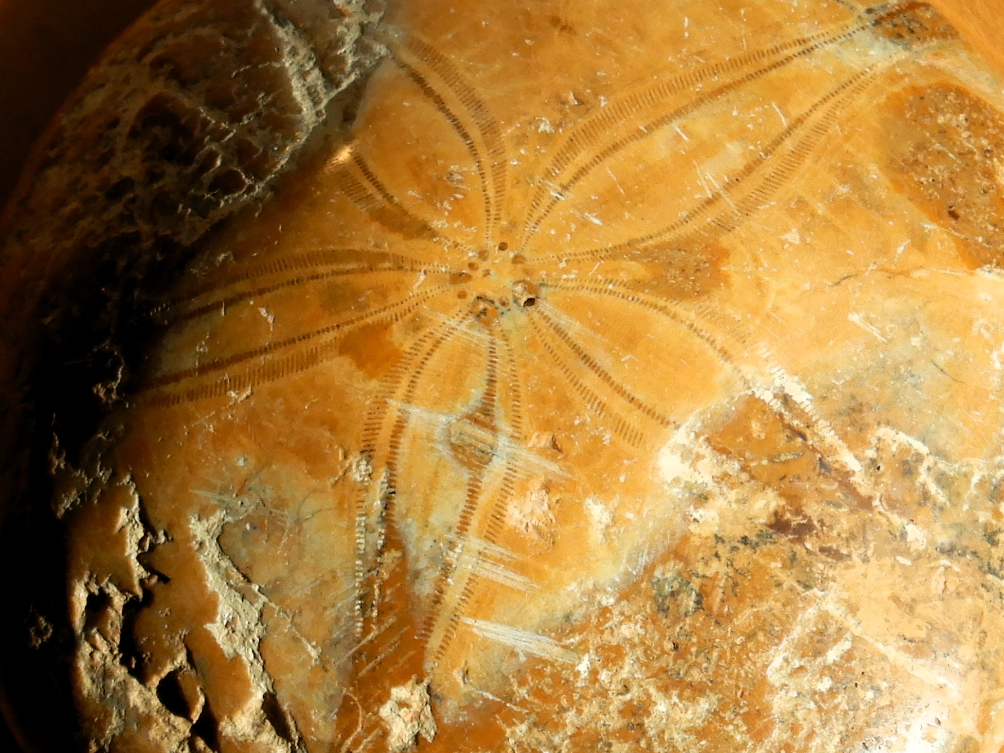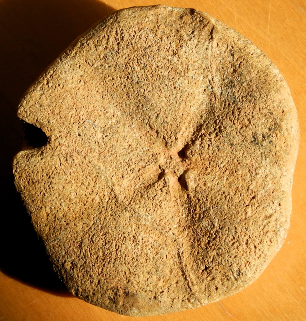 Sand dollars are species of flat, burrowing sea urchins belonging to the order Clypeasteroida. In life they are purple and fuzzy with feeder feet on top directing tiny food bits into its mouth where they are chewed for fifteen minutes sometimes.