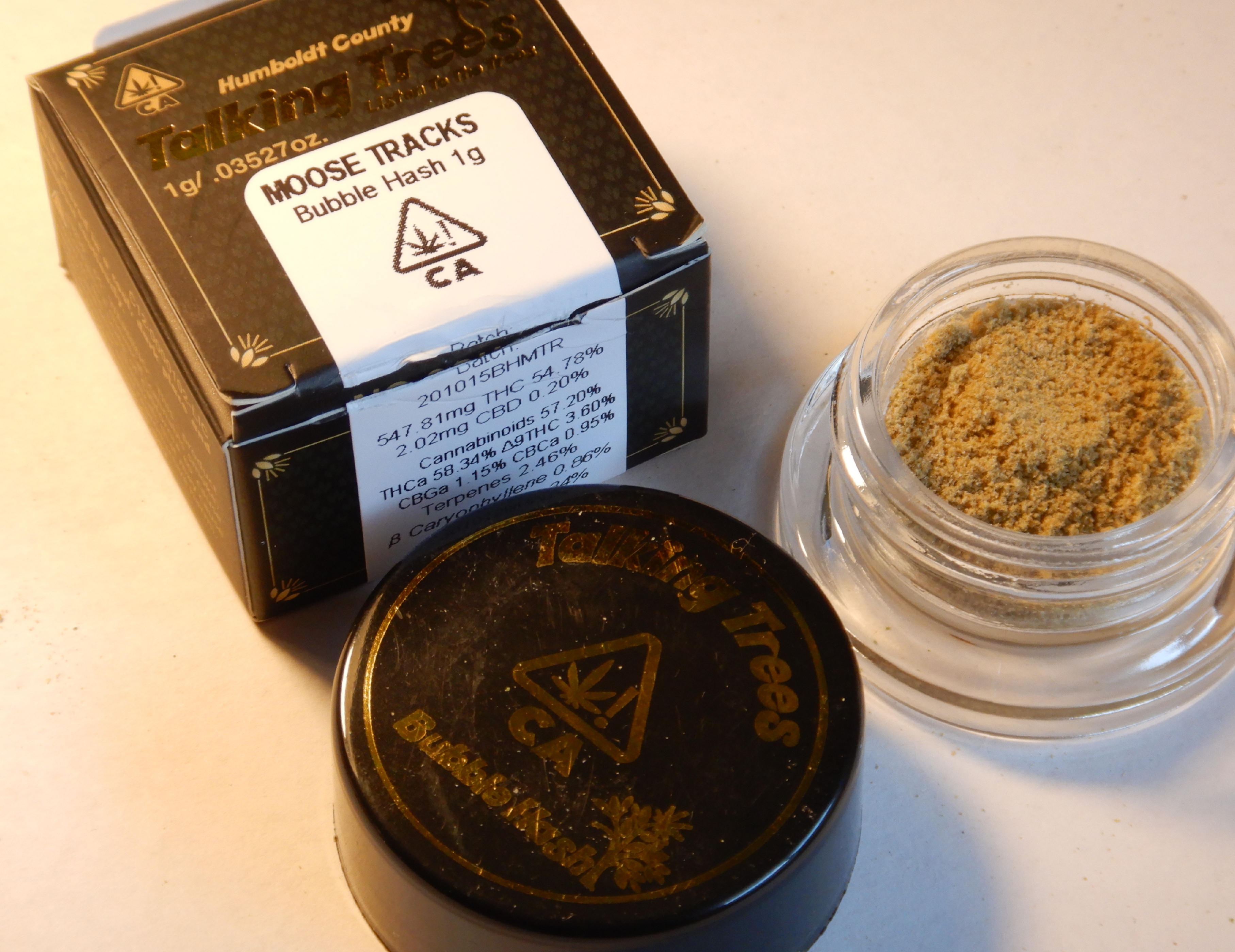 Bubble hash is a sort of granulated hashish, or so it appears and tastes, and about twice the THC percentage as pot flowers. Which sounds about right. More effect on me than gummies anyhow.