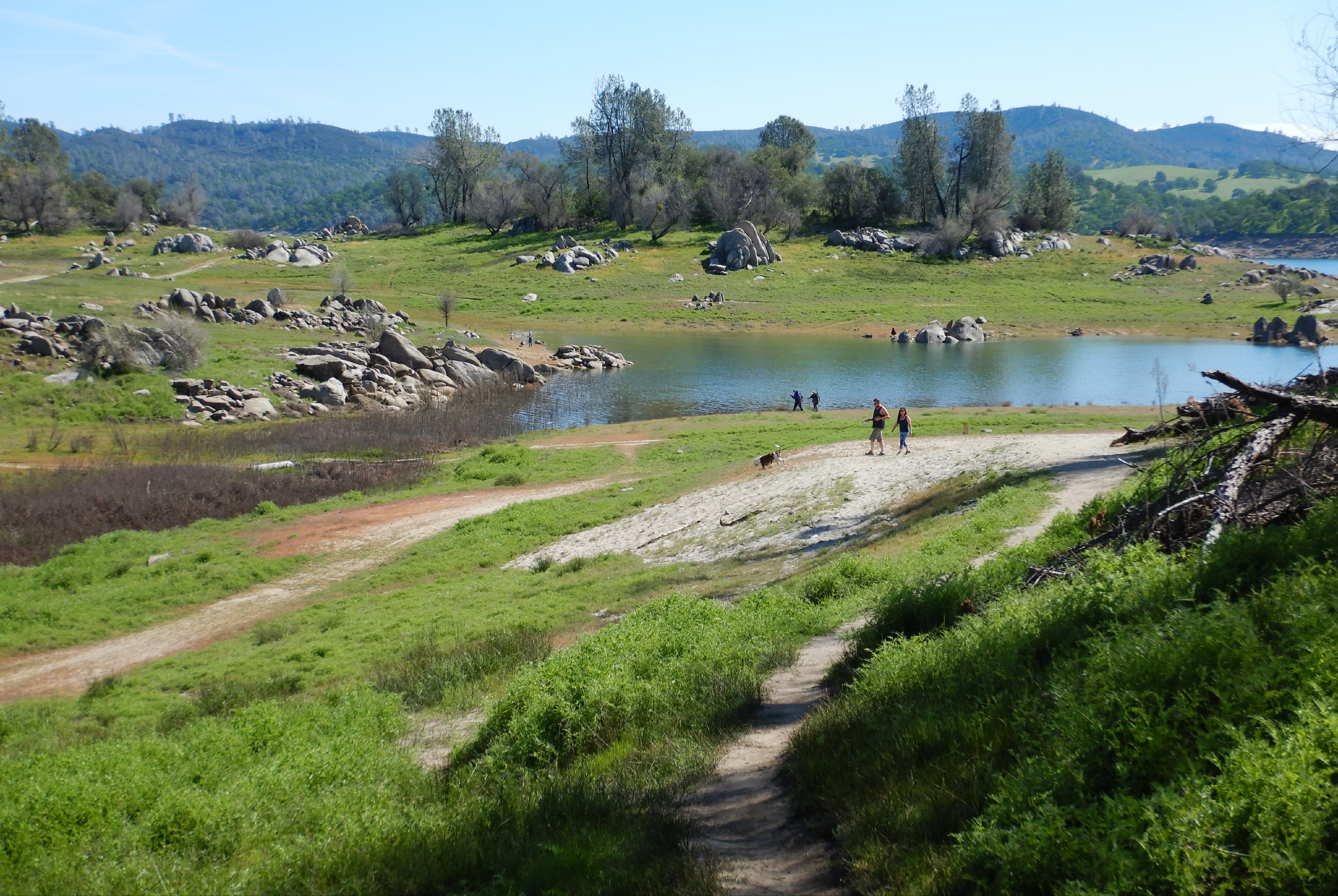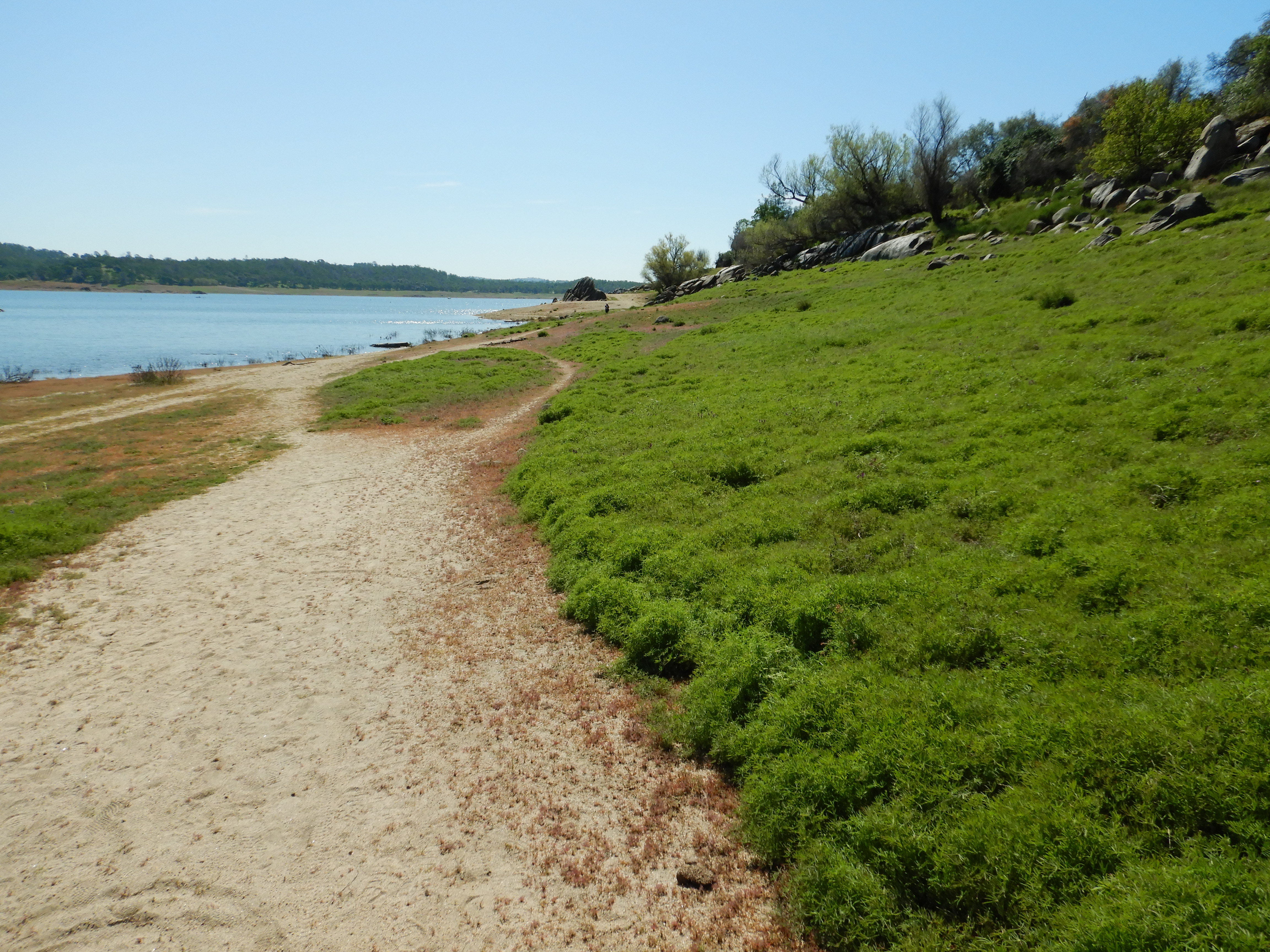Here’s the start of the trail following Beek’s pretty much dry Bight, curving back south toward those points I just mentioned. Good open hiking, not crowded and now desert like, glaring and expansive because the lake is smaller.