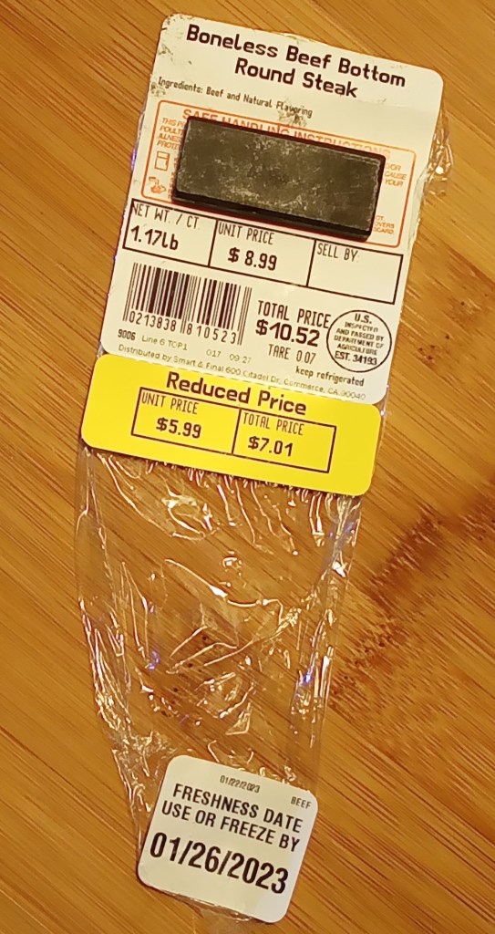 This was a little over a pound of boneless beef bottom round steak, reduced in price because a bit short dated.