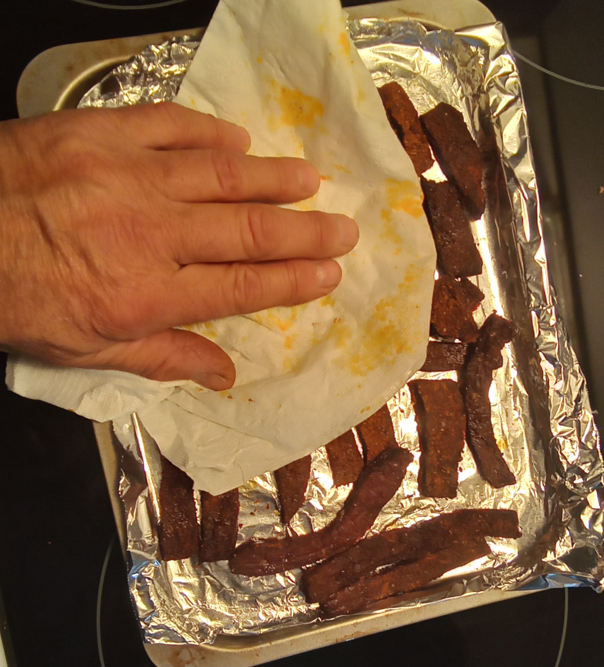The jerky comes out hot and a darker color. They should be dabbed with a paper towel while still hot to remove residual grease, then stored in the fridge after cooling. Enjoy.