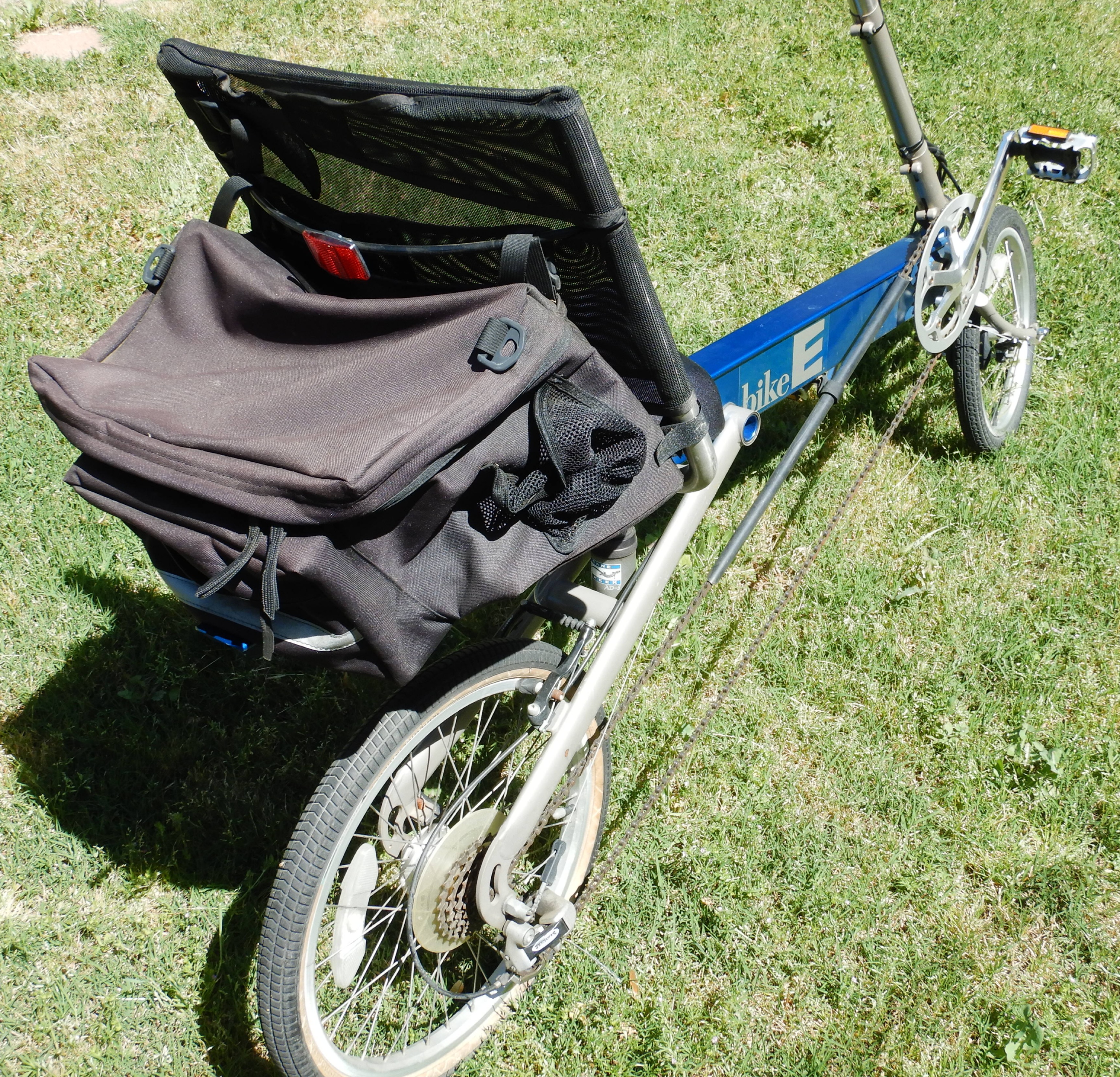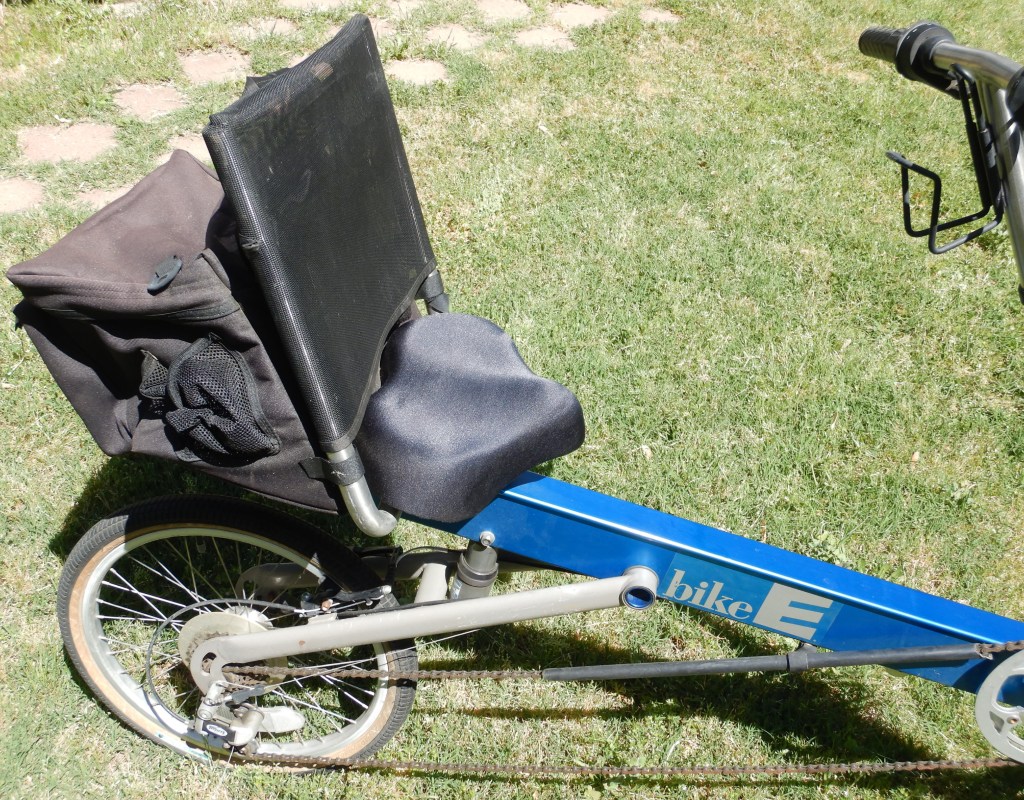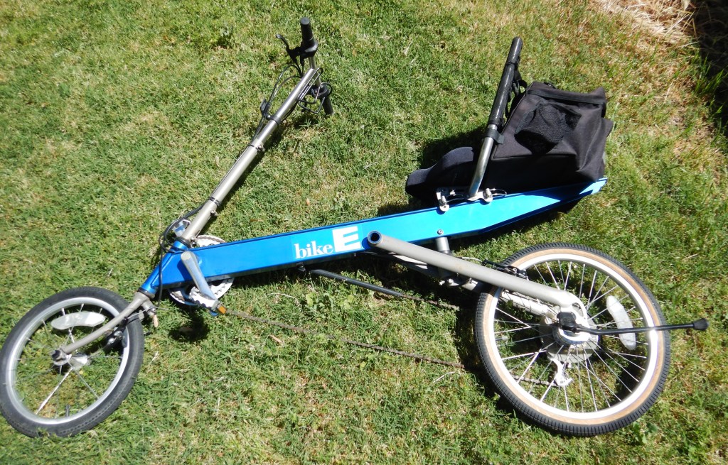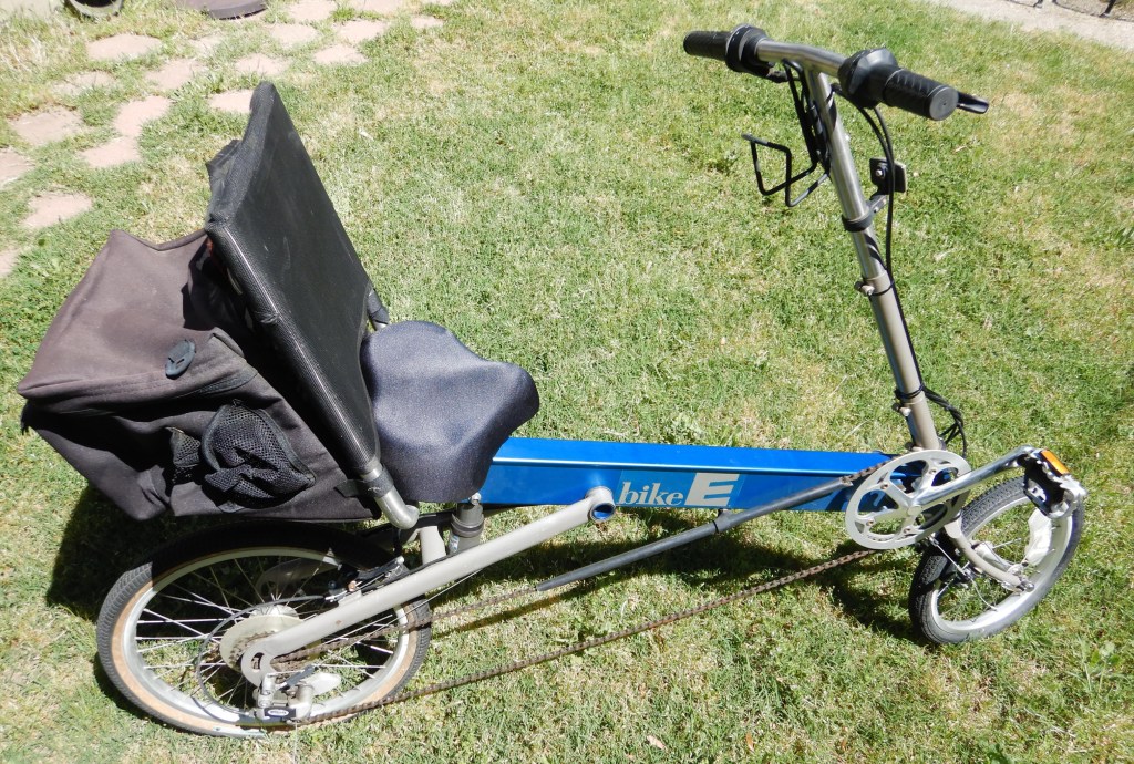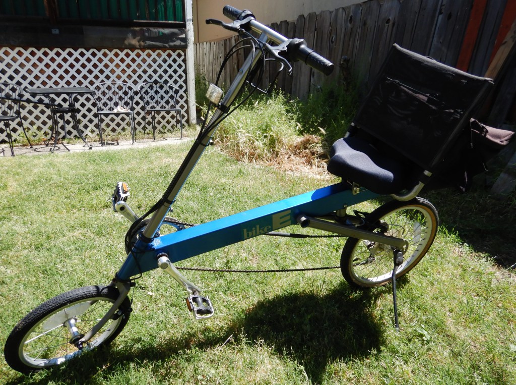 Here’s my new bike, a BikeE recumbent 27-speed I bought yesterday at a religious cult charity thrift store here in Roseville, California. Place called Acres of Hope.