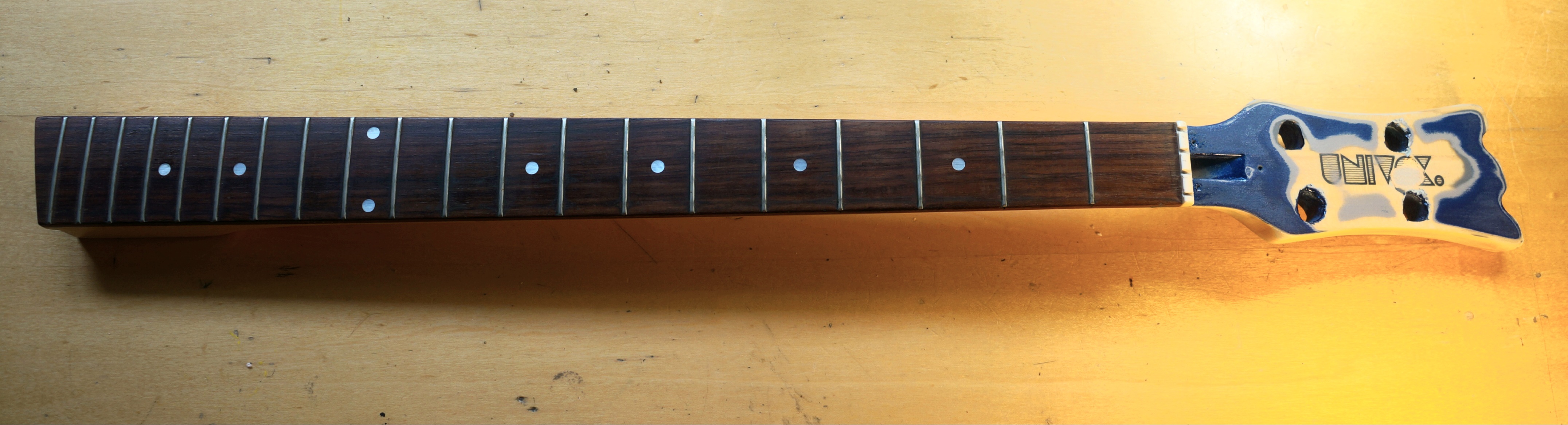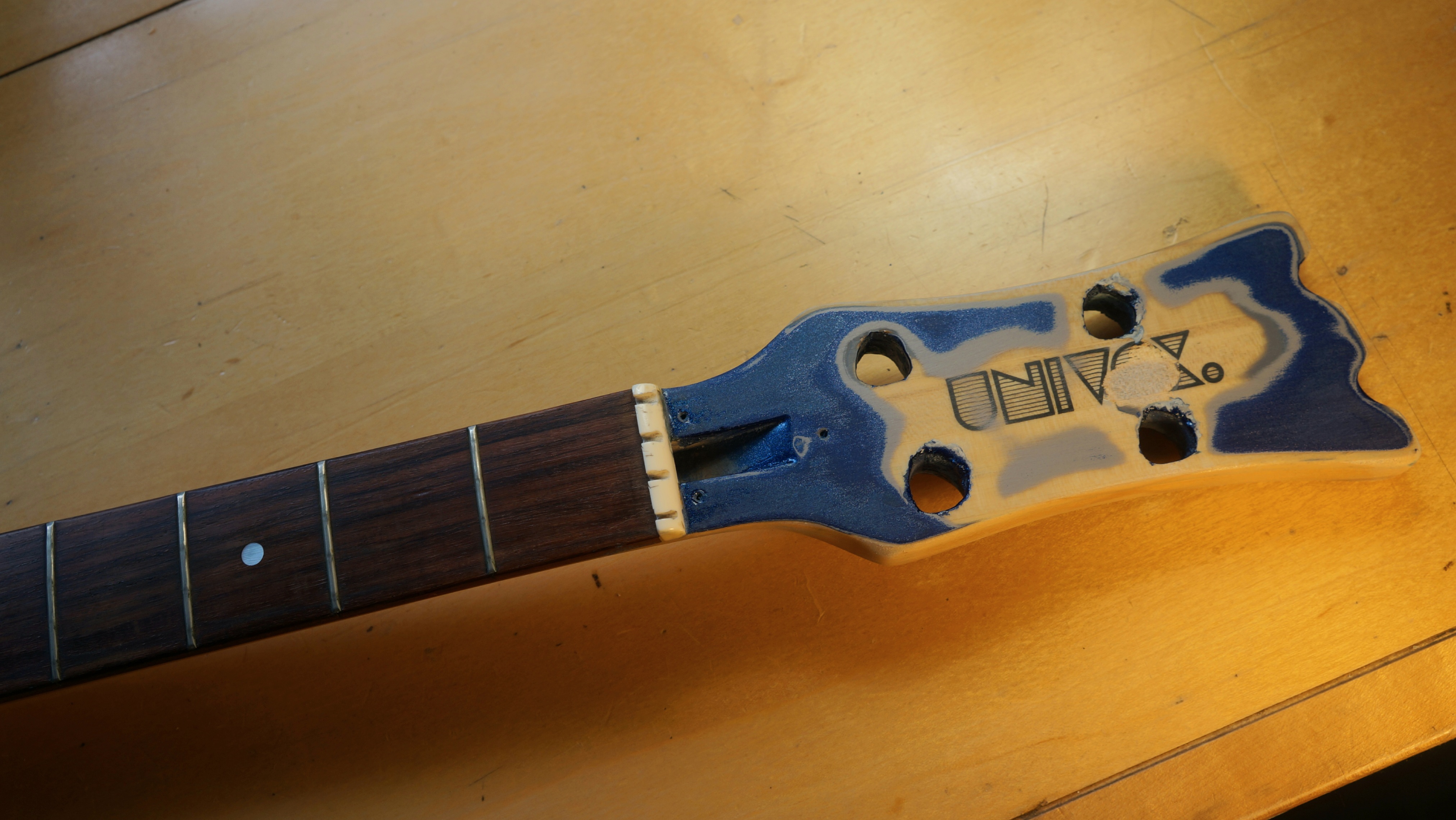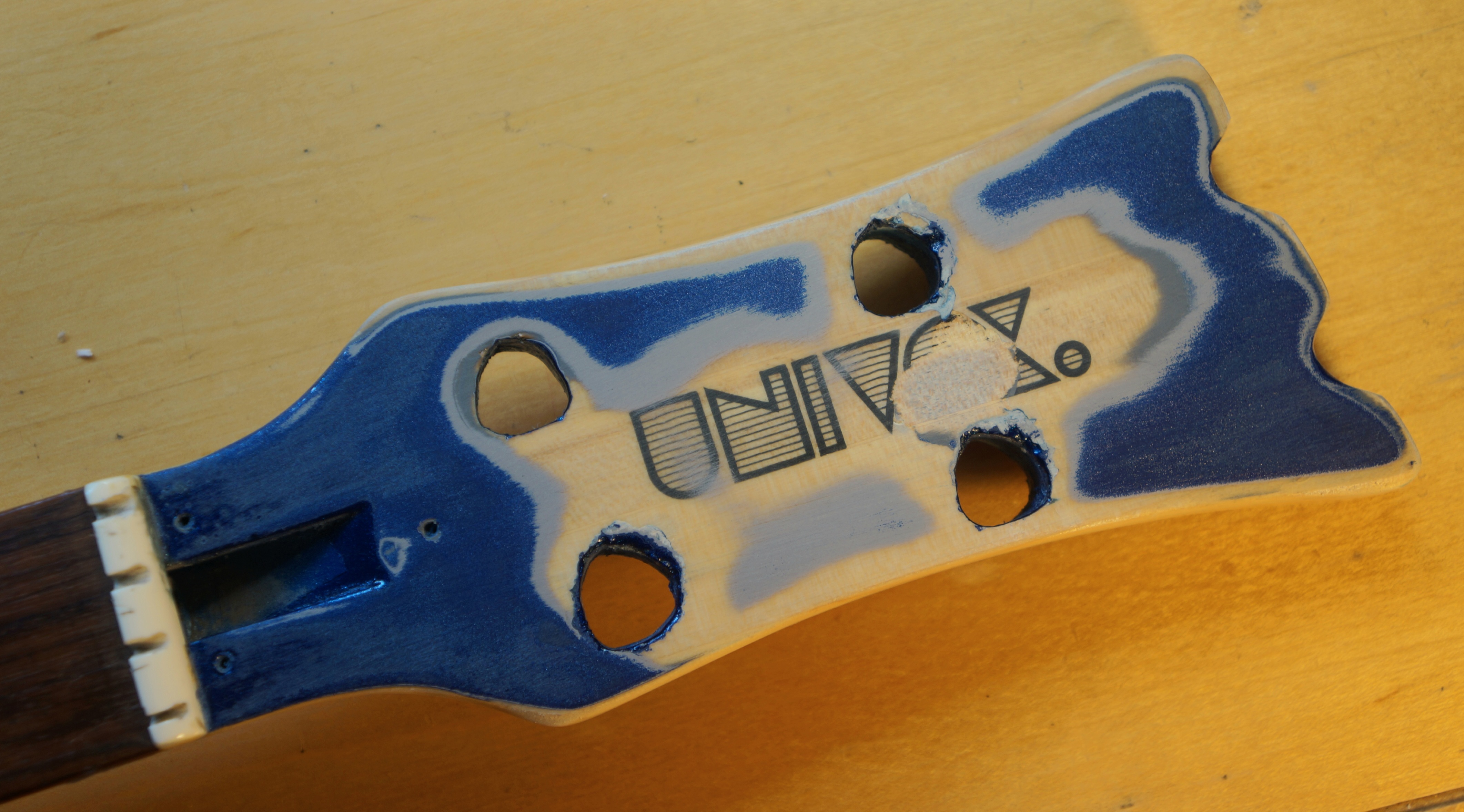 Careful sanding with 180 grit revealed the Univox logo headstock decal of lined block design.