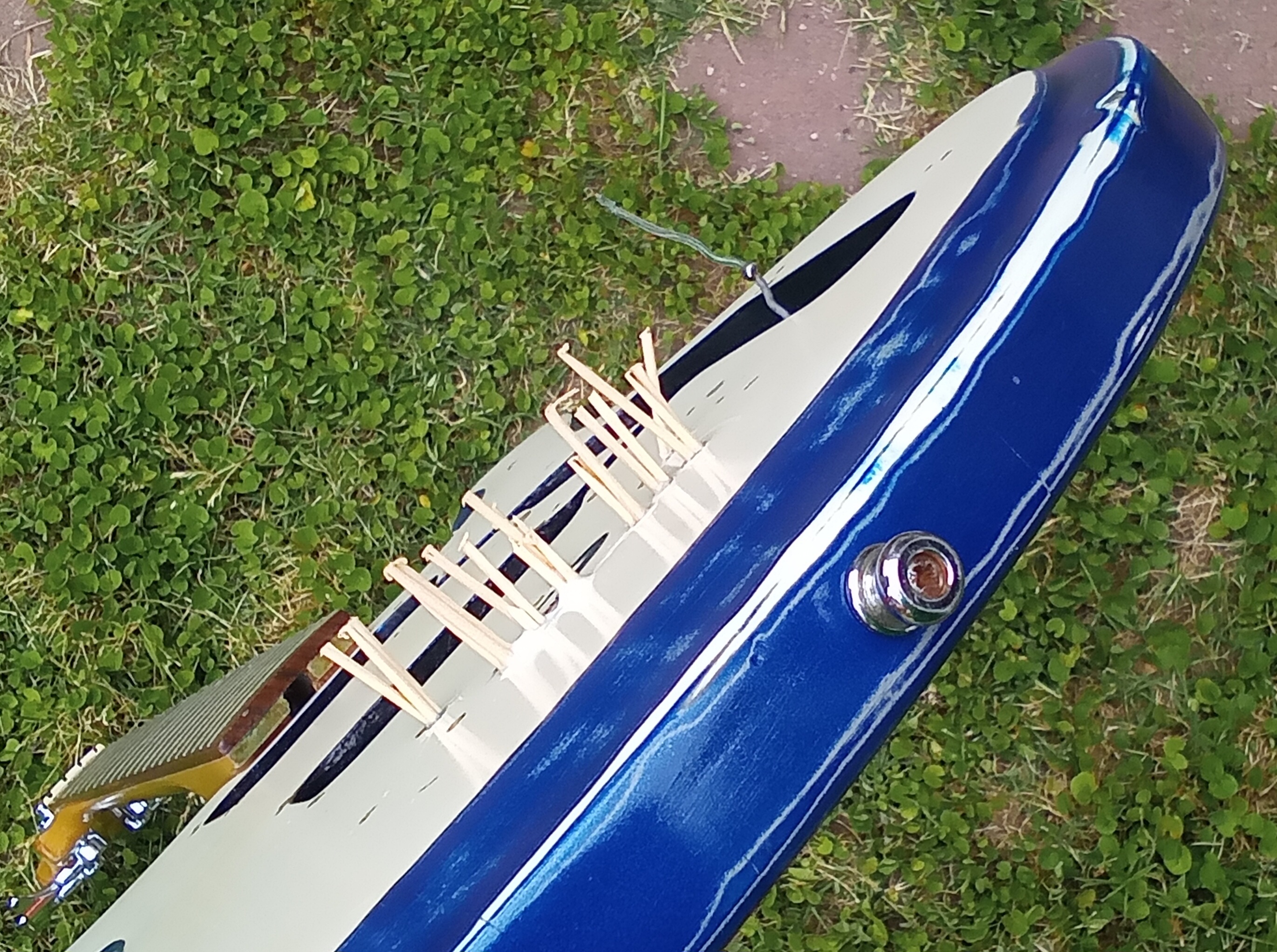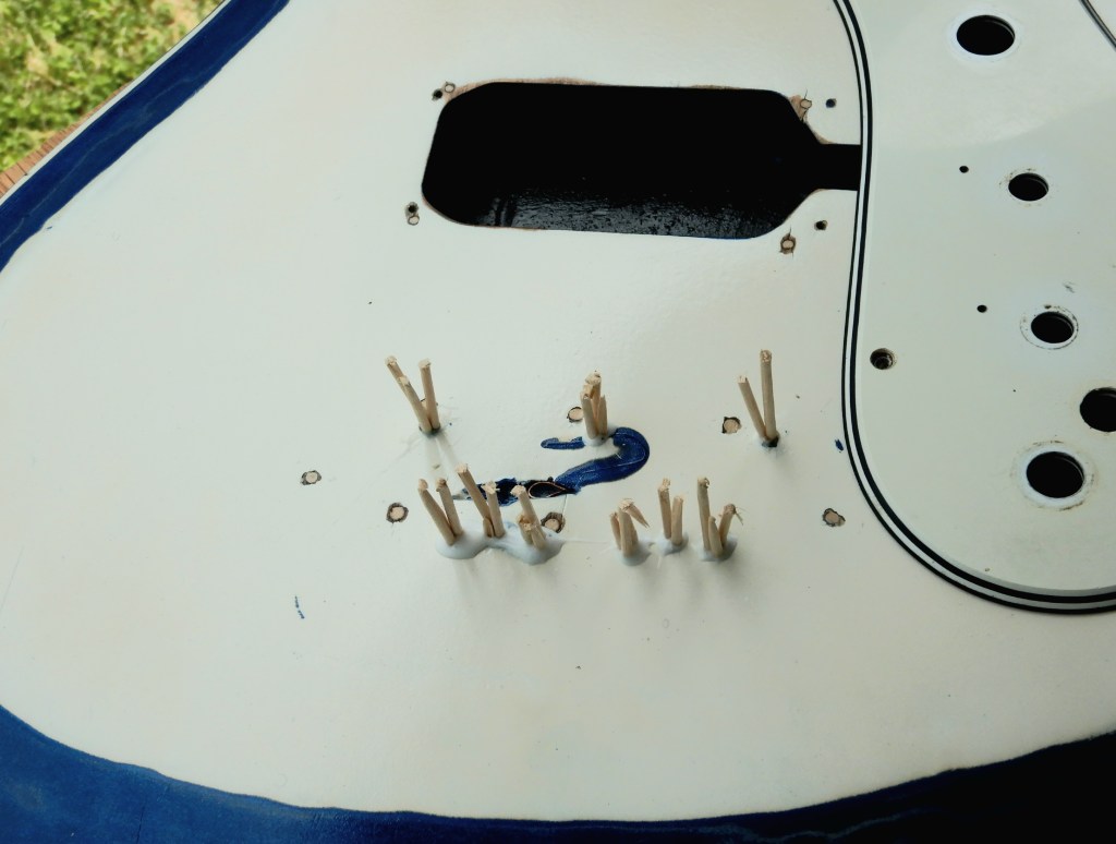 Tomorrow I’ll glue in the other three plugs. Then properly locate the bridge, drill holes and screw it down.