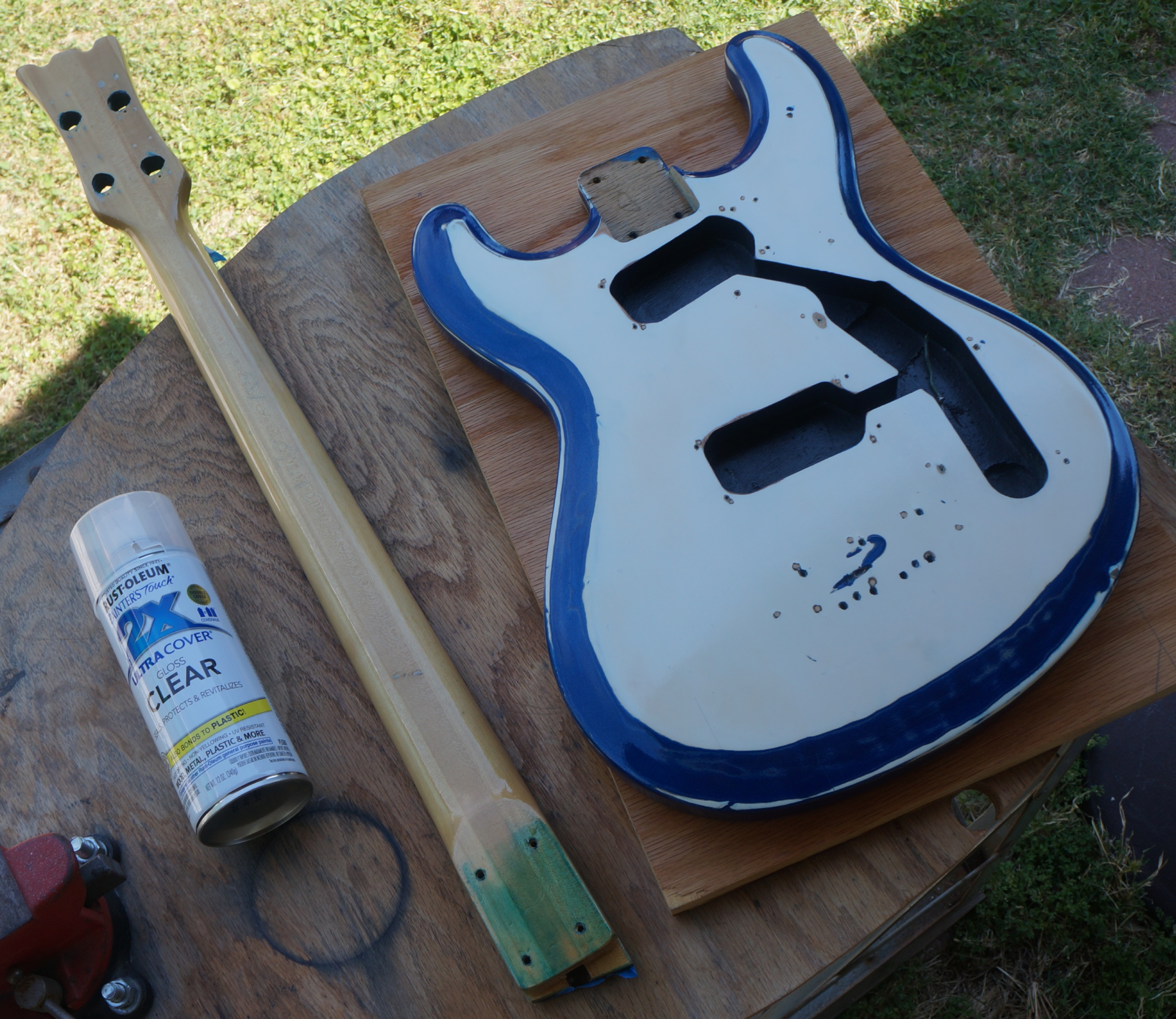 Sprayed two coats on body and neck after masking off the fretboard. Didn’t sand any between coats, saving varnish for the knotty pine porch planking.