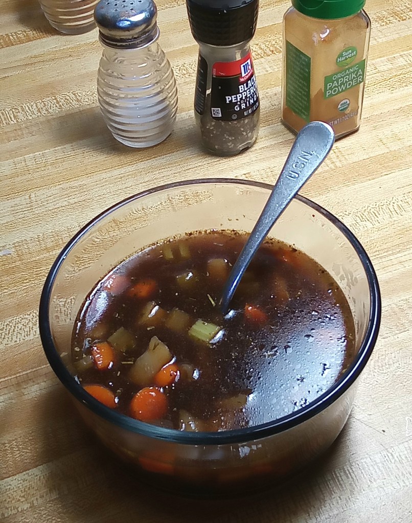 Let it low simmer 45 minutes or so, checking and stirring now and then. It’s done when the vegetables are the right texture.