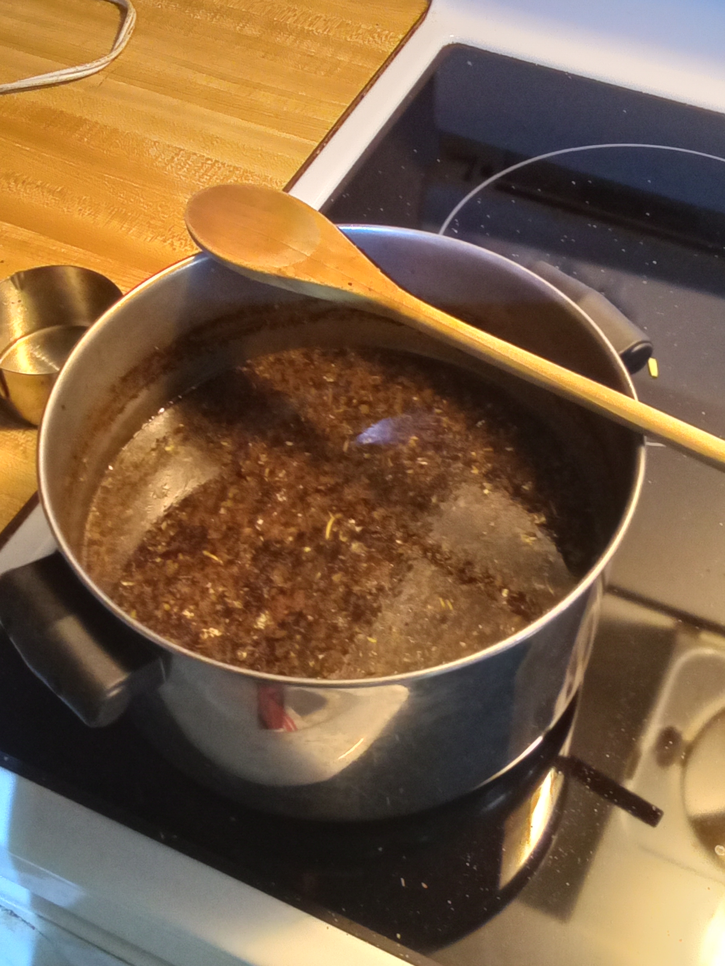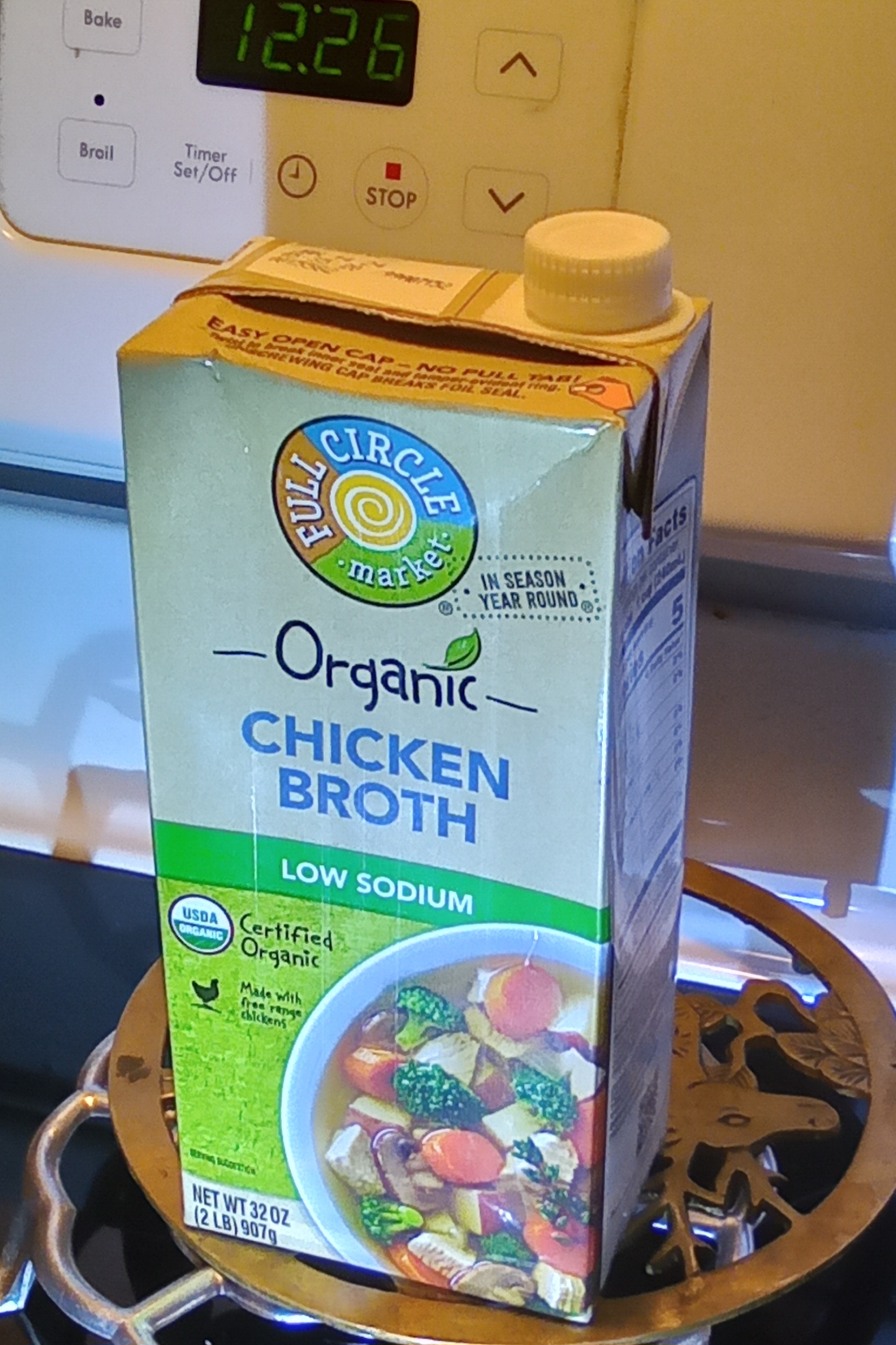 One and a half cartons organic chicken soup stock (what I had, 3 cups[?]), 2 cups filtered water.
