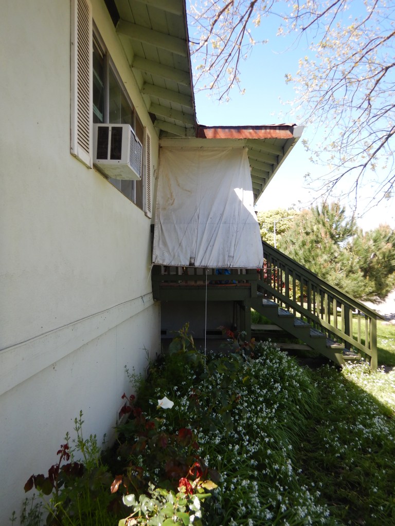 The gutters were a different story, rusted and flooding the foundation, so we ripped off and cut off some of it. It should all be removed and gravel poured on the house’s ground drip line.