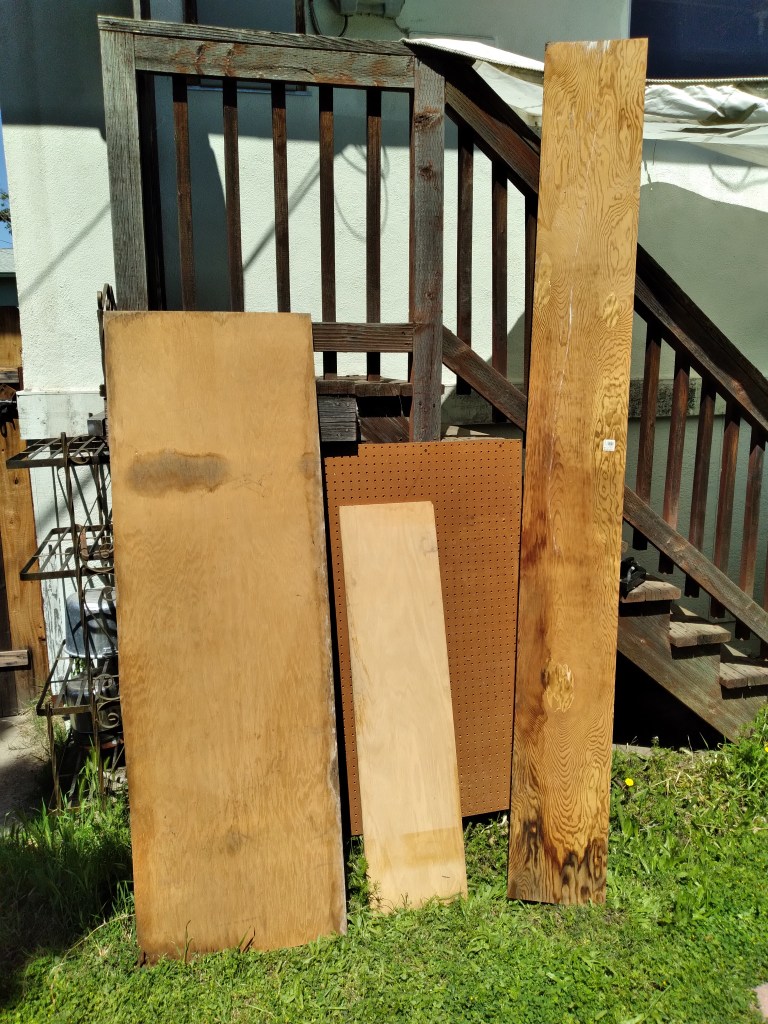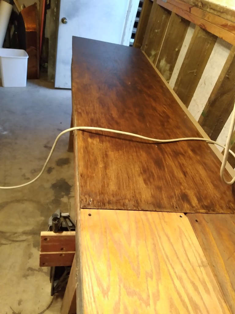 So I was eager to plate with wood the filthy particle board top surface using the almost equally ancient but high quality plywood cut-offs and stain-varnish I inherited from my dad in 2021.