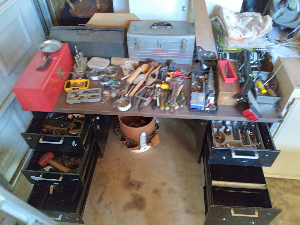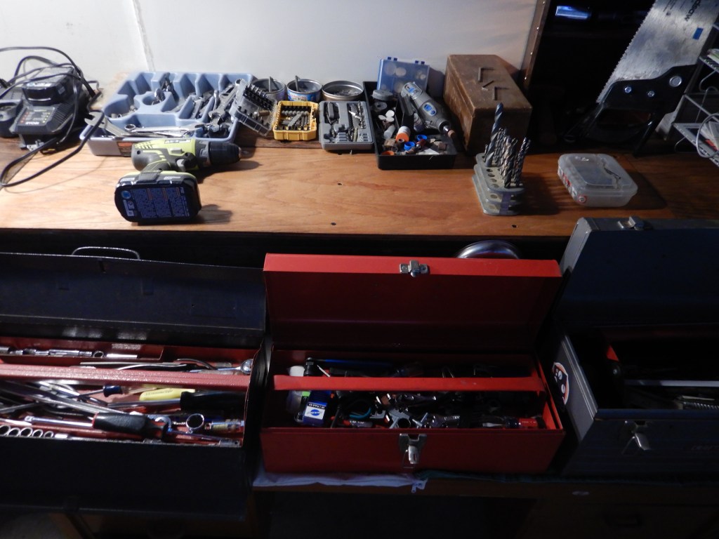 So my goal was to keep all my tools together to the right side of the work table, tool boxes on top, other tools stored in a wood desk and wood cabinet under the countertop.