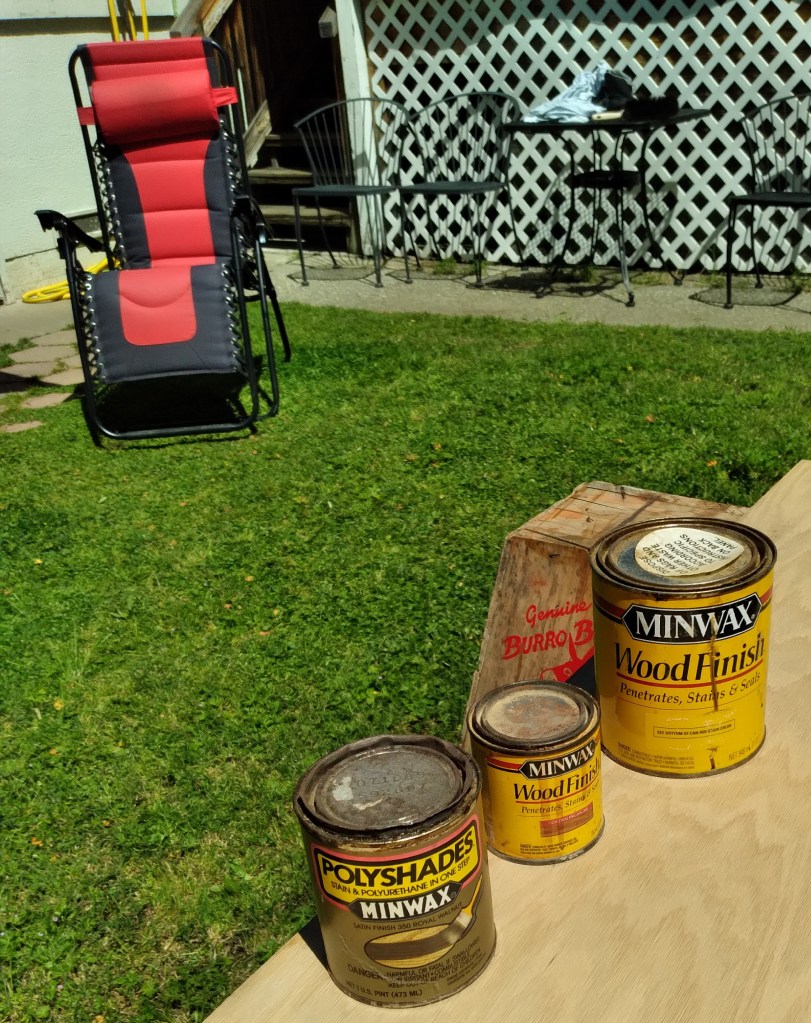 Ditched the brush instead of fussing with cleaning it with more toxic mineral spirits, to go with the toxic old (2001!) Minwax, as daddy would not have done, no matter how old the brush.