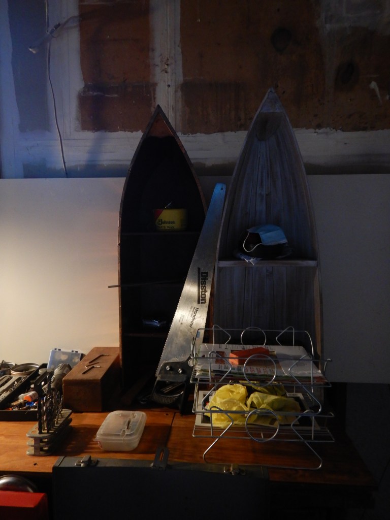 Nautical theme cut-in-half-dinghy-bookcase storage. Tool boxes left to right: automotive tools, bike tools, drill bits and hack saw blades.