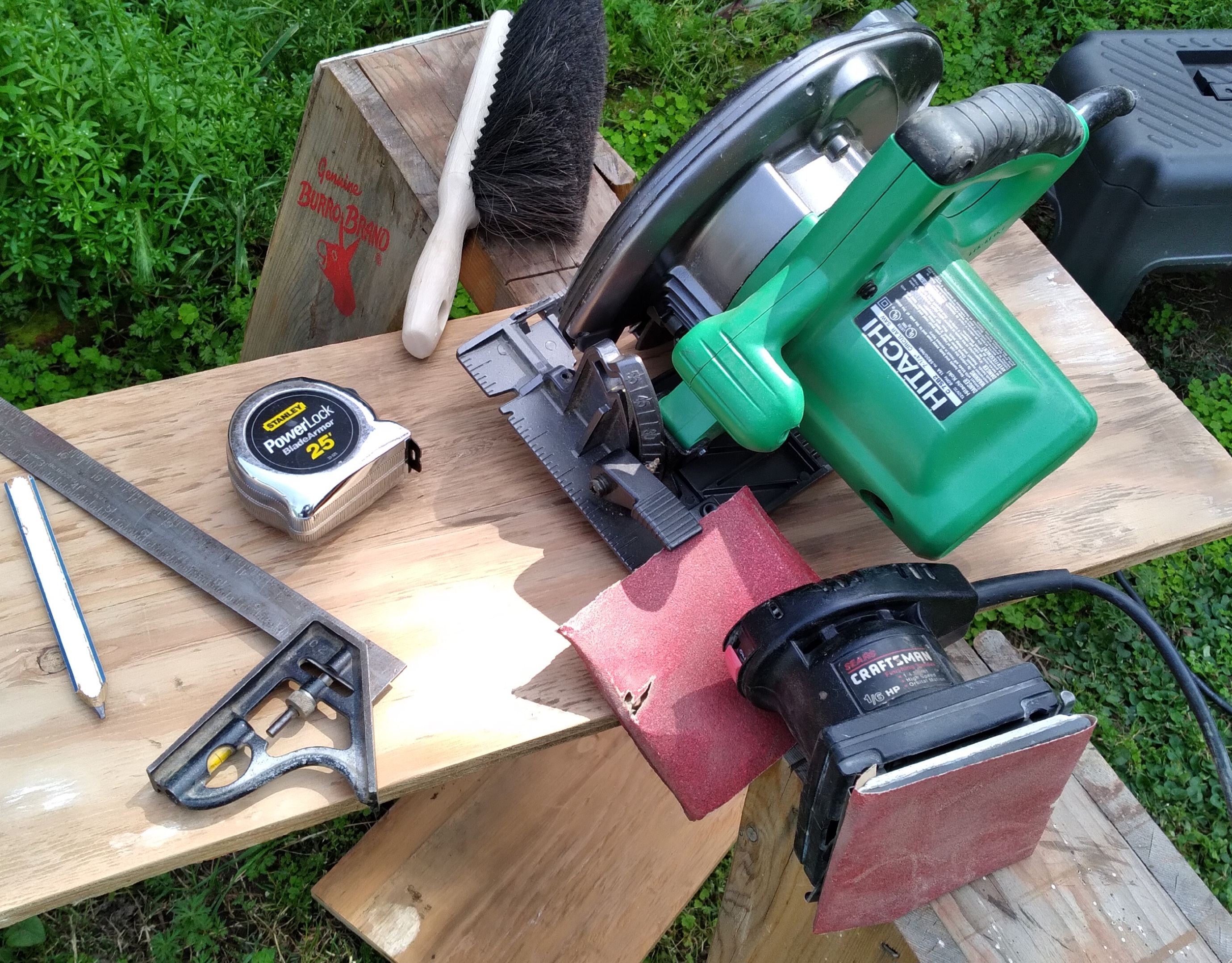 The green Hitachi rotary electric saw and new blade I also inherited, along with many hand and power tools, screws and nails and staples and brads, sandpaper, steel wool, router, jigsaw, razor sharp chisel set, varnish, paint, Kilz!, Shopvac, Workmate table… And more.
