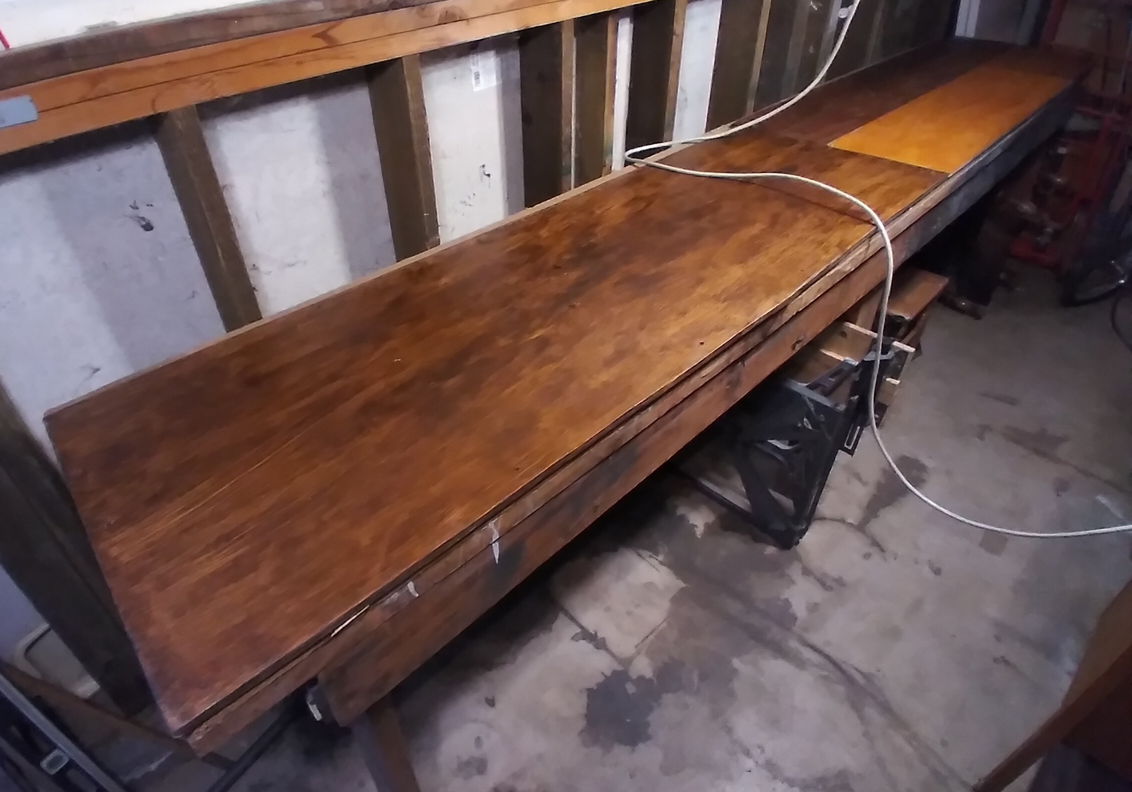 So I was eager to plate with wood the filthy particle board top surface using the almost equally ancient but high quality plywood cut-offs and stain-varnish I inherited from my dad in 2021.