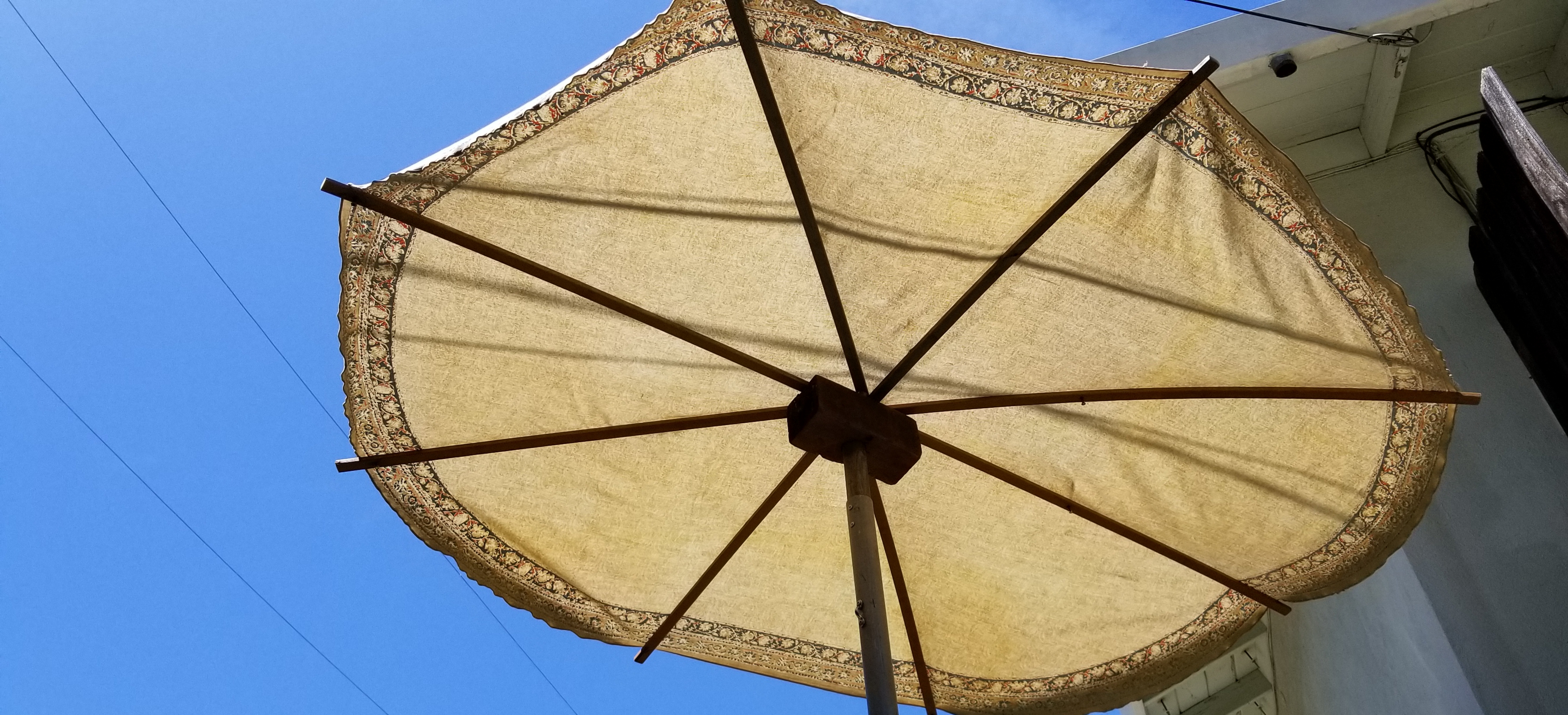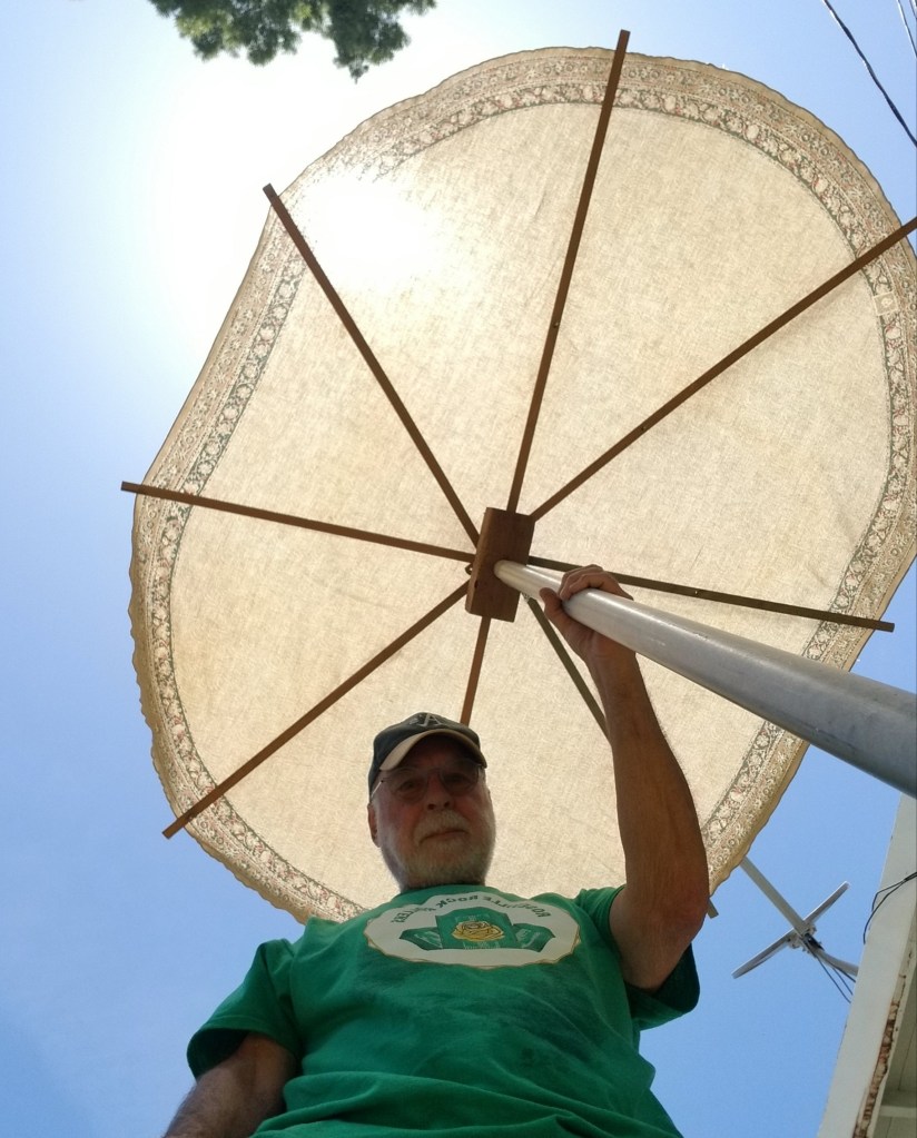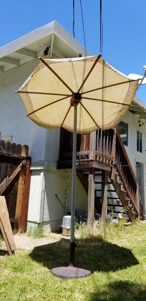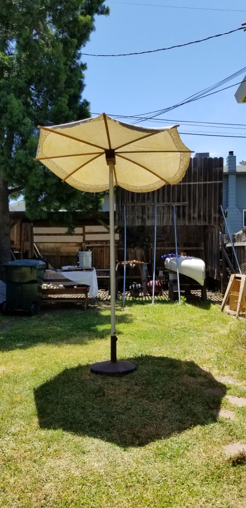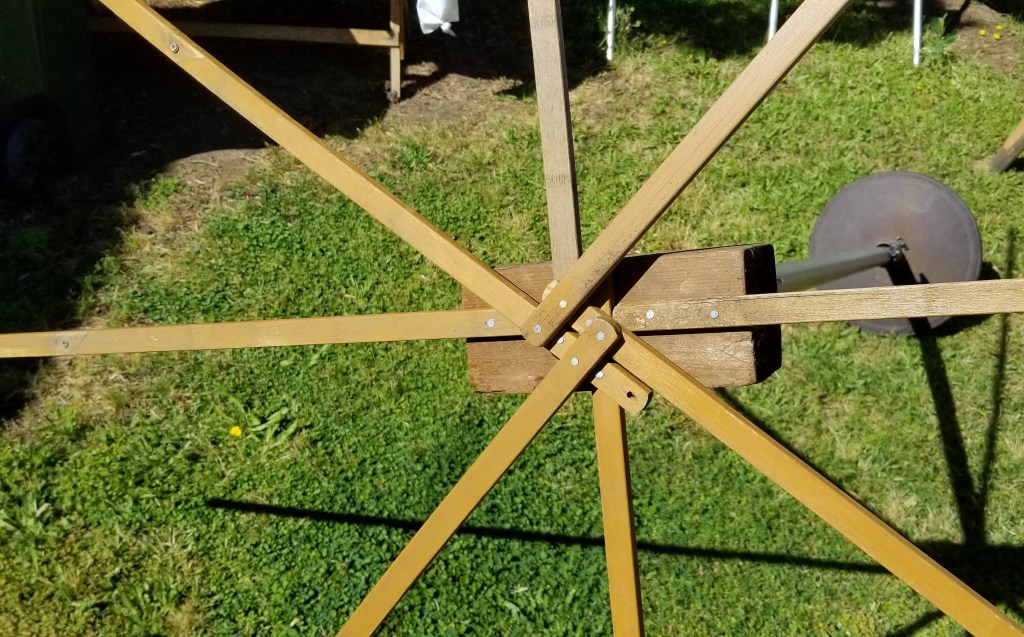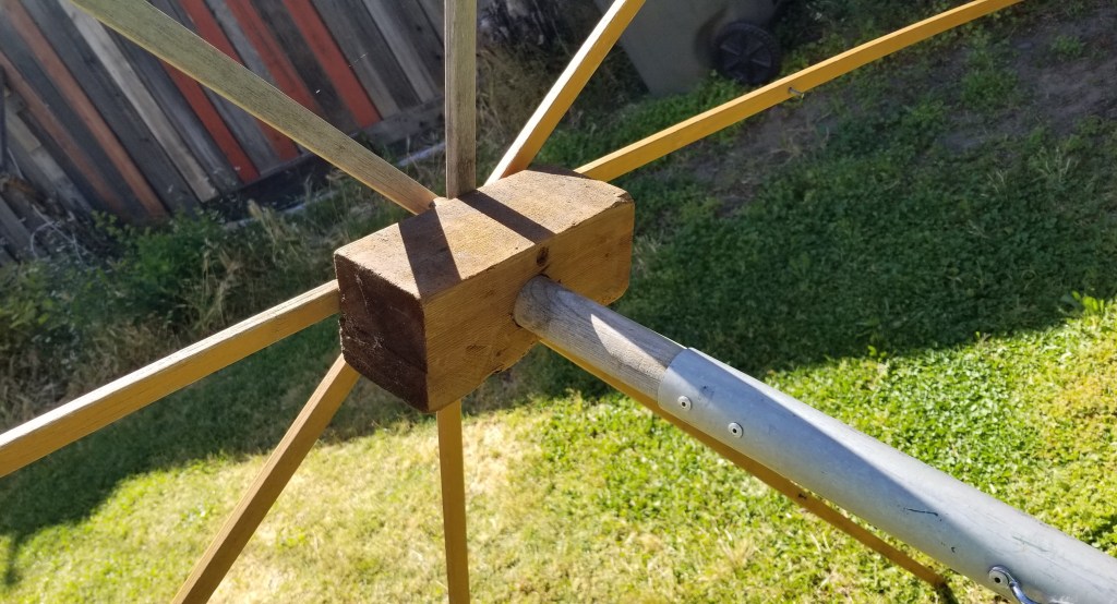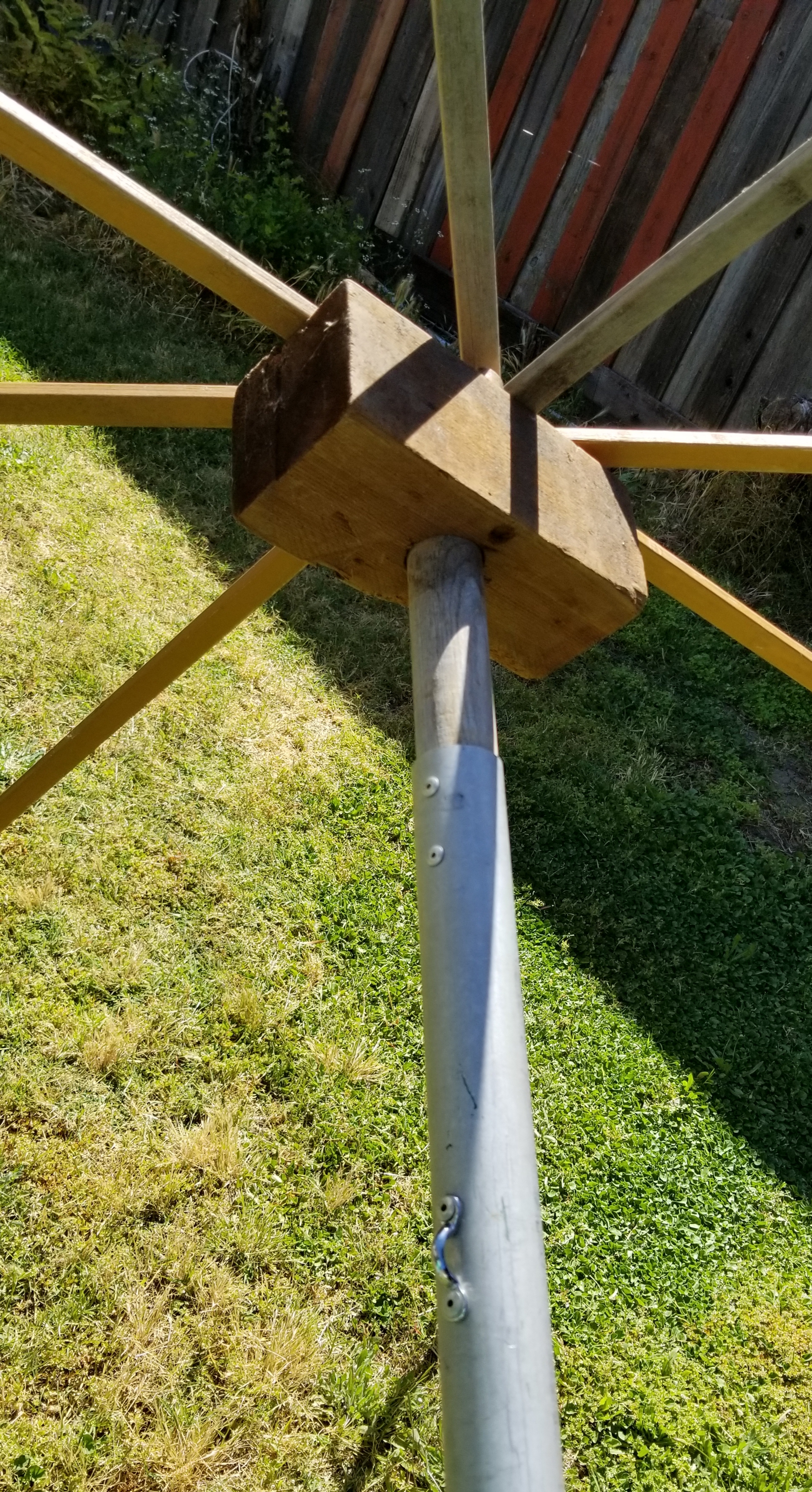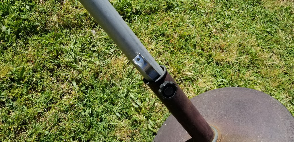 I wedged in this old chrome mystery bike component to compensate for the thinner aluminum sloop mast compared to the old wood umbrella mast.