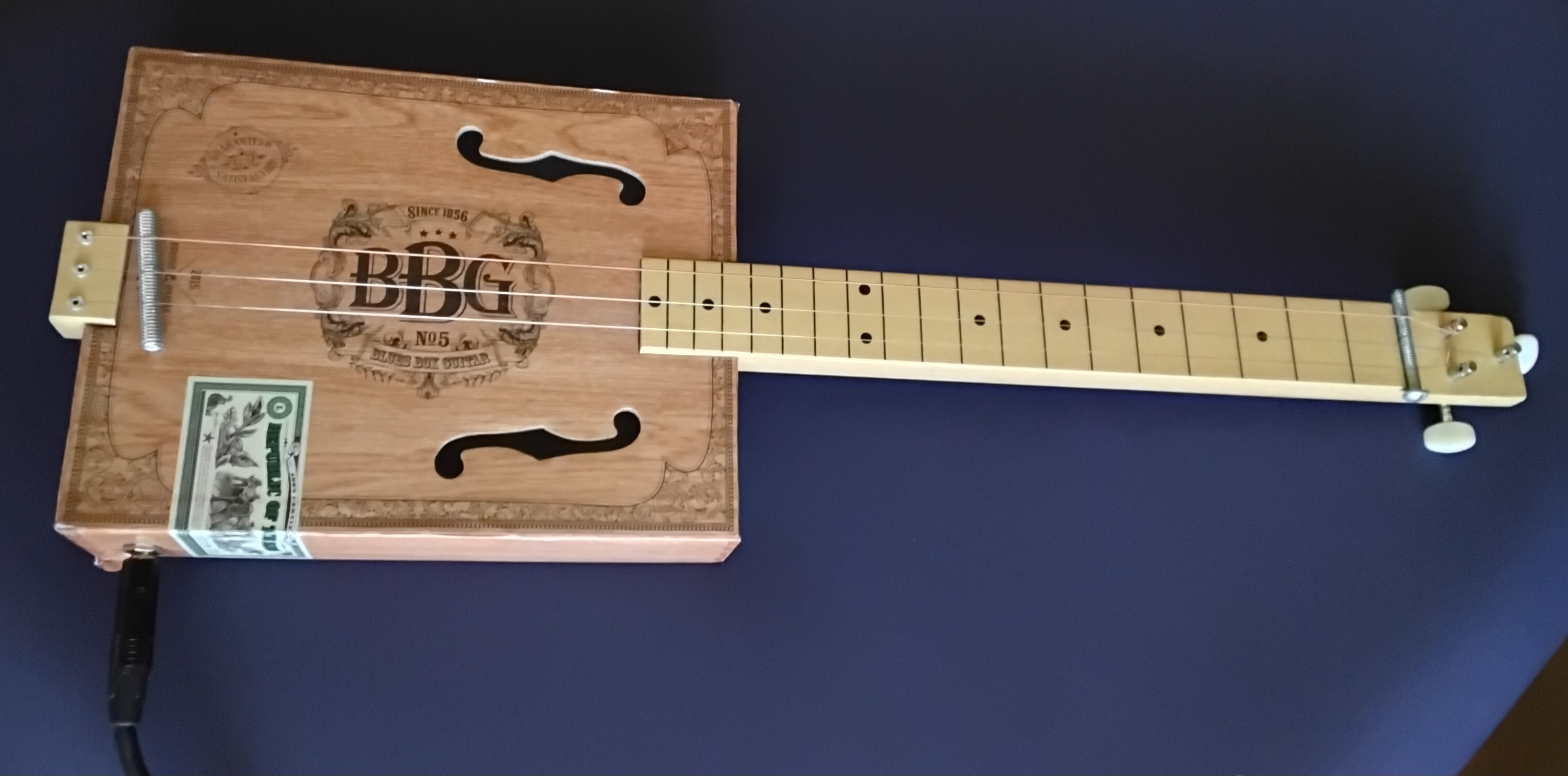 So my plan to bust it up for the piezo pickup, input jack, and neck has changed. Because it sounds pretty good and the fretless playing of it is baroque but fun to try. So I’m keeping it together as an ax but ripping off the peeling plastic fake cigar box cover ASAP, like peeling off an ugly sunburn. Replacing it with…? I’m thinking decoupage. Another project just when I have so many. But big fun. Let the ripping begin.