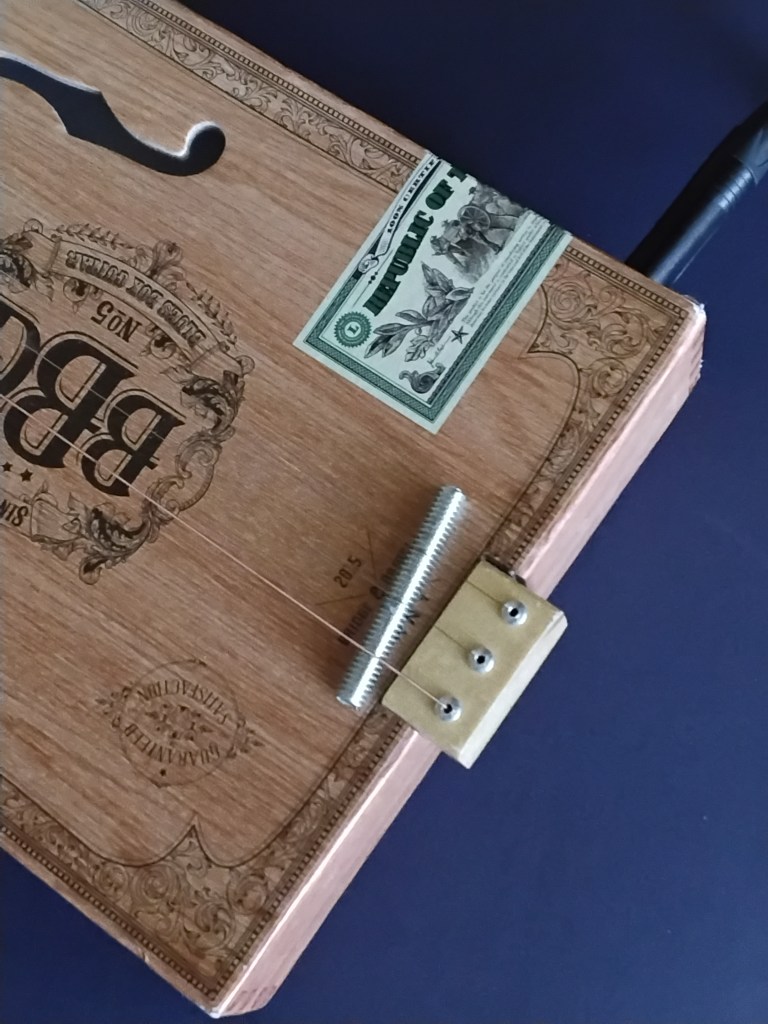 I bought this 2nd hand semi-fake cigar box bass (tuned E, A, D, so I’m claiming it is a tiny piccolo bass) at Denio’s big flea market in Roseville, Placer County, California. My Afgani used music seller pal must have ‘seen me coming’.