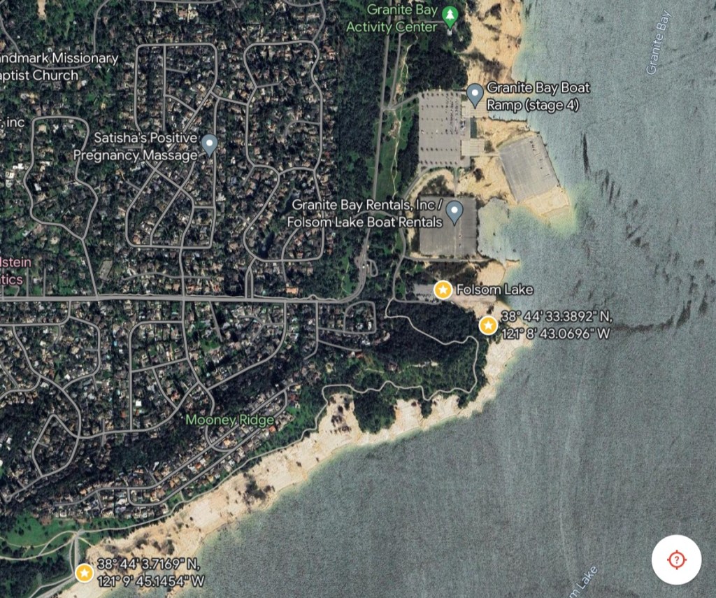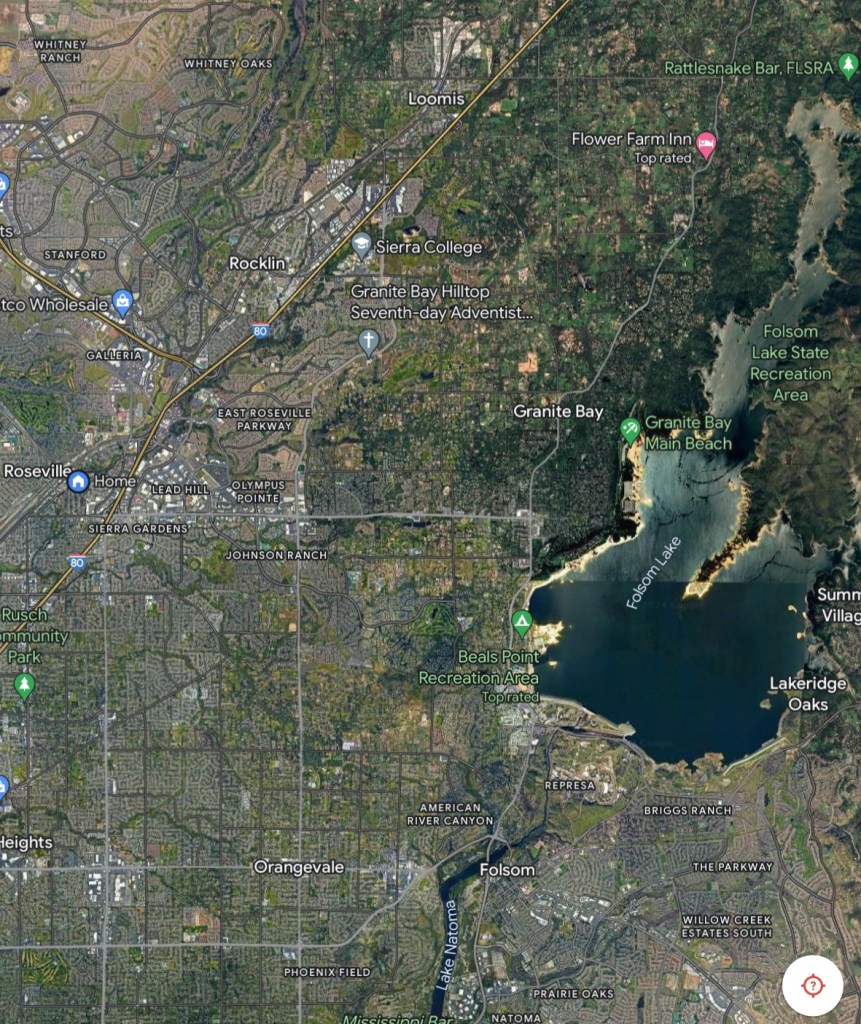 Folsom Lake is near max capacity now, with stream and snow runoff about equalling lake outflow. The difference between the usual drought years’ lake height and this high water world is striking.
