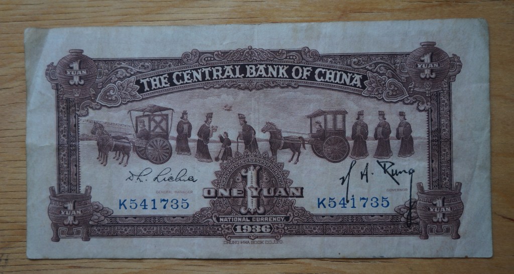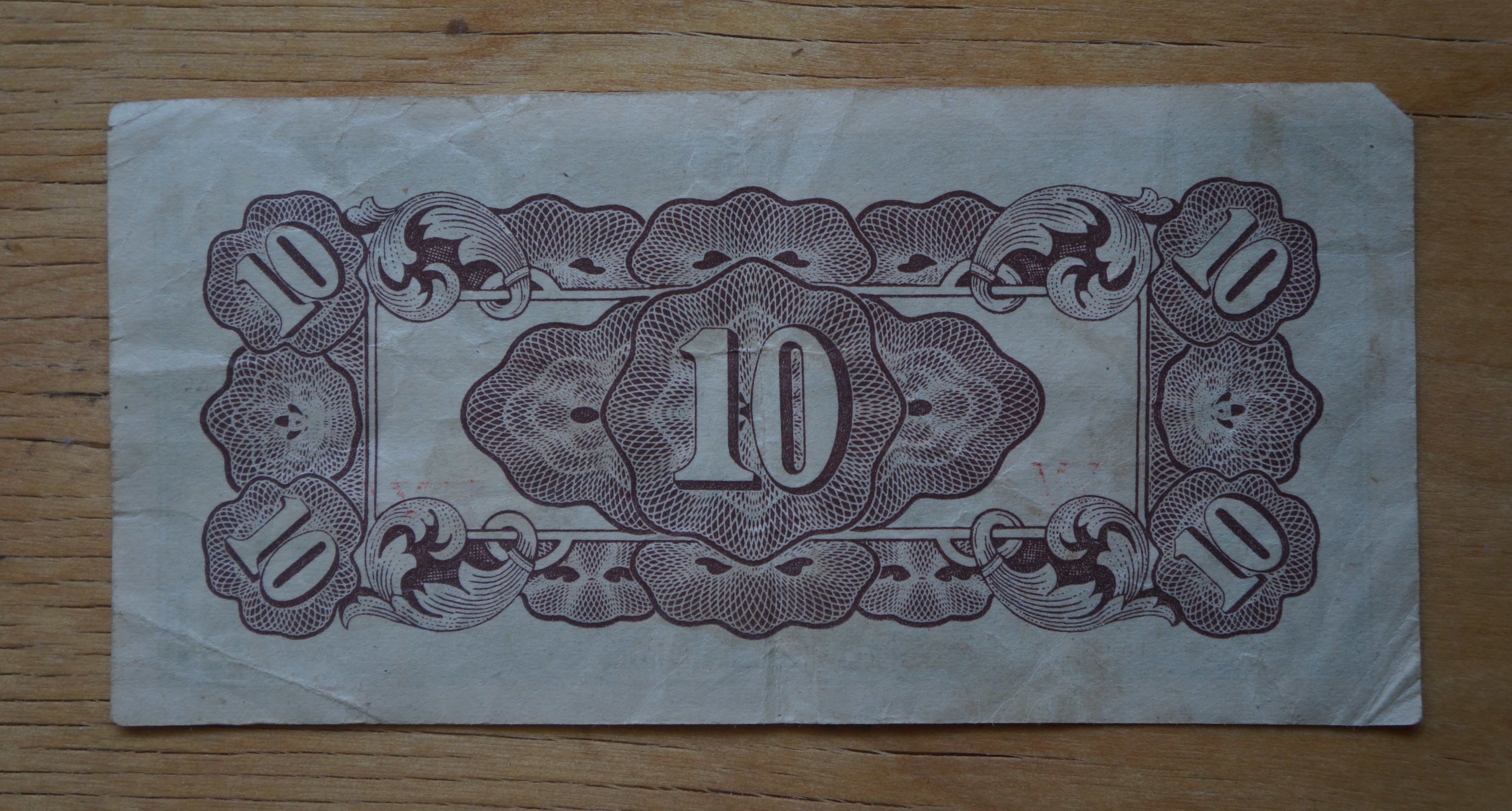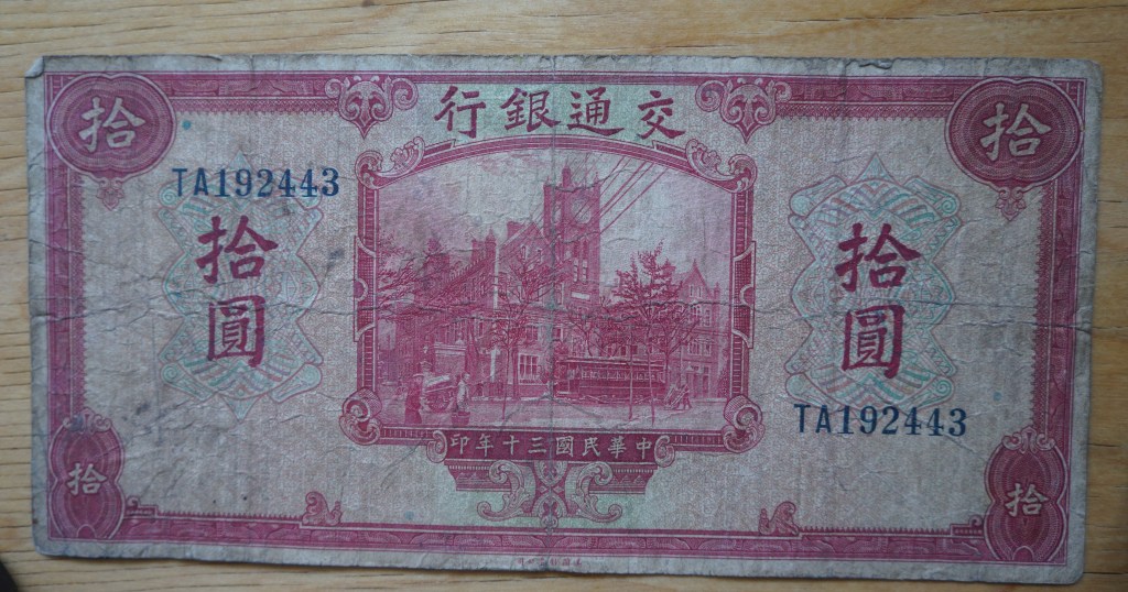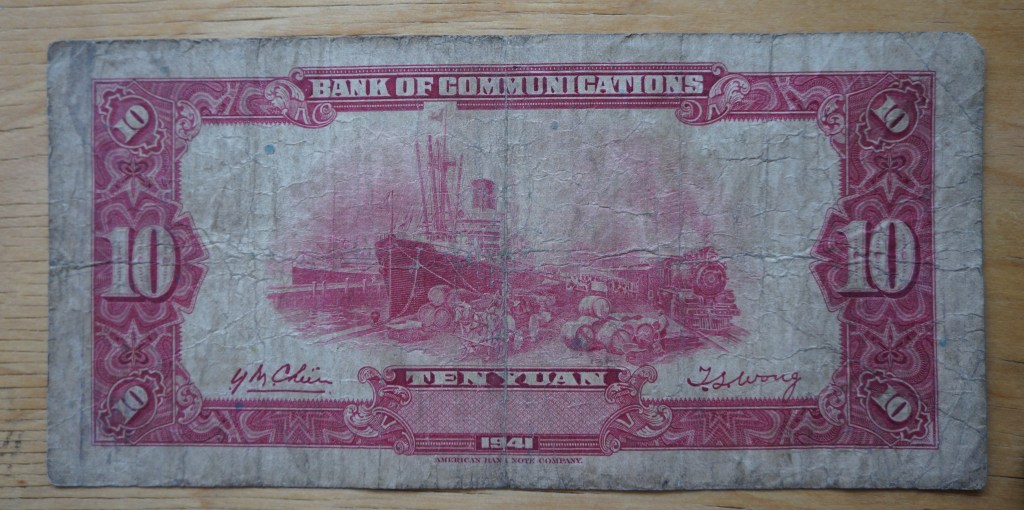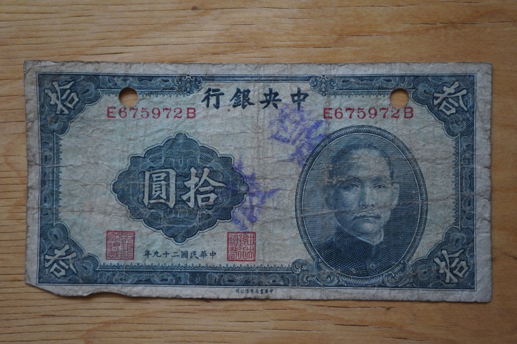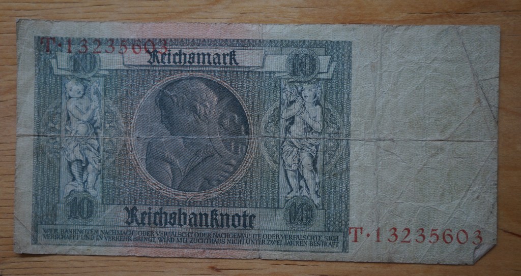 Shanghai was a cosmopolitan port so my dad seems to have gathered other countries’ money as well, here a pre-WWII 10 Reichsmark German bill.
