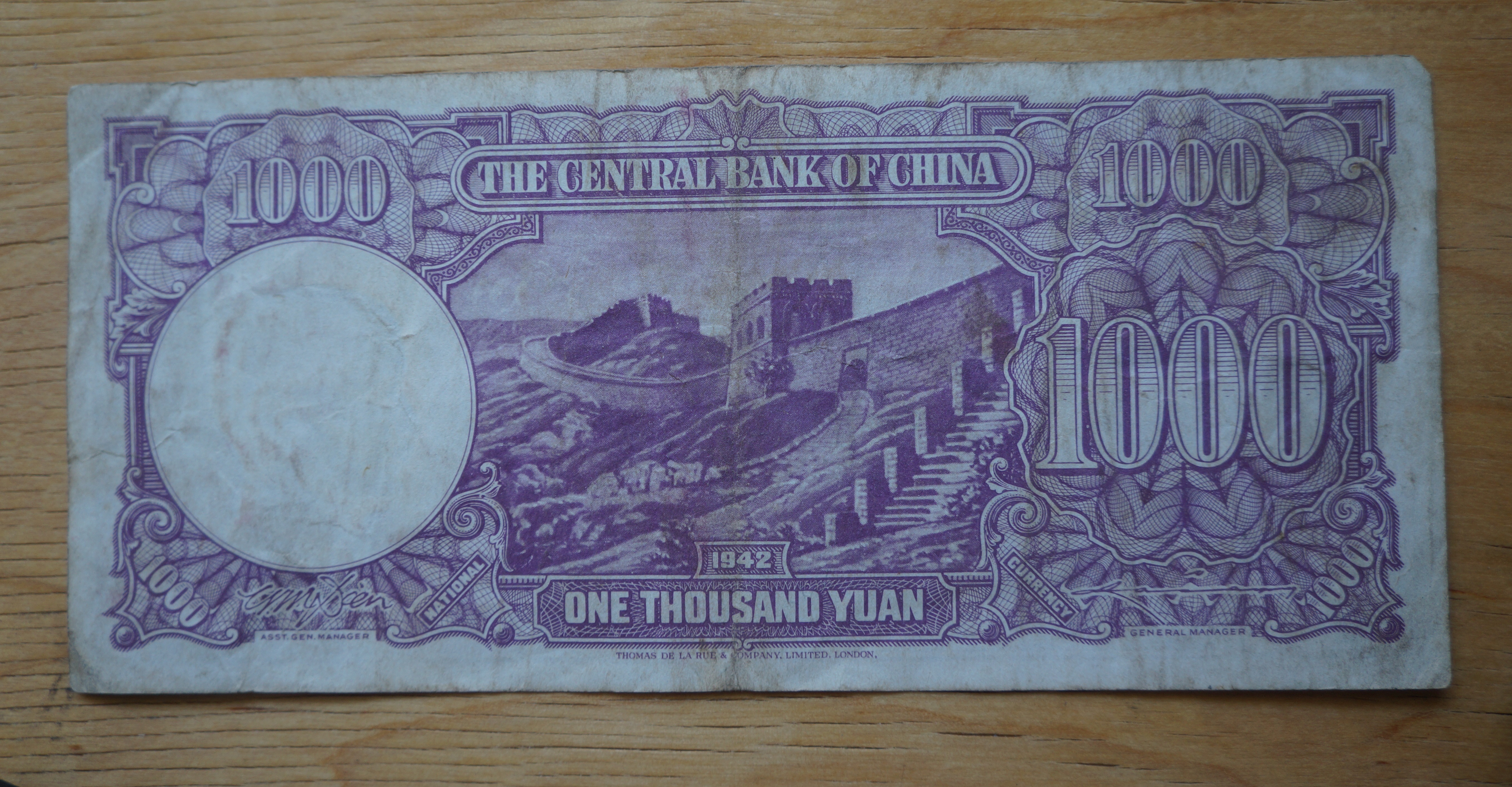 This 1942 bill’s reverse side depicts the Great Wall.