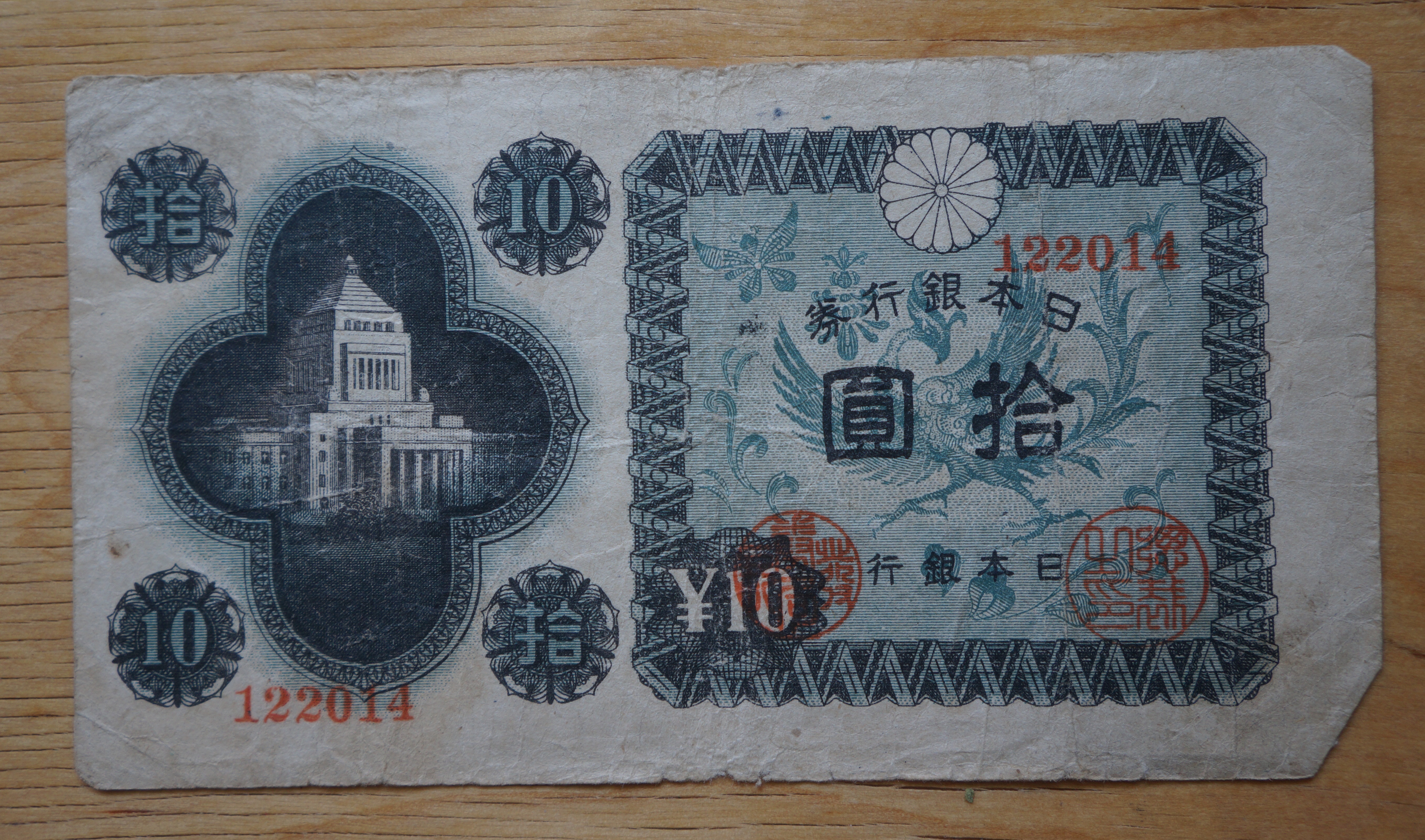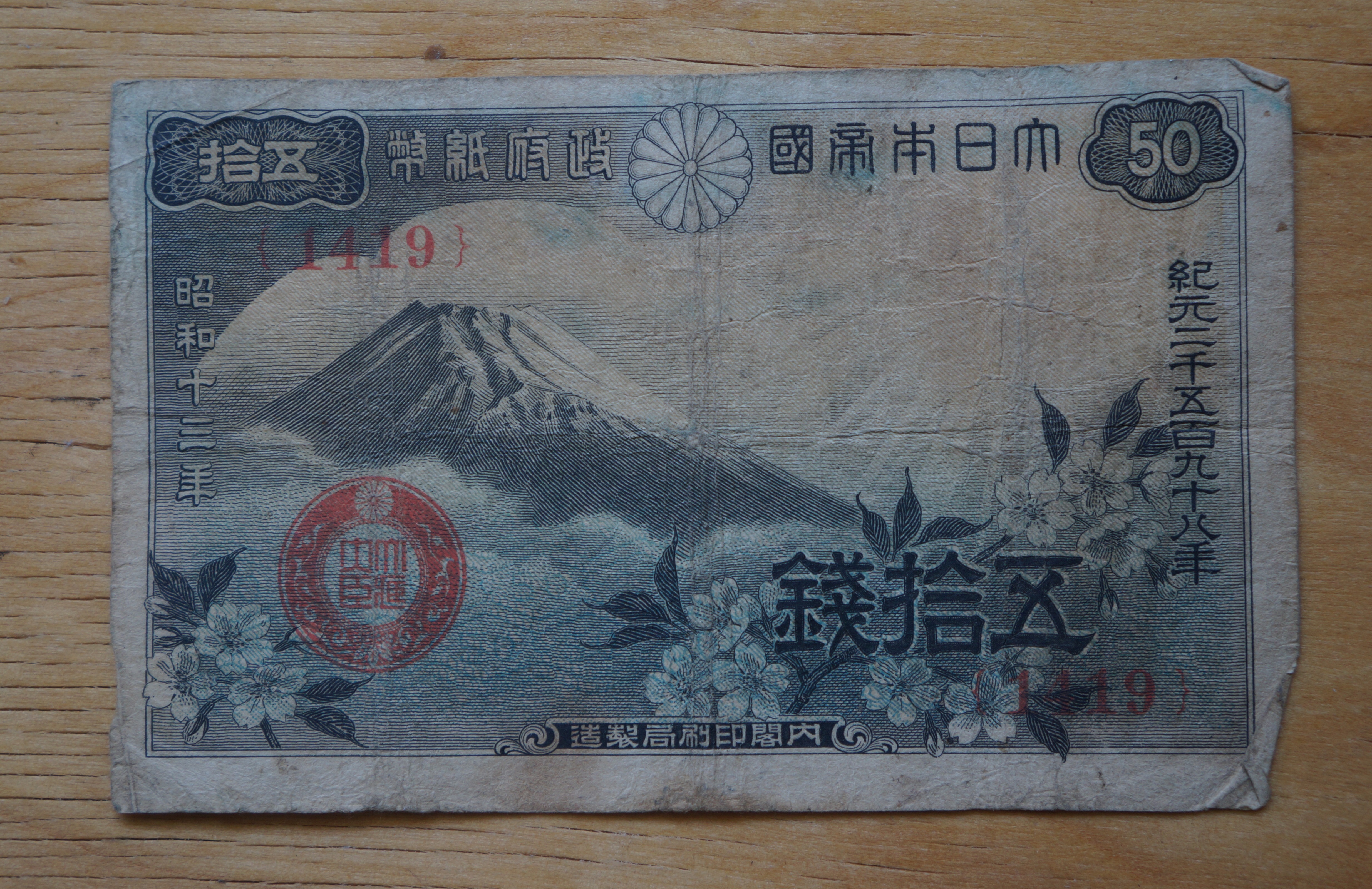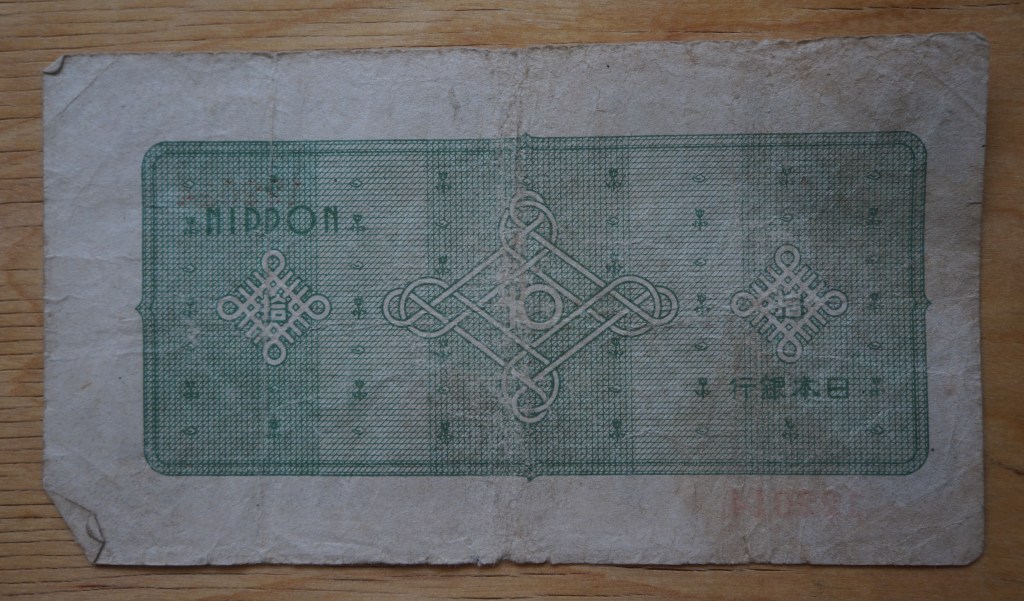 This one was probably for 50 Japanese Yen but what era it’s from I don’t know. Note the Imperial chrysanthemum at top.