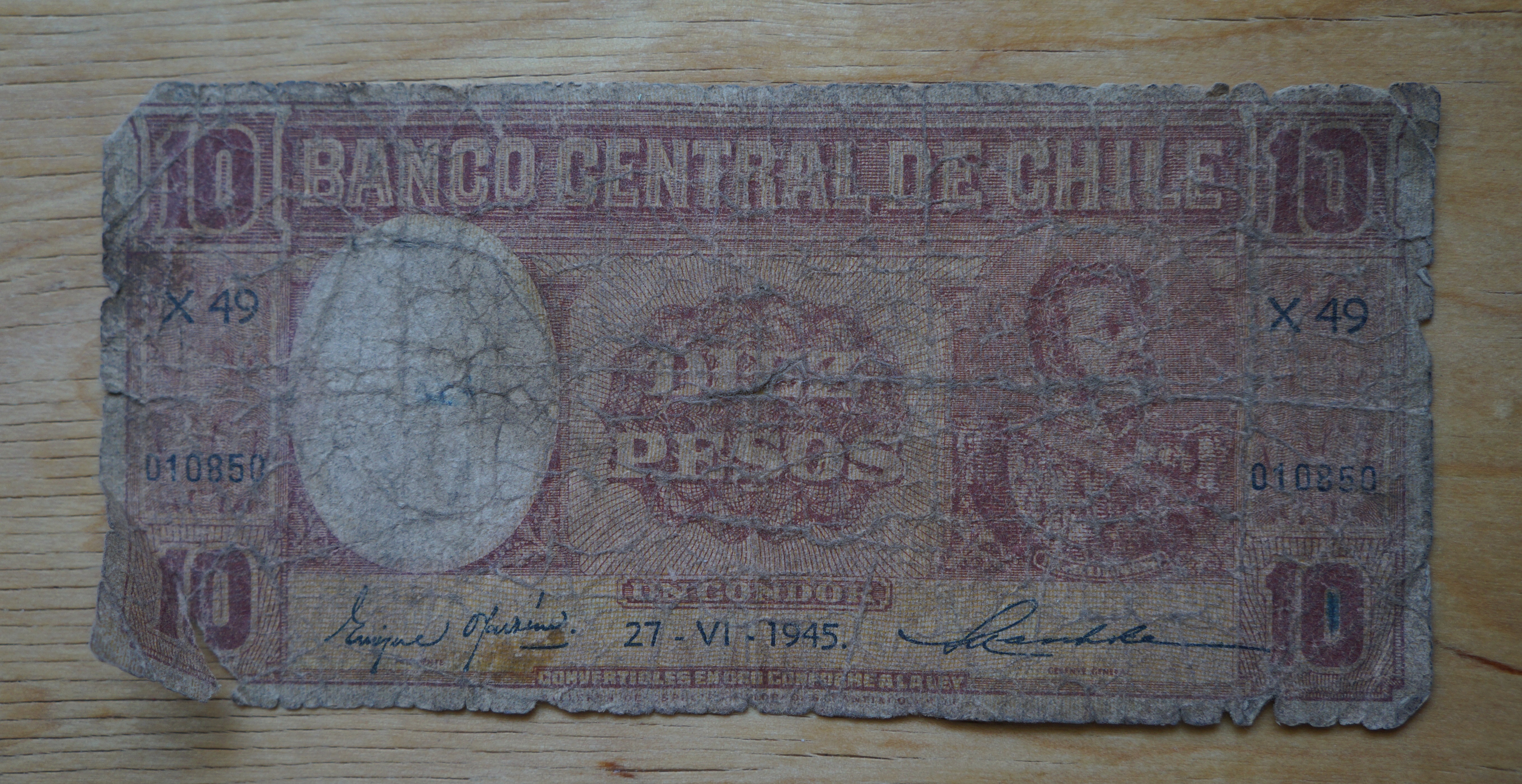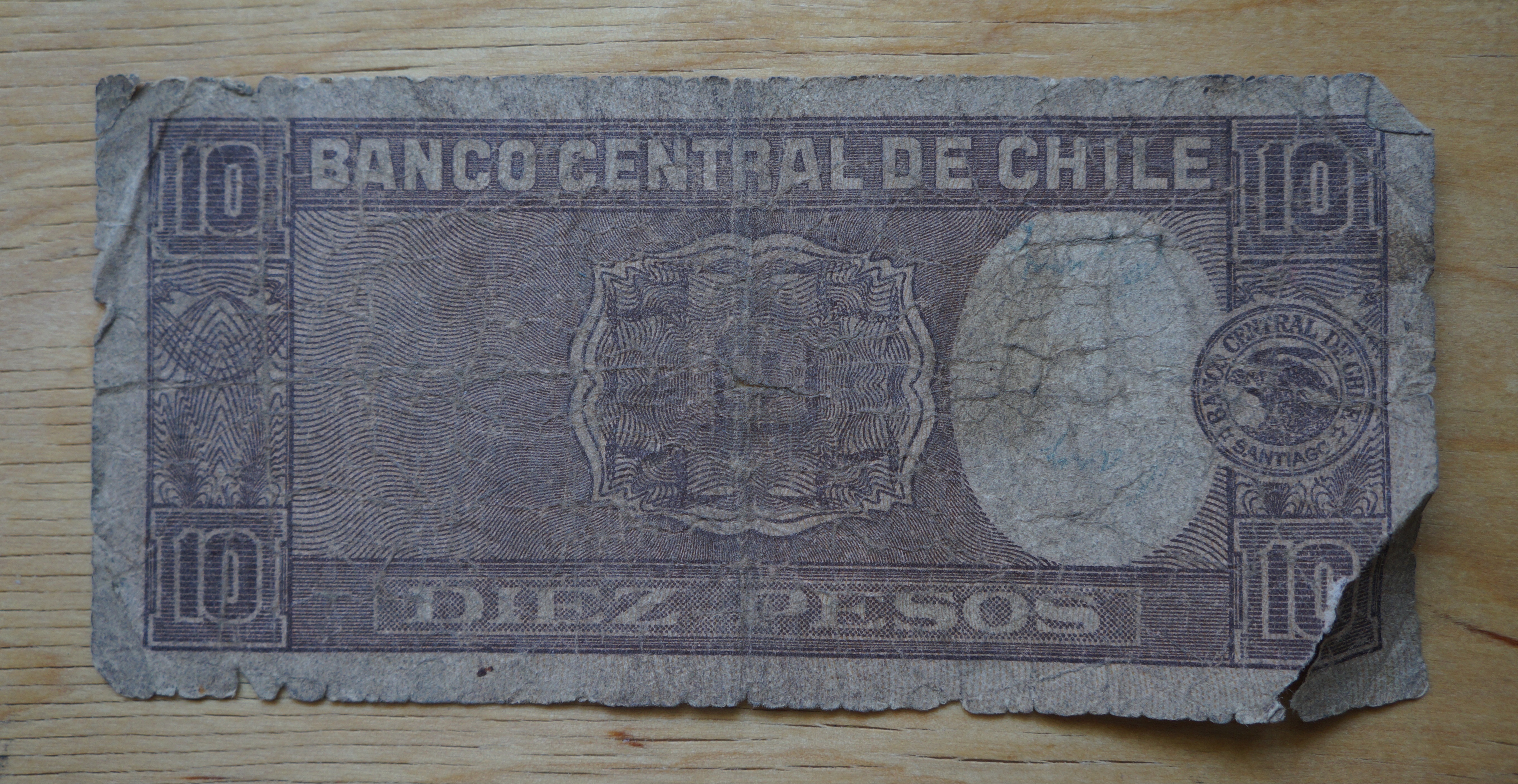 And here a very tatty, well circulated, diez pesos Chilean note.