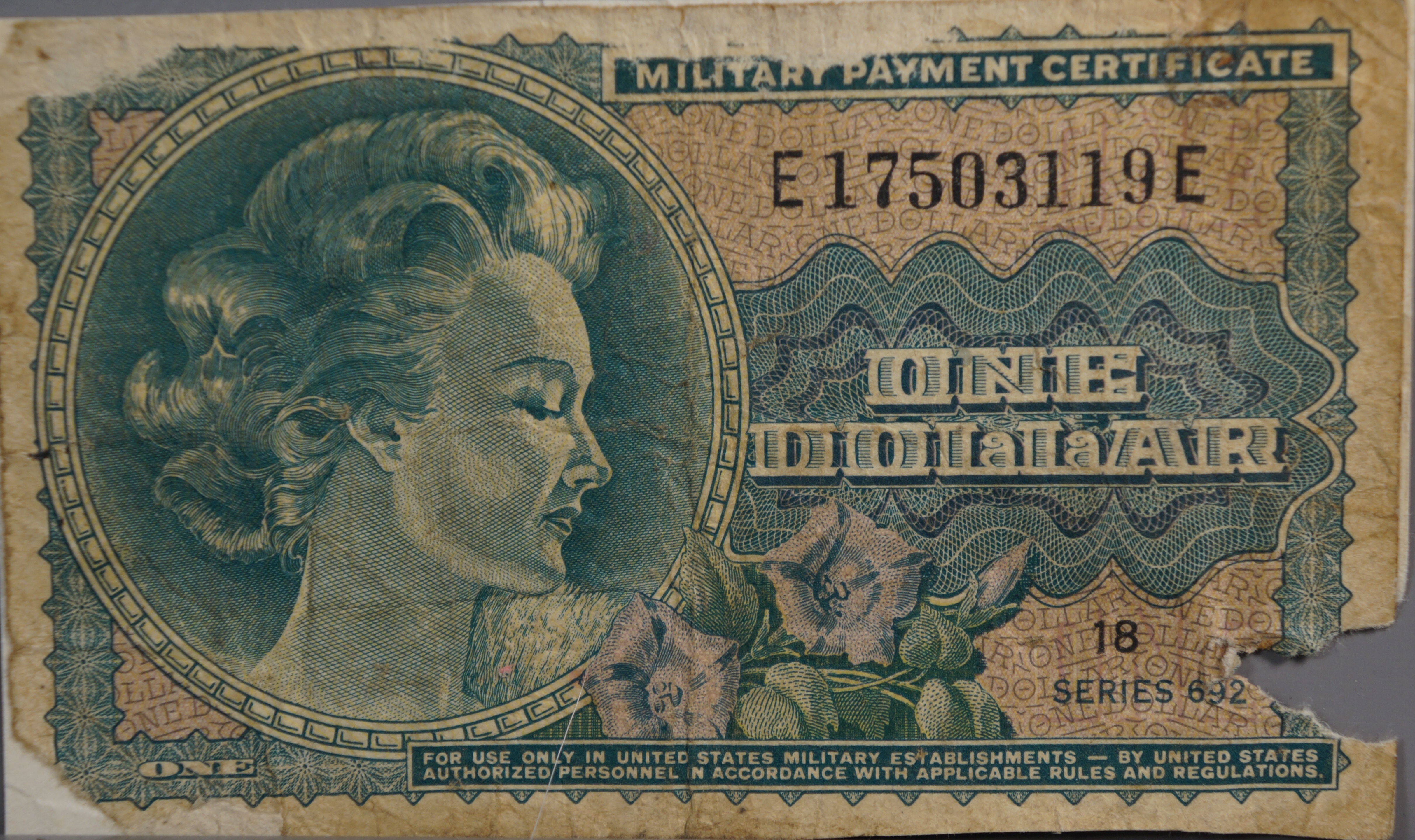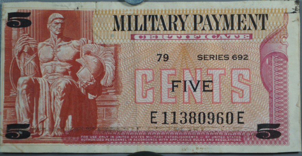 These last two are MPC (Military Payment Certificate) from my Vietnam service in 1970-1971. The military authorities would periodically change the design, then require all the old style currency be exchanged for the new money. This was to combat black marketering but it always failed because the crooks were tipped off well in advance.