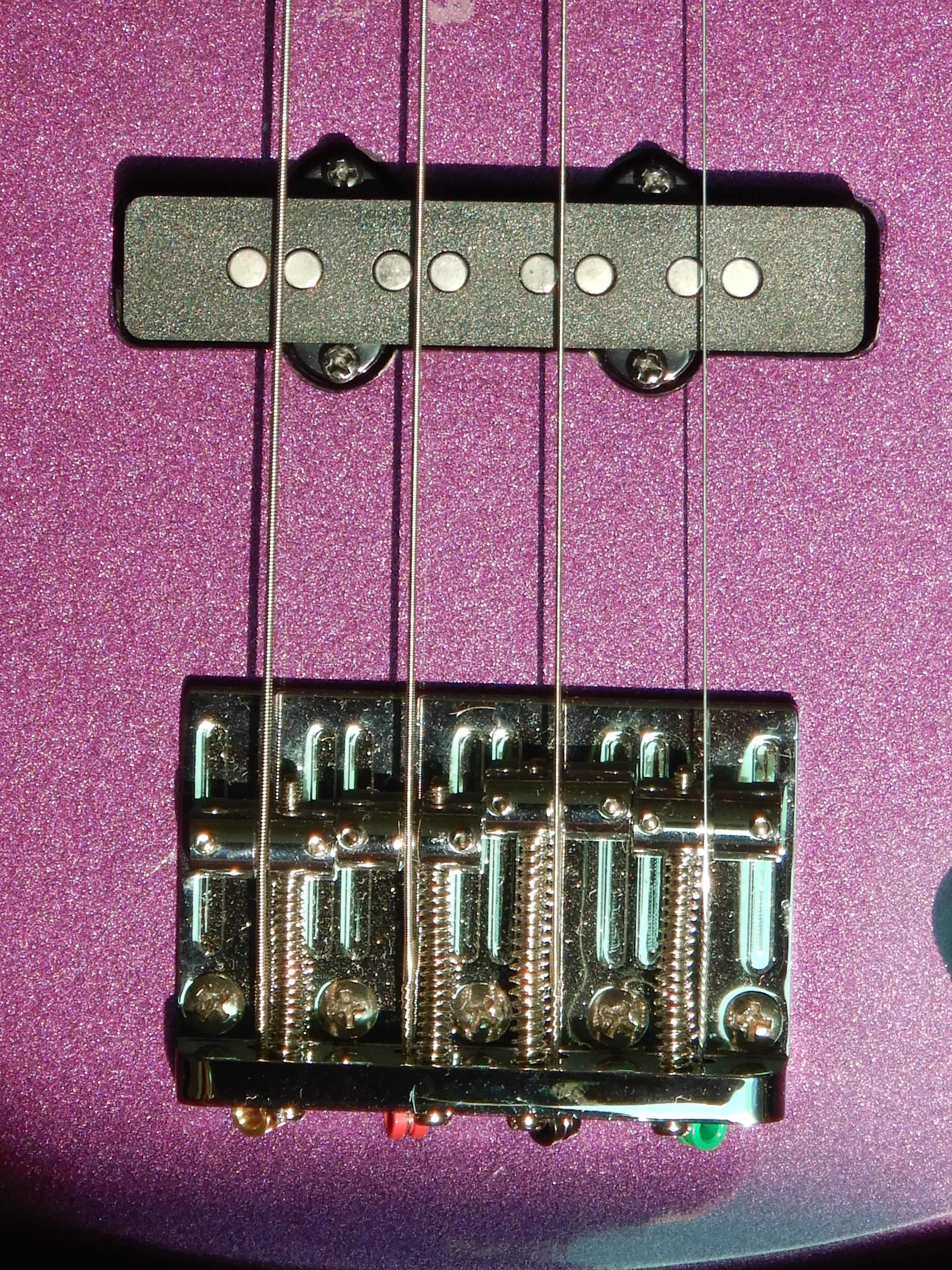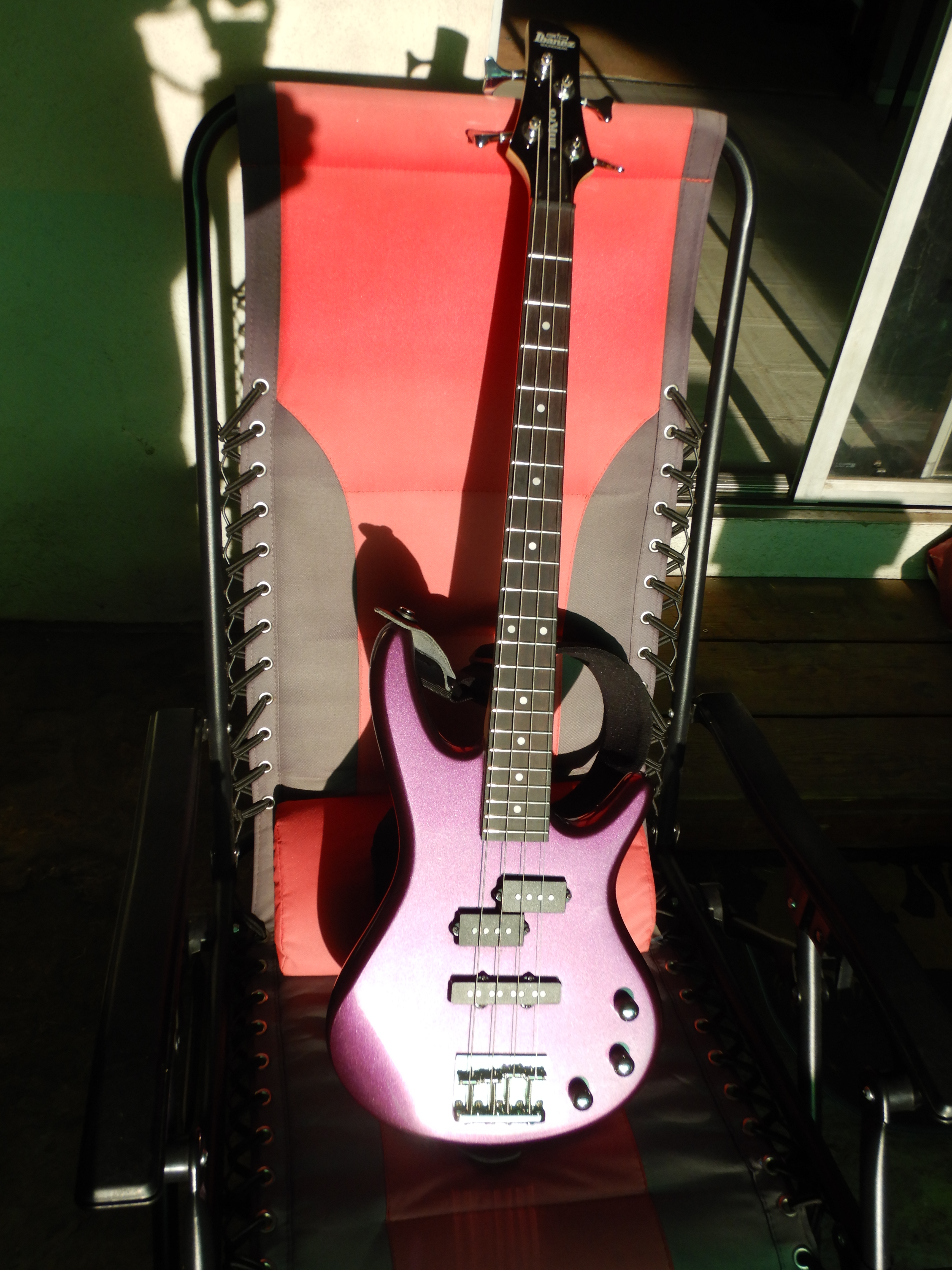 I just swapped in a new bridge and D’Addario roundwound piccolo bass strings on my princely purple, $90, flea market, Ibanez Mikro short-scale bass.
