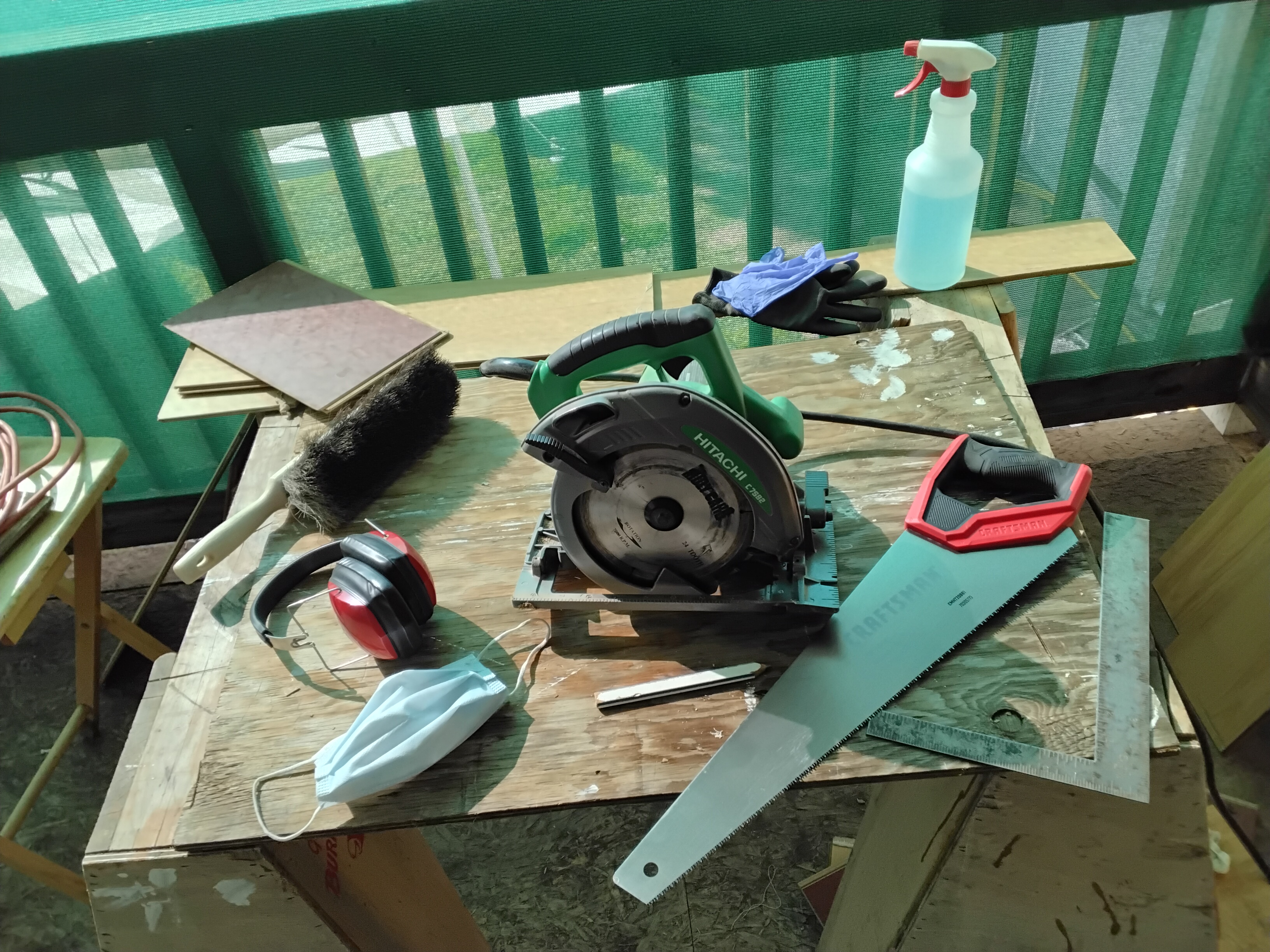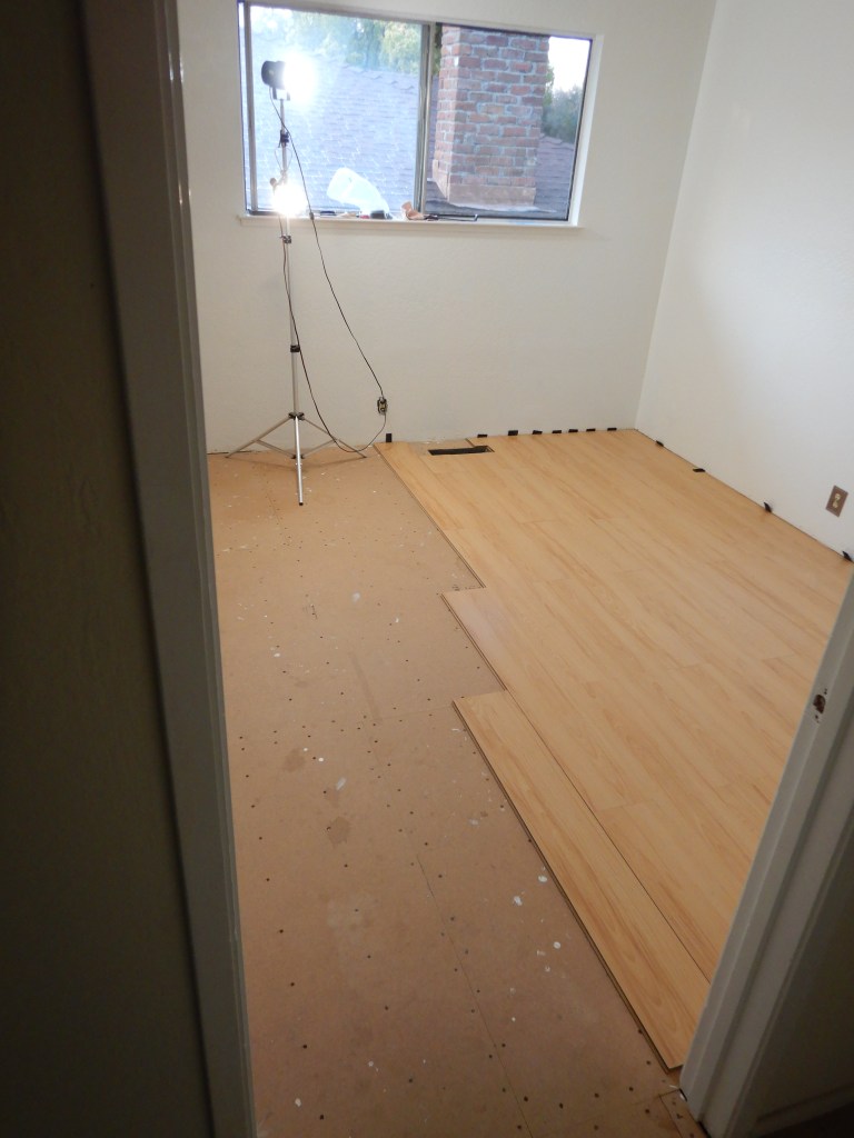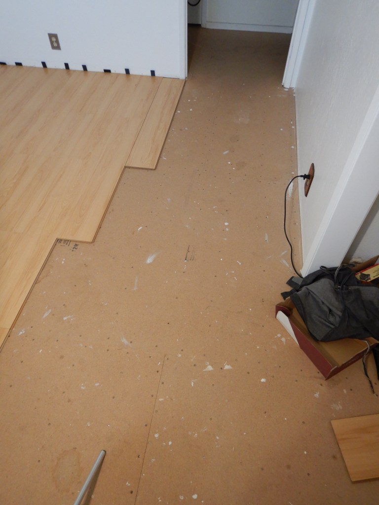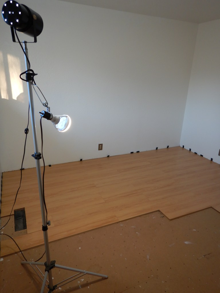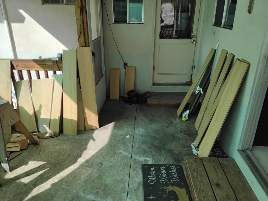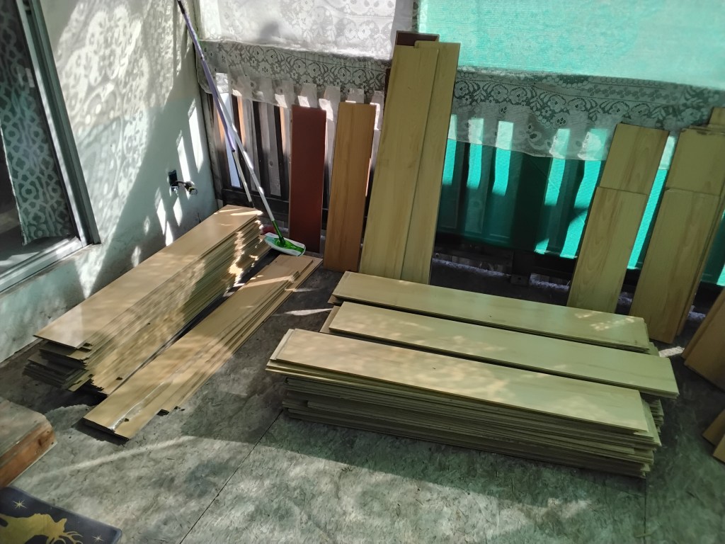 Last year my landlord/buddy scrounged me six big piles of light colored laminate flooring from somewhere and I’ve been storing it on my back porch, covered in an old sheet to discourage dirt.
