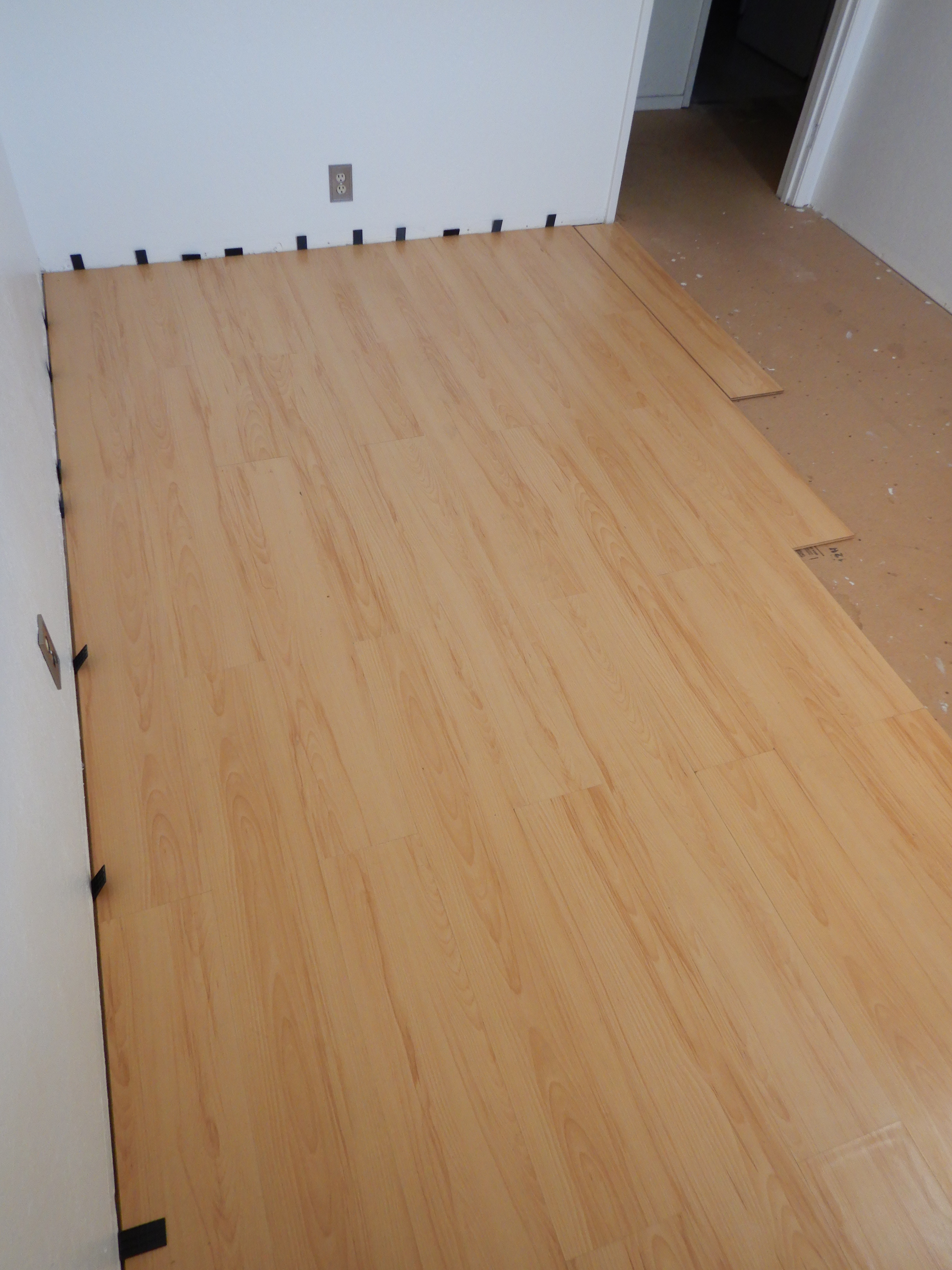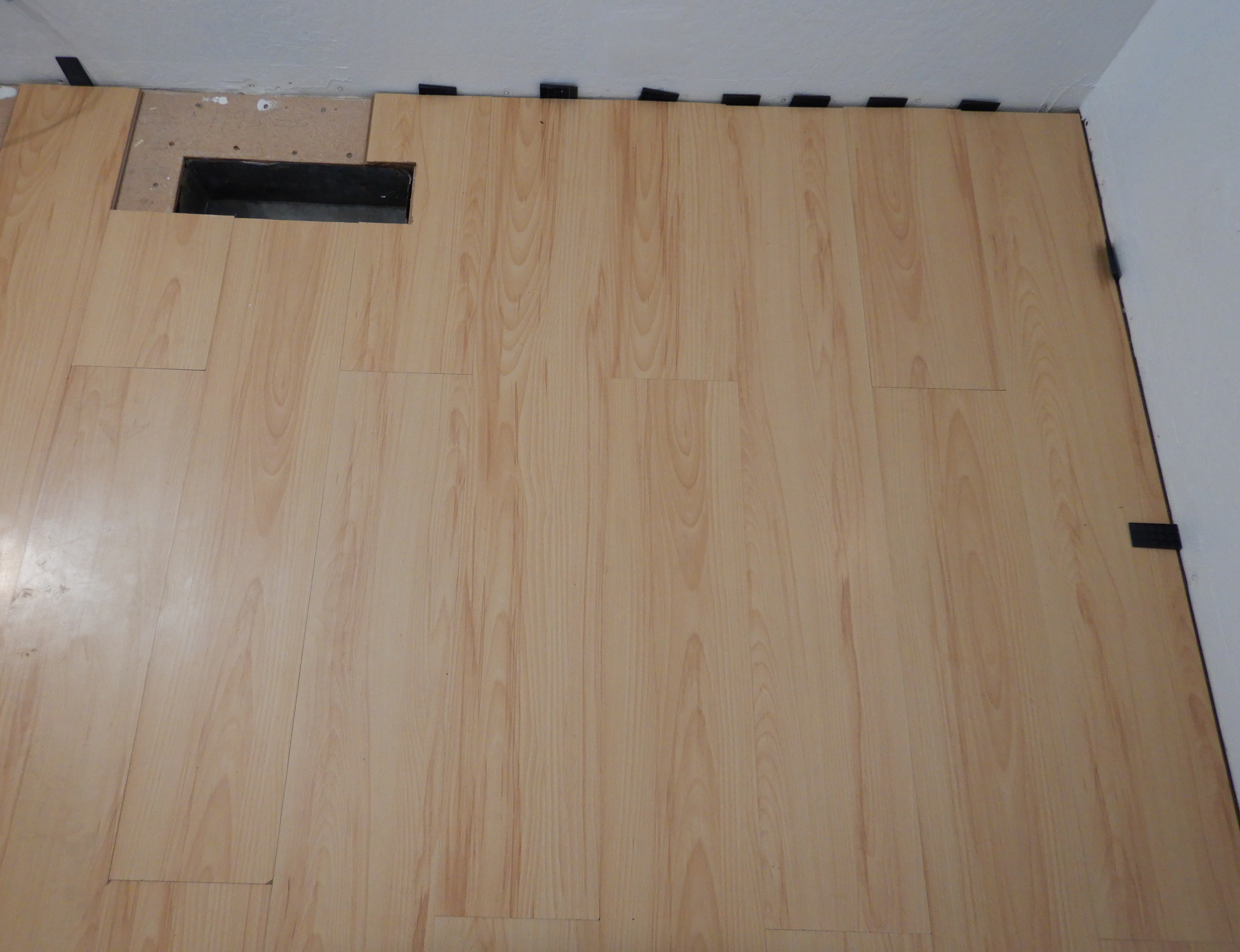 With painting finished I began laying the faux birch (maple?) 8 inch boards using my flooring kit.