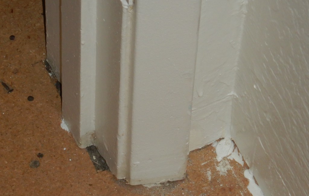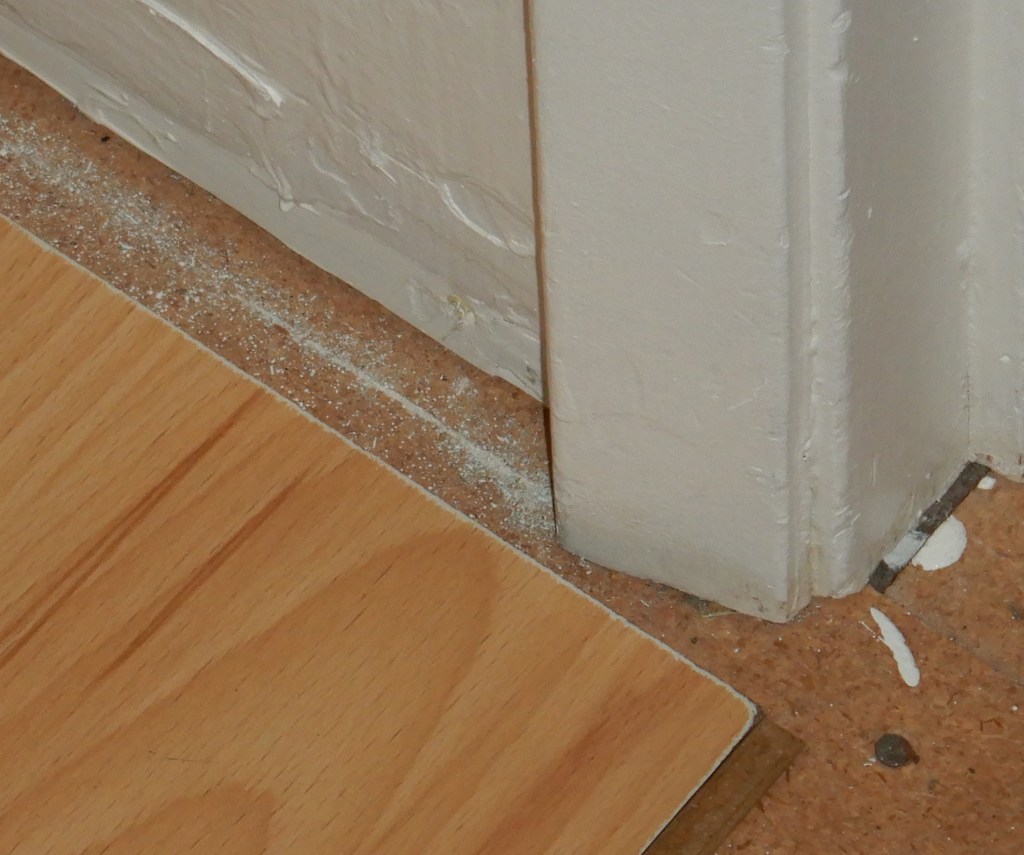 I need to cut the door trim off at the bottom in order to slide the plank under it. Probably use a hacksaw or a coping saw.