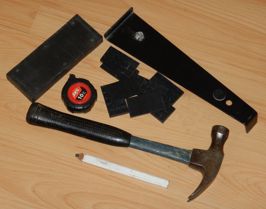 Which consists of a bag of black plastic 1/4 inch spacer wedges, a plastic block for slamming home the boards without destroying them, and a 1 foot long steel transfer tool to slam home the boards when you’re too close to the wall to swing a hammer.