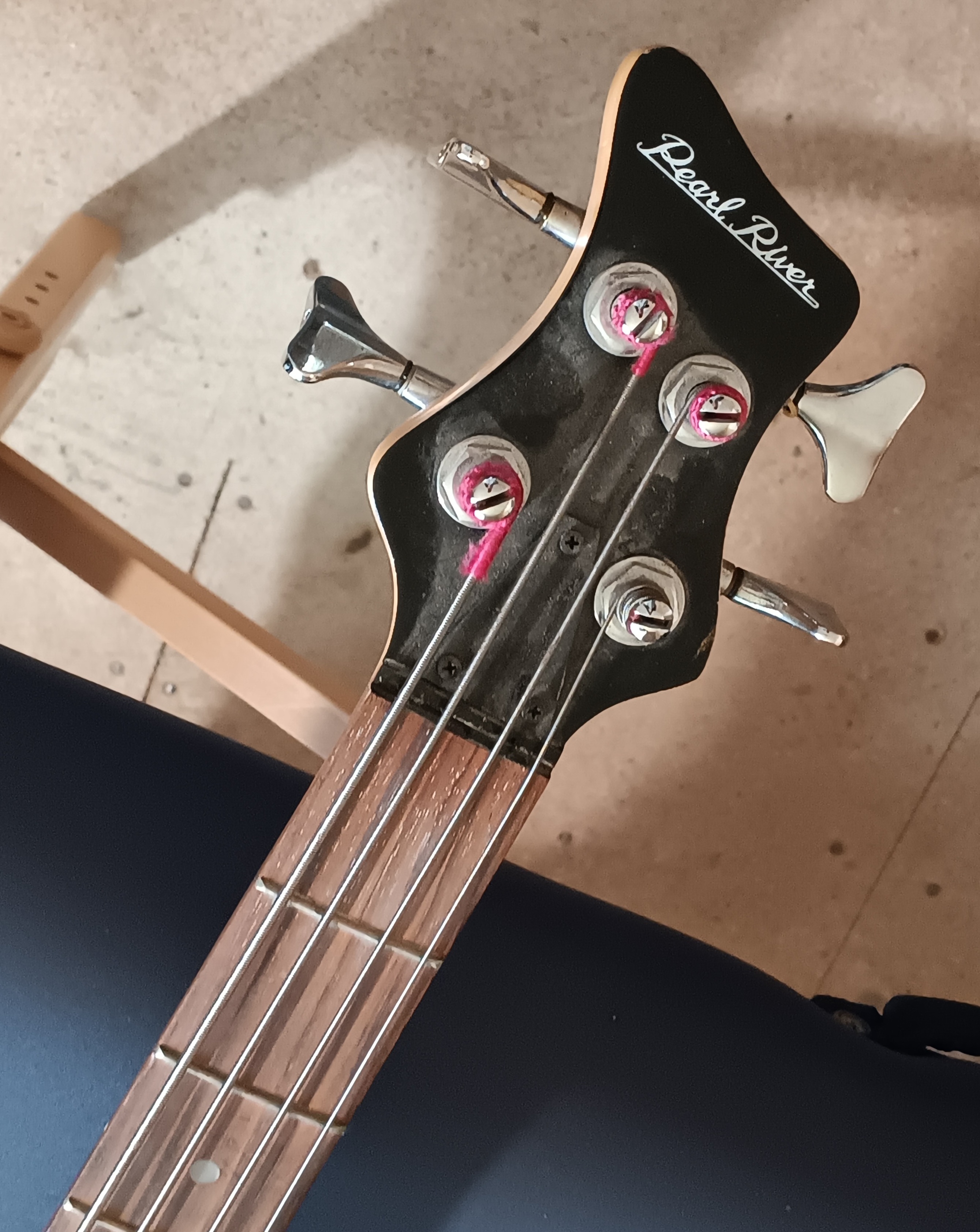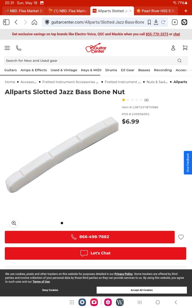 I felt glad I’d bargained him down $5 because walking back to the car I noticed the nut was MIA. Oh, well, I’ve got lots of countertop Corian material so I’ll carve one up out of it. [Ordered a proper bone nut online, $7.]