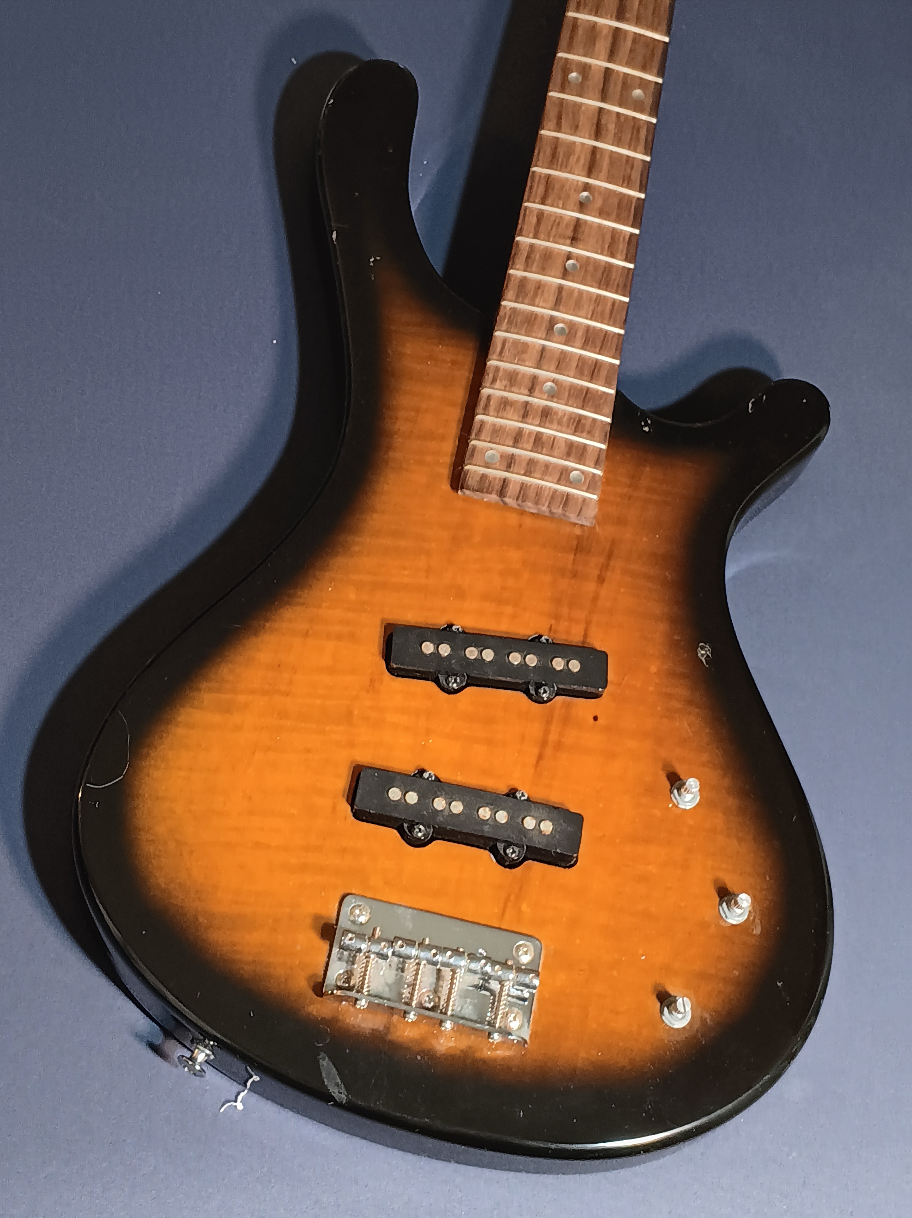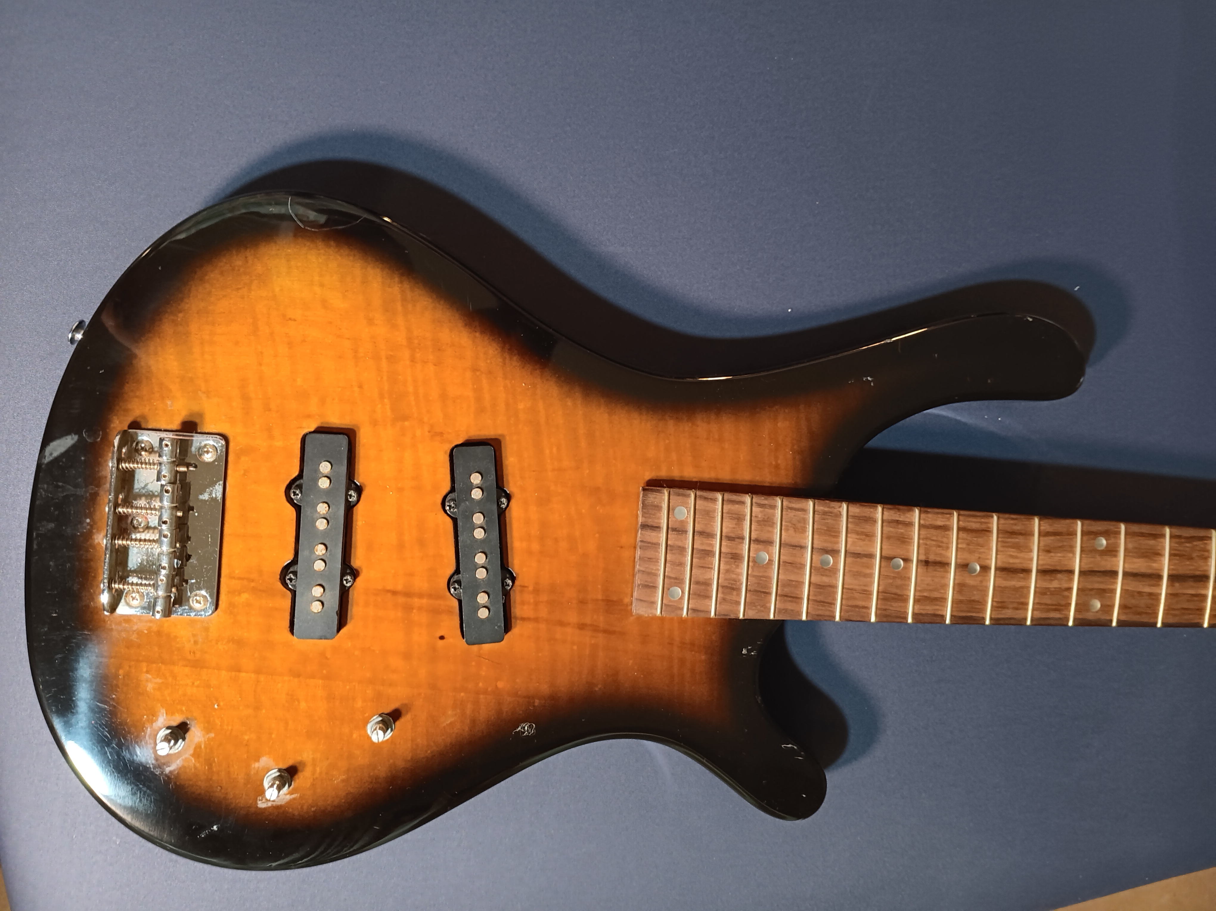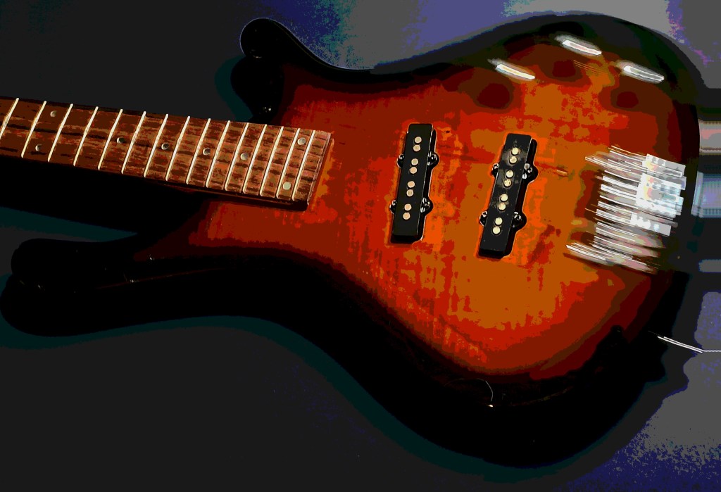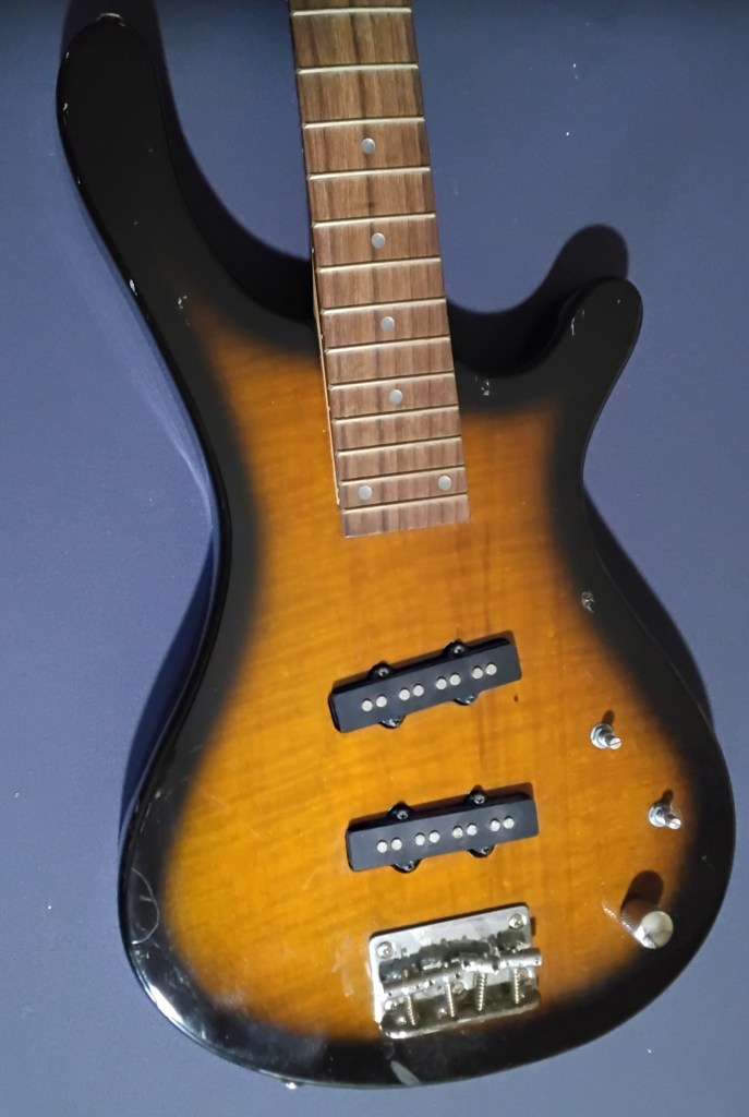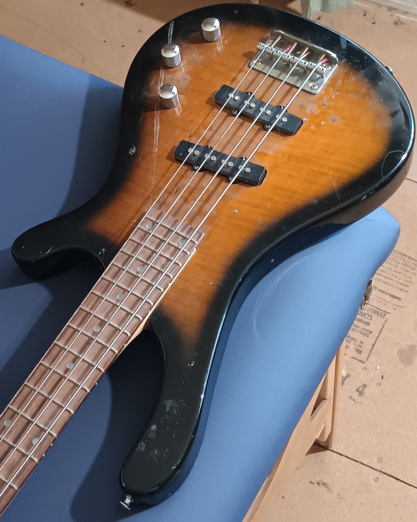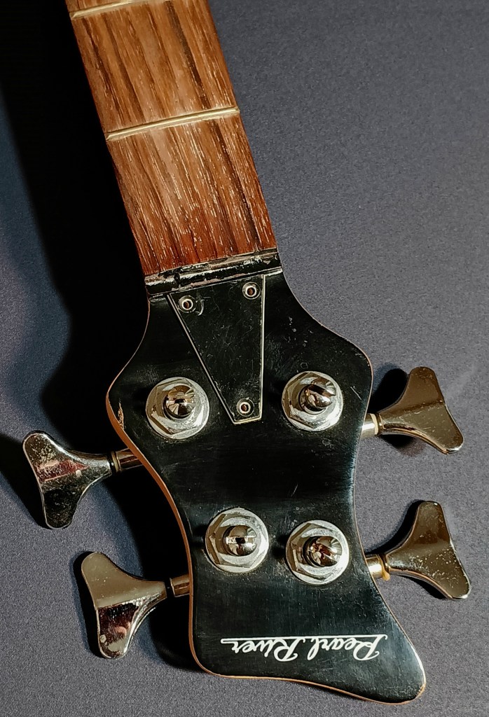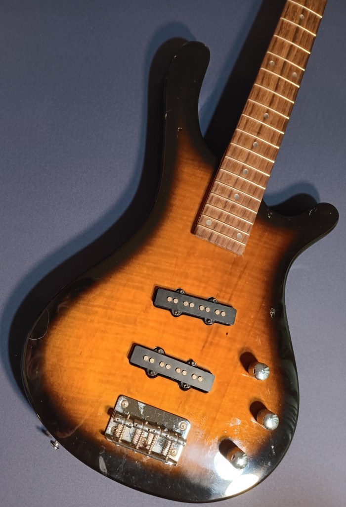 I love the sunburst ‘tobacco burst’ or whatever; the tiny truncated ‘amoeba’ headstock; and the nice sized slabby body. I’ve never owned a traditional burst color bass before.